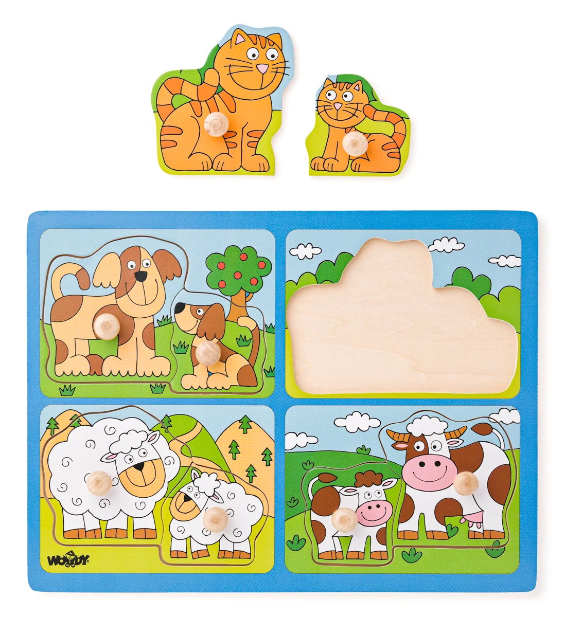 VícePuzzle z dílny českých návrhářů je určeno pro nejmenší děti. Jeden díl puzzle tvoří mládě a druhý dospělý. Úkolem dítěte je logicky a podle tvaru přiřadit zvířátka k sobě. Puzzle je vybaveno úchyty pro snadnější úchop. | Věk: 2+ | Rozměr: 29,5 x 22 cm