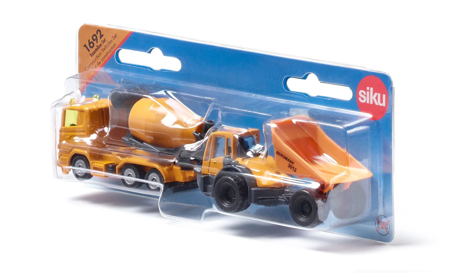 Siku sada modelů – stavební stroje. Obě vozidla mají dvounápravový plastový podvozek s volnoběžnými koly a kovovou kabinou řidiče. Na staveništi panuje velký ruch. Sklápěcí vůz vykládá zeminu ze své velké korby. Míchačka na beton s velkým otočným bubnem je již ve vypouštěcí poloze. Rozměry balení: 7,8 x 19,7 x 3,2 cm. Věk: 3+