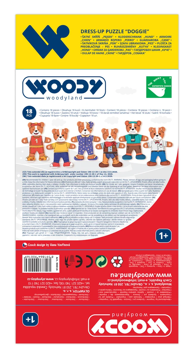 Děti zde mají možnost si dle vlastní fantazie oblékat a měnit postavičku pejska. Mají k dispozici obličeje znázorňující různé nálady, tělíčka a nožičky pejska s různými outfity. Rozvíjí fantaziii schopnost logického myšlení. Obsahuje: 18 dílků. Baleno v praktické dřevěné krabičce. Rozměr: 13 x 14 x 4 cm. Věk: 1+| Toto autorské dílo je registrováno u Art&Copyright pod číslem 196-12-20-1 ze dne 14.5.2020.