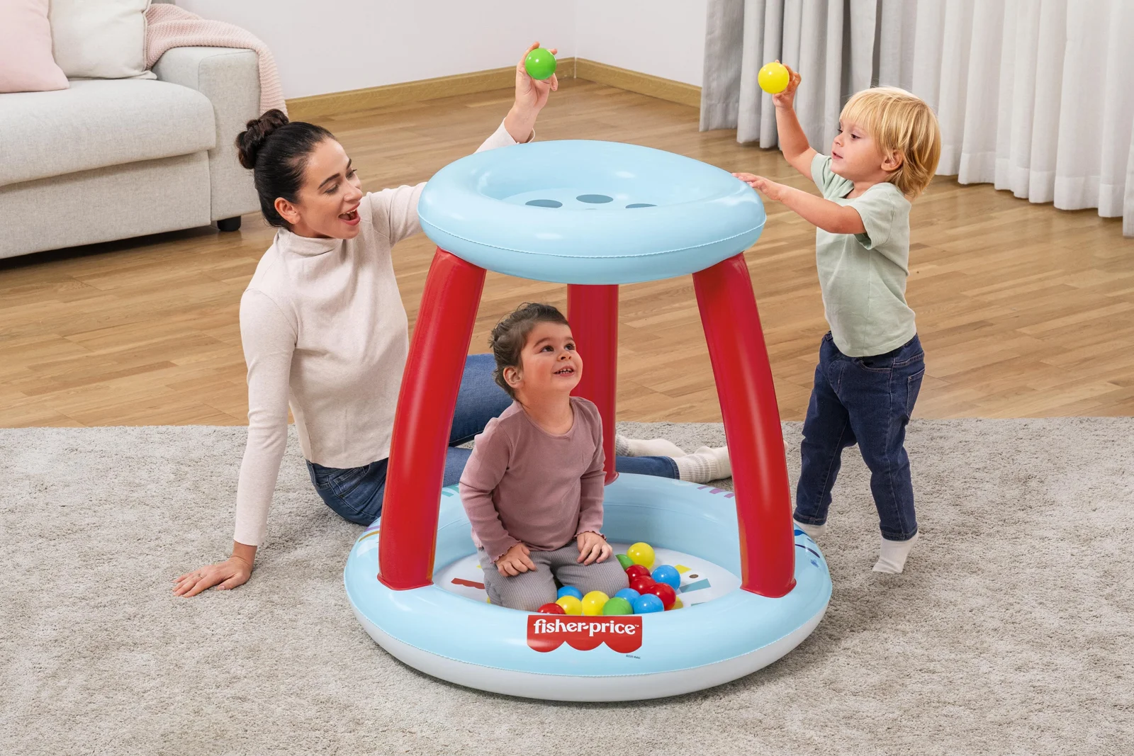 VíceDětské nafukovací herní centrum s míčky Fisher-Price® Lil' Sunshine promění každý dětský pokoj v barevné herní dobrodružství. Roztomilý motiv se sluníčkem a veselé barvy podněcují dětskou fantazii a vytvářejí ideální prostor pro zábavu i objevování. Bazének je vhodný pro děti od 2 let a součástí balení je 15 hracích míčků. Interaktivní otvory pro vhazování míčků vybízí děti k jejich vkládání, čímž hravou formou rozvíjí jemnou motoriku a koordinaci ruka–oko. Vyrobeno z odolného PVC materiálu. Bezpečnostní ventily umožňují rychlé nafouknutí a udržují vzduch spolehlivě uvnitř. Součástí balení je také opravná záplata pro případ drobného poškození. Díky kompaktním rozměrům se bazének snadno vejde do dětského pokoje nebo obývacího prostoru a během chvilky vytvoří malé domácí herní království plné radosti a pohybu. Rozměry po nafouknutí: Ø 89 x 84 cm. Rozměry po vyfouknutí: Ø 95 cm. Používejte pouze pod dohledem dospělé osoby. Rozměry balení: 30 x 33 x 7 cm. Věk: 2+