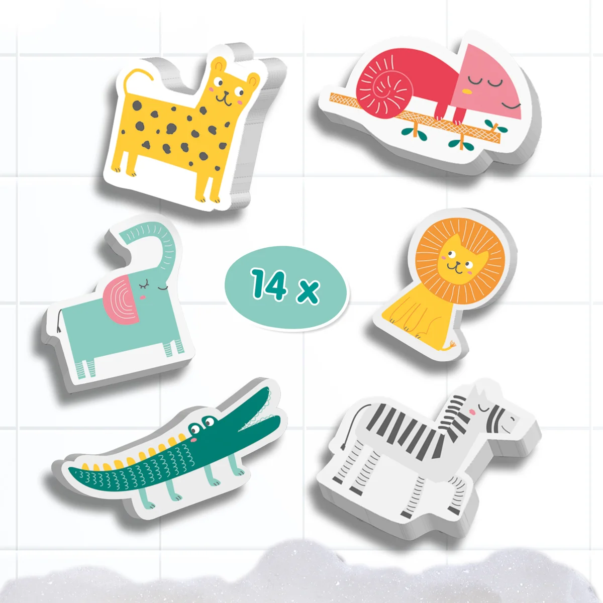 Děti milují koupání ve vaně. Vydejte se na cestu do safari a vytvořte si svůj vlastní příběh se všemi 14 zvířátky. Pěnové vodolepky v podobě různých zvířátek lze snadno připevnit na mokré povrchy a stejně snadno je zase odejmout. Podporuje dětskou představivost a rozvoj jemné motoriky. Sada obsahuje: 14 pěnových zvířátek. Baleno v krabičce. Rozměry balení: 20 x 20 x 4 cm. Věk: 12 m+