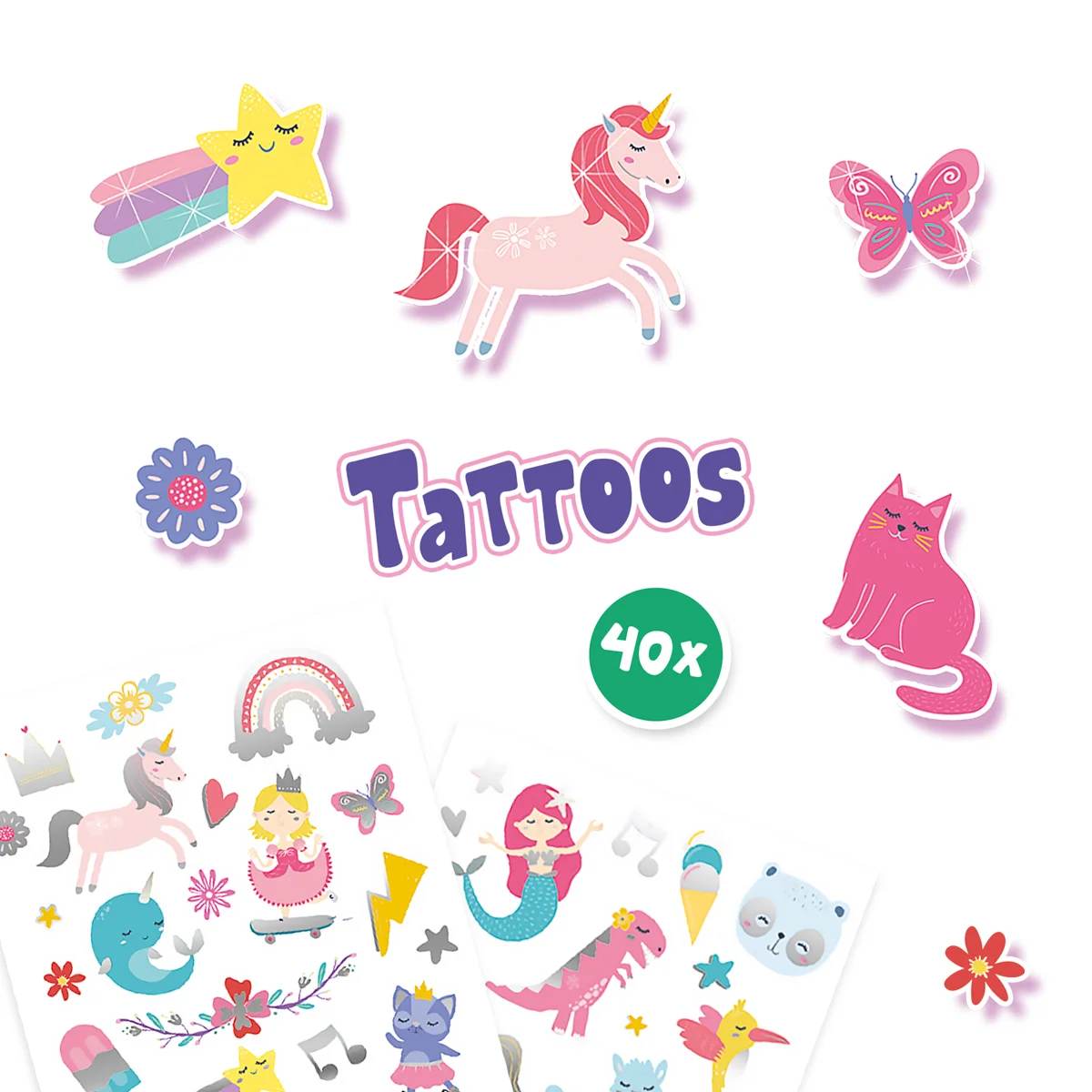 Úžasná tetování s metalickým efektem rozzáří dětem den. Vyberou si odvážnou princeznu na skateboardu, nebo si na ruku nalepí krásného jednorožce? Sada obsahuje 40 veselých a roztomilých motivů. Tetování se snadno nanáší a stejně jednoduše se smývá z pokožky. Pohádkové téma s vtipnými ilustracemi. Kosmeticky testováno. Rozměry balení: 20 x 15 x 0,5 cm. Věk: 3+