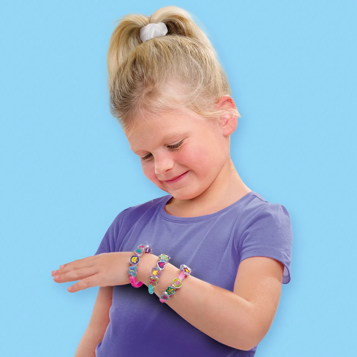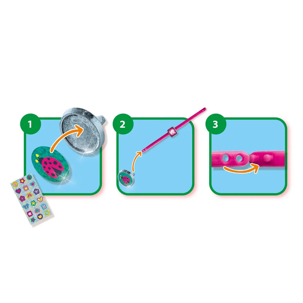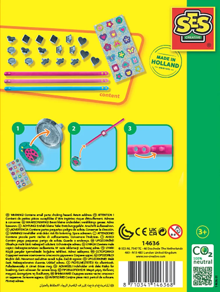 Se sadou SES Creative na výrobu náramků s přívěsky si děti mohou navrhnout vlastní barevné a jedinečné šperky. Vyrobit si vlastní šperky nemusí být složité. Stačí na ozdoby nalepit lesklé třpytivé nálepky a nasunout je na jeden z plastových náramků. Kombinujte a spojujte své vlastní výtvory, odstraňte je a vytvořte opět něco nového. Podporuje kreativitu a jemnou motoriku. Obsah sady: 3 barevné plastové náramky, 18 přívěsků, třpytivé samolepky. Baleno v krabičce. Rozměry balení: 20 x 15 x 4 cm. Věk: 3+