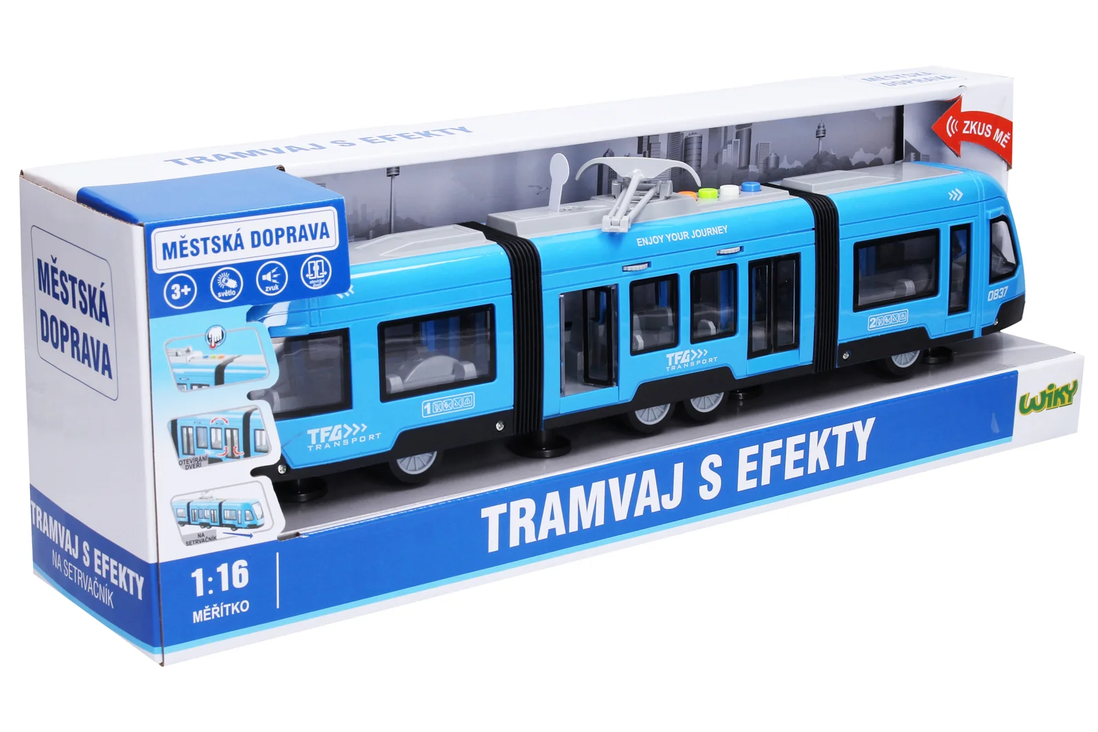 Tramvaj v měřítku 1:16 potěší každého malého milovníka MHD. Je vybavena světelnými a zvukovými efekty, které se aktivují čtyřmi tlačítky na střeše. Tramvaj jezdí na setrvačník. Baterie: 3 x AG13, jsou součástí balení. Rozměry tramvaje: 9 x 44 x 5,8 cm. Rozměry balení: 16,5 x 48 x 11 cm. Věk: 3+