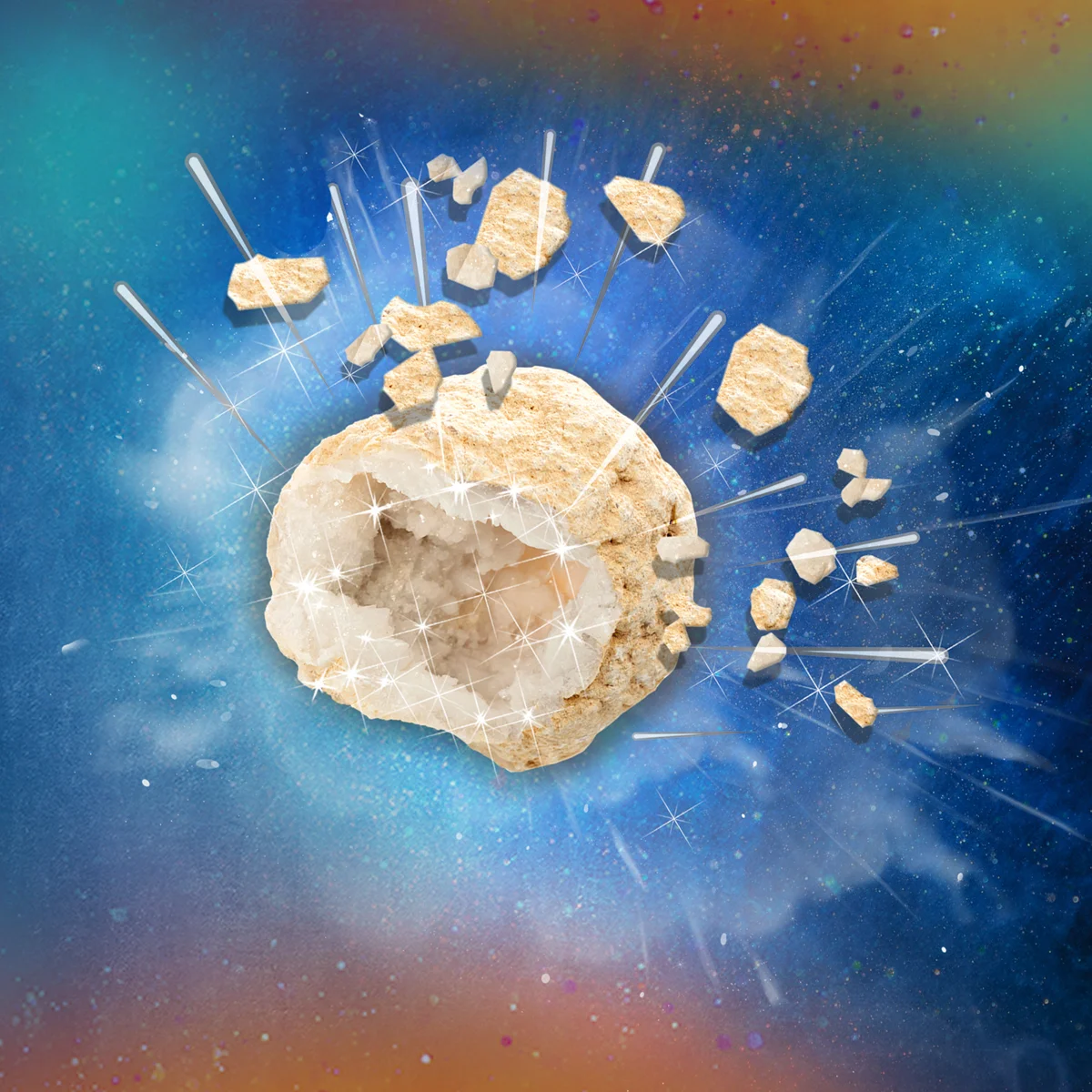 EXPLORE – rozbíjení krystalických hornin. Objevte skutečné geody a odhalte jejich krystalický vnitřek. Tato vzdělávací sada je ideální pro děti, které zajímá příroda a chtějí objevovat, co se skrývá v zemi. Postupujte podle pokynů, rozbijte geody a podívejte se na nádherné krystaly, které se skrývají uvnitř. Geody jsou skutečné přírodní kameny, takže každý objev je jedinečný. Obsah sady: 3 geodové kameny, sáček a návod. Kladivo není součástí sady. Baleno v krabičce. Rozměry balení: 20 x 15 x 6 cm. Nevhodné pro děti do 3 let. Věk: 8+