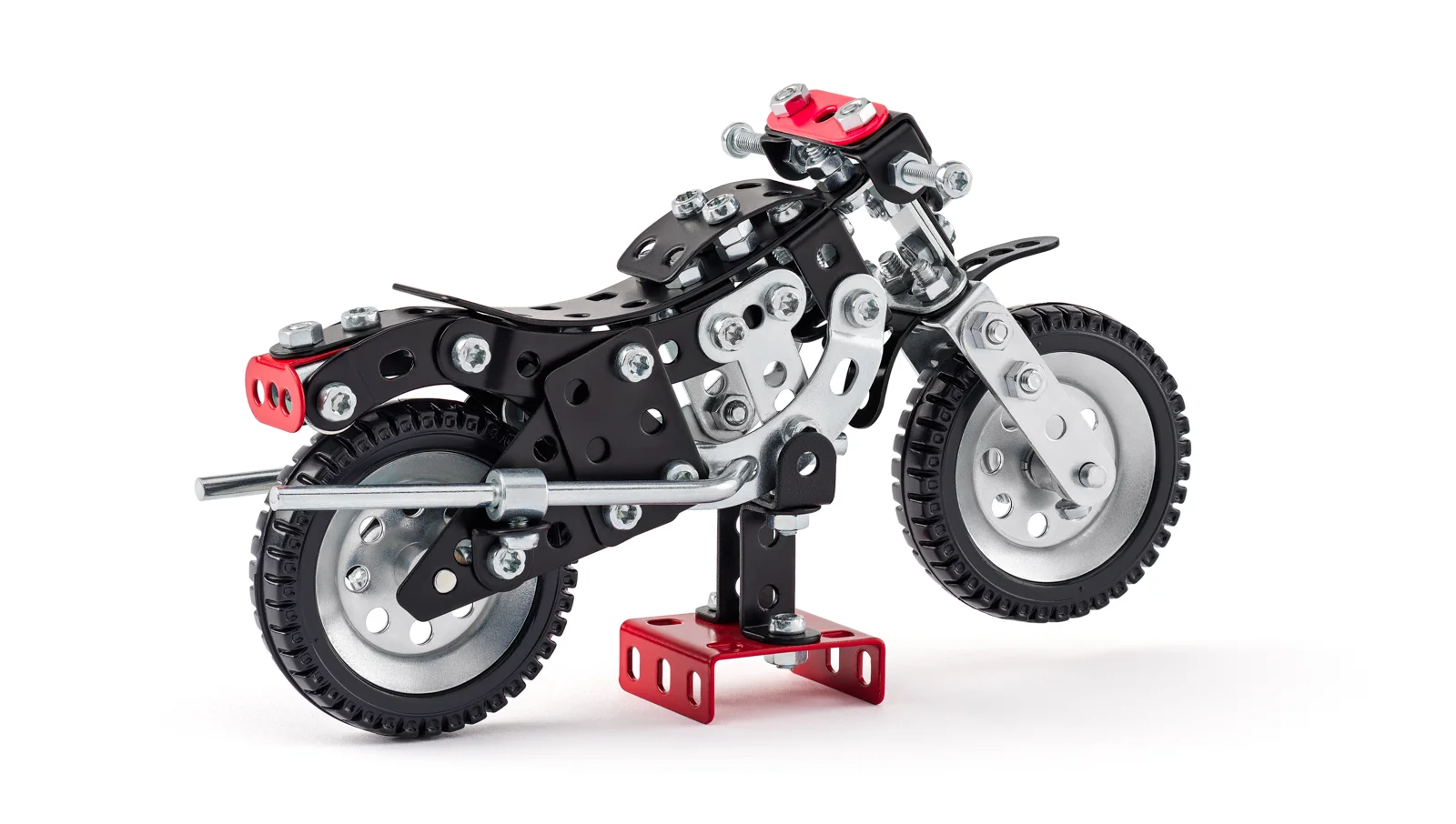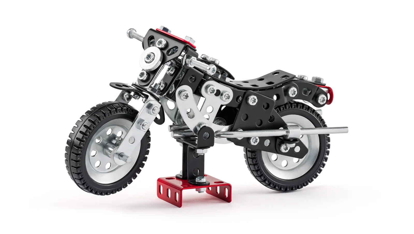 S kovovou stavebnicí Merkur se můžeš i Ty na chvíli stát motorkářem, a sestavit si model motorky. Pohyblivá kola, elegantní červené provedení. Díky pohyblivým řídítkům, je možné zatáček doleva a doprava. Praktický stojánek, na který je možné motorku odložit. Se sestaveným modelem si lze hrát, je velmi odolný. V balení najdete podrobný návod. Merkur díly jsou univerzální, a tak vás neomezí v jakékoli modifikaci a nápadu. Stavebnici tak můžete sestavit podle přiloženého návodu nebo čistě podle svých představ. Se sestavenými modely si lze hrát, jsou velmi odolné Podporuje rozvoj manuálních dovedností, logického myšlení a soustředění. Počet dílků: 173. Úroveň Merkur obtížnosti: 3. Baleno v krabičce. Rozměry modelu: 9,5 x 16,5 x 7 cm. Rozměry balení: 18 x 26,2 x 5,5cm. Věk: 5+