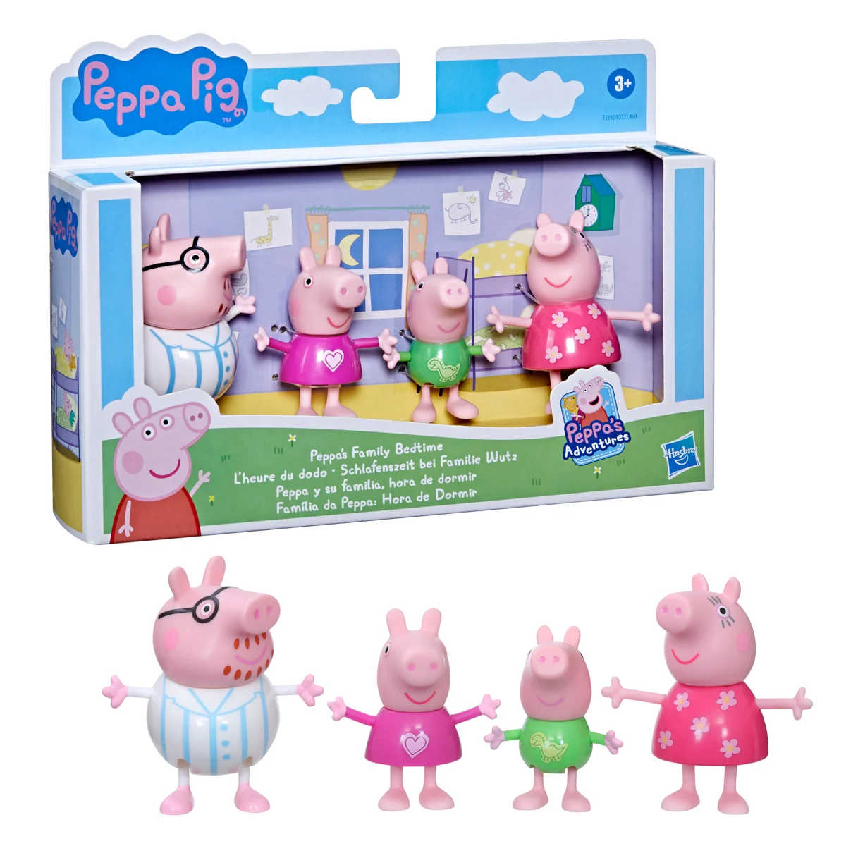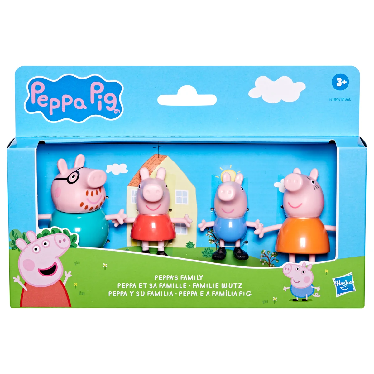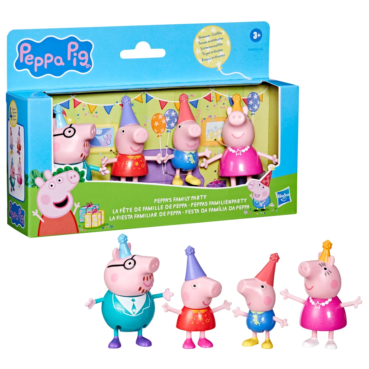 Sada figurek – Prasátko Peppa a jeho rodina. Děti si mohou přehrávat scény ze seriálu nebo vymýšlet nová vlastní dobrodružství se 4 pózujícími figurkami. Tato sada figurek je úžasnou hračkou pro děti, které milují tento seriál. Kolekce 3 druhů. Assort je náhodný mix modelů. Výběr nelze ovlivnit. Každé balení obsahuje 8 cm vysoké figurky maminky, tatínka, Peppy a Toma. Kolekce 3 témat obsahuje sady – Klasická sada, Deštivý den, Čas jít spát nebo Rodinná oslava. Rozměry balení: 25 x 24 x 11 cm. Věk: 3+