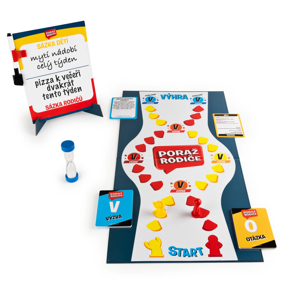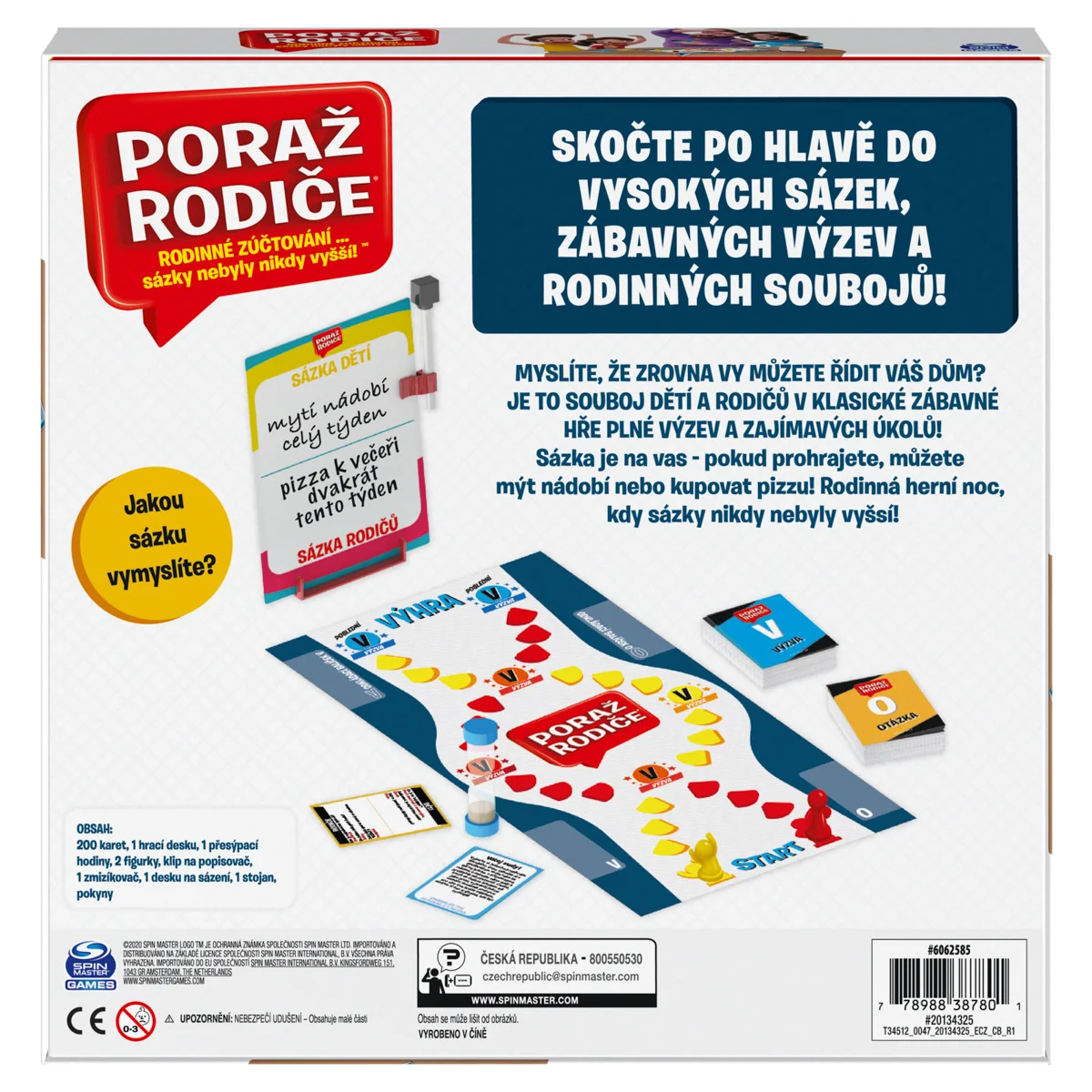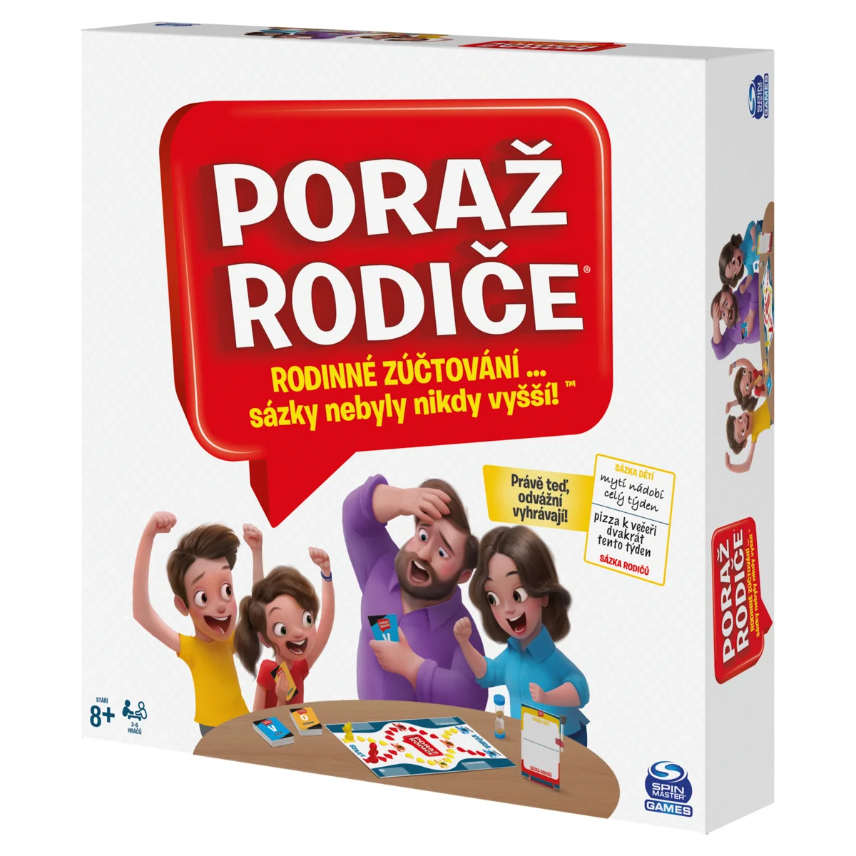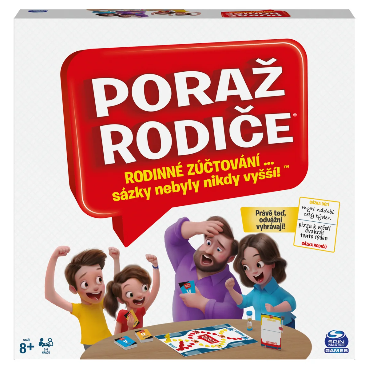Rodinná hra, kde děti soupeří s rodiči. Řeší otázky a úkoly, ale před začátkem každý tým musí dát něco v sázku a tu zapsat na tabuli. Rozměr balení: 27x27x5,4 cm. Věk 6+