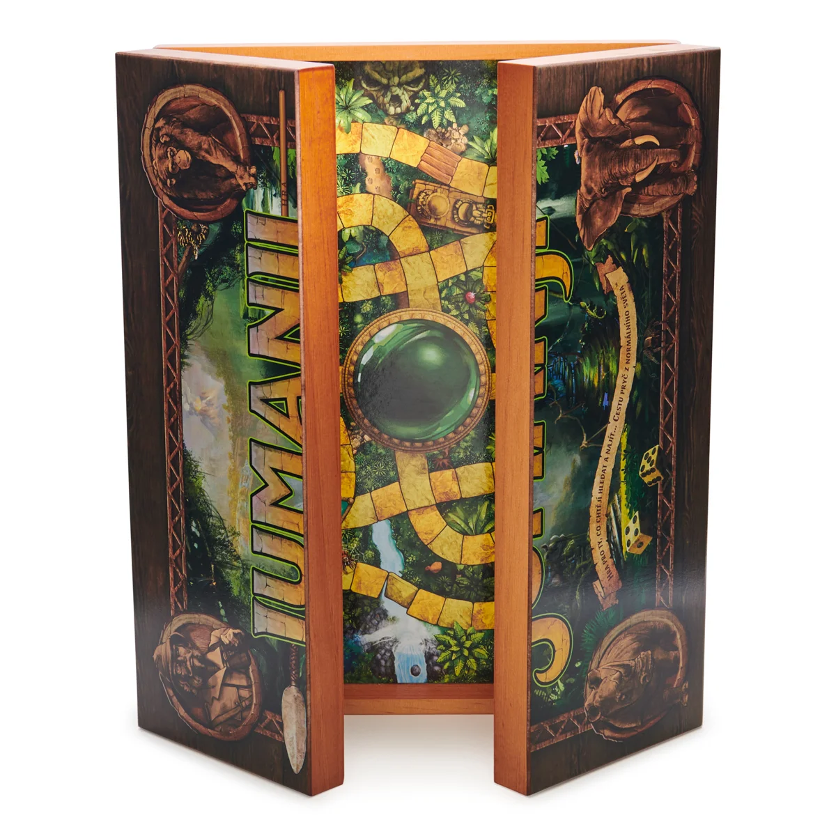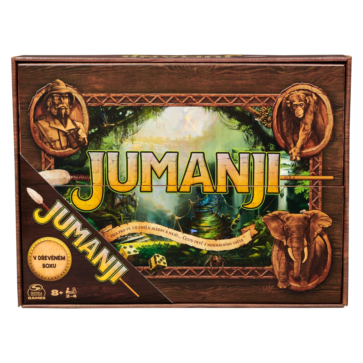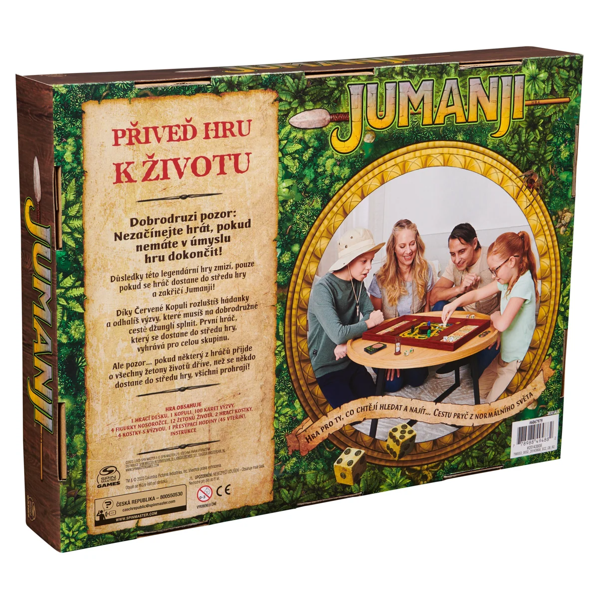 Stopující lvi. Dusající nosorožci. Chňapající krokodýli. V divokém světě Jumanji vás od nich všech dělí jen jediný hod kostkou. Vezměte figurku, hoďte osmistěnnou kostkou a procházejte džunglí. Otočte kartu s nebezpečím. Pomocí dekodéru odhalte tajnou zprávu a zjistěte, zda nedojde ke katastrofě. Vaši spoluhráči musí závodit s časem, aby vás zachránili. Džungle postupně začíná zaplňovat mřížku zkázy. Pokud se mřížka zaplní, džungle vás přemohla a vy i vaši spoluhráči jste prohráli. Pokud jste první, kdo se dostane doprostřed, než se mřížka zaplní, zakřičte „Jumanji!“ a vyhráváte! Rozměr balení: 38,4x29x5,7. Věk 8+