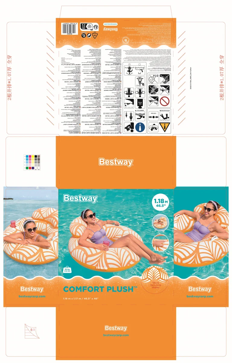VíceBestway® Nafukovací kruh s opěrkou hlavy Comfort Plush Deluxe™. Luxusní a sametový povrch. Vyrobený z velmi kvalitního a odolného PVC velurového materiálu a disponuje průměrem 118 cm. Kruh Bestway je vybaven opěradlem, odolnými madly a prostorem na láhev nebo plechovku s vaším oblíbeným pitím. Barva materiálu se po vložení do vody rozjasní a zesílí. Včetně opravné záplaty. Nafouknutá velikost kruhu: Ø 104 x 48 cm. Nenafouknutá velikost kruhu: Ø 118. Rozměry balení: 24 x 24 x 11 cm. Určeno pro 1 osobu. Maximální nosnost: 90 kg. Věk: 14+