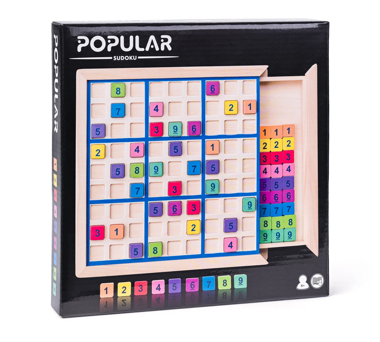 Nyní již nepotřebujete hledat vaši oblíbenpou hru v časopisech a novinách! Nyní najdete vše v dřevěném provedení a více než 52 zadáními včetně řešení. Krabička se sudoku obsahuje praktický zásobník pro uložení všech čísel, které se nepoužívají. Hrací deska se skládá z 9 řádků a 9 sloupců, celkem 81 buněk. Kromě toho má herní mřížka 9 čtverců, každý o velikosti 3x3 buňky. Každý řádek a sloupec musí obsahovat jedinečné číslice od 1 do 9 a totéž platí pro