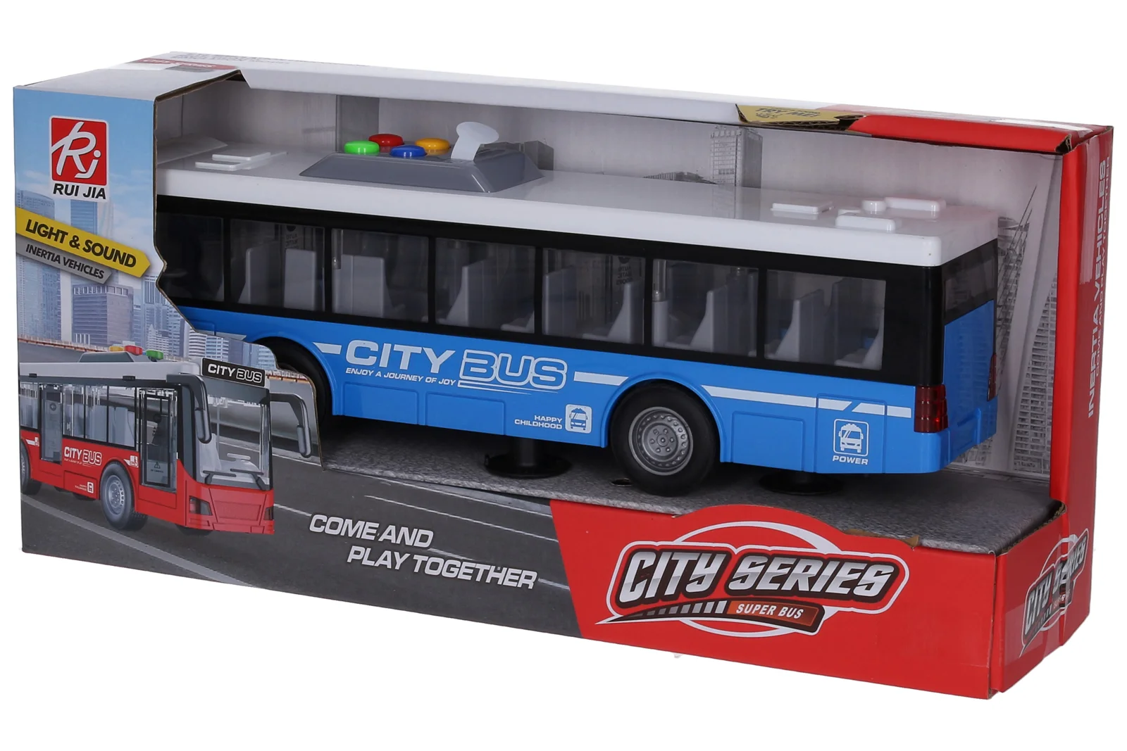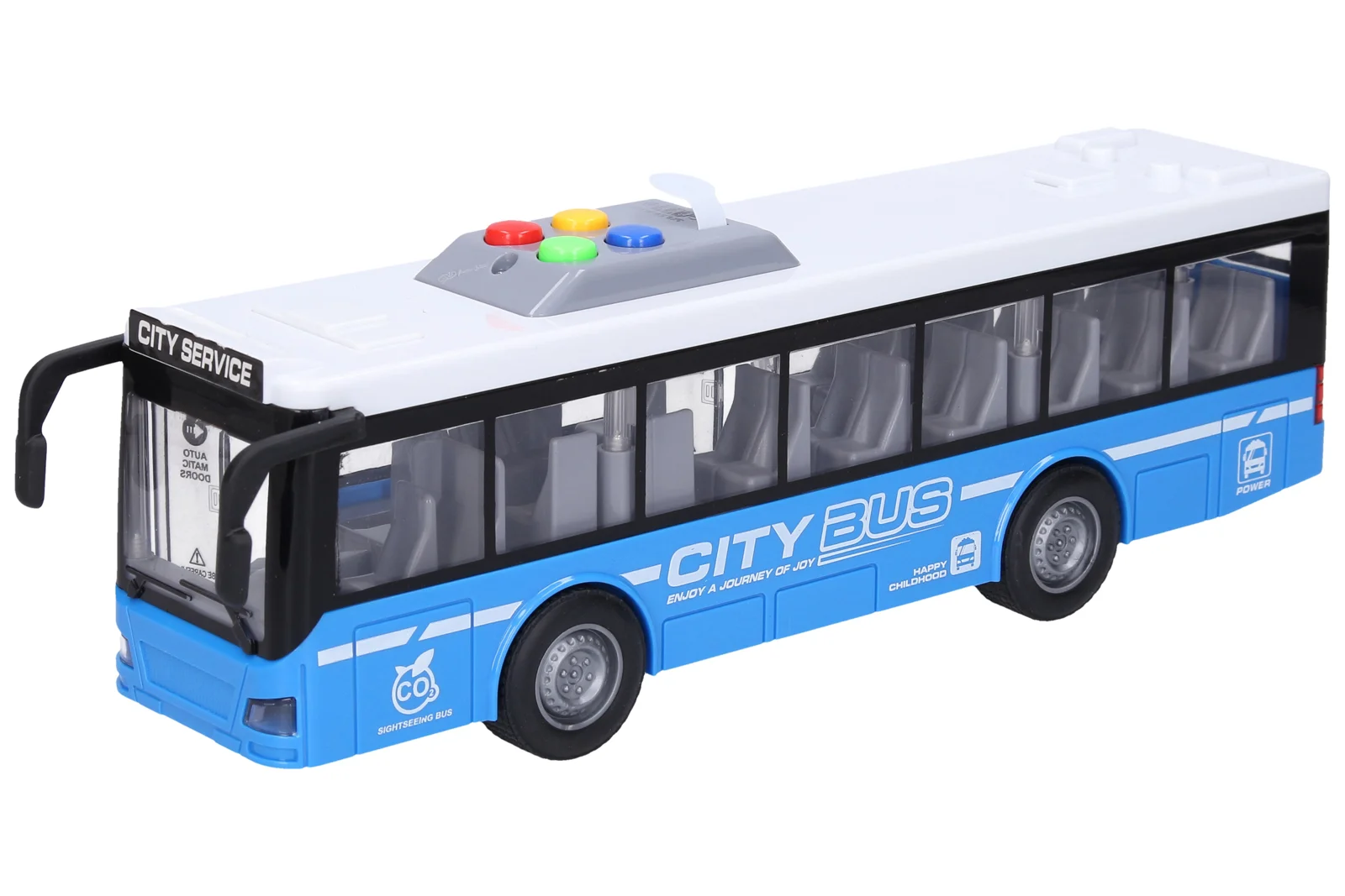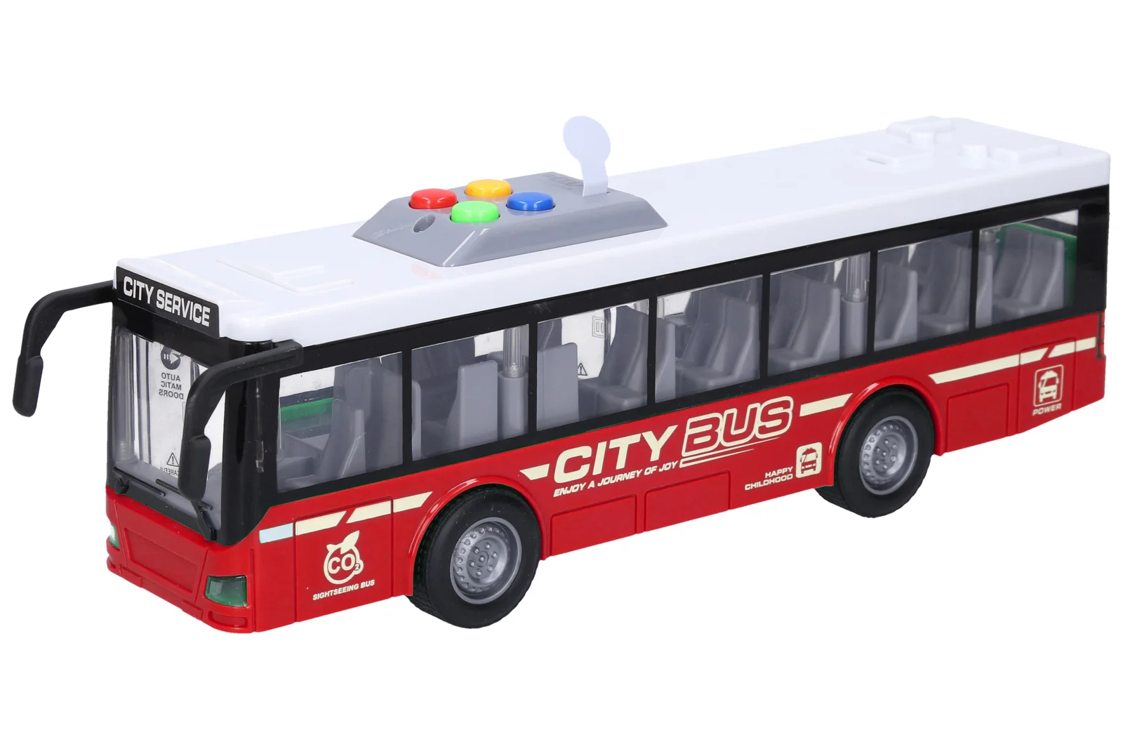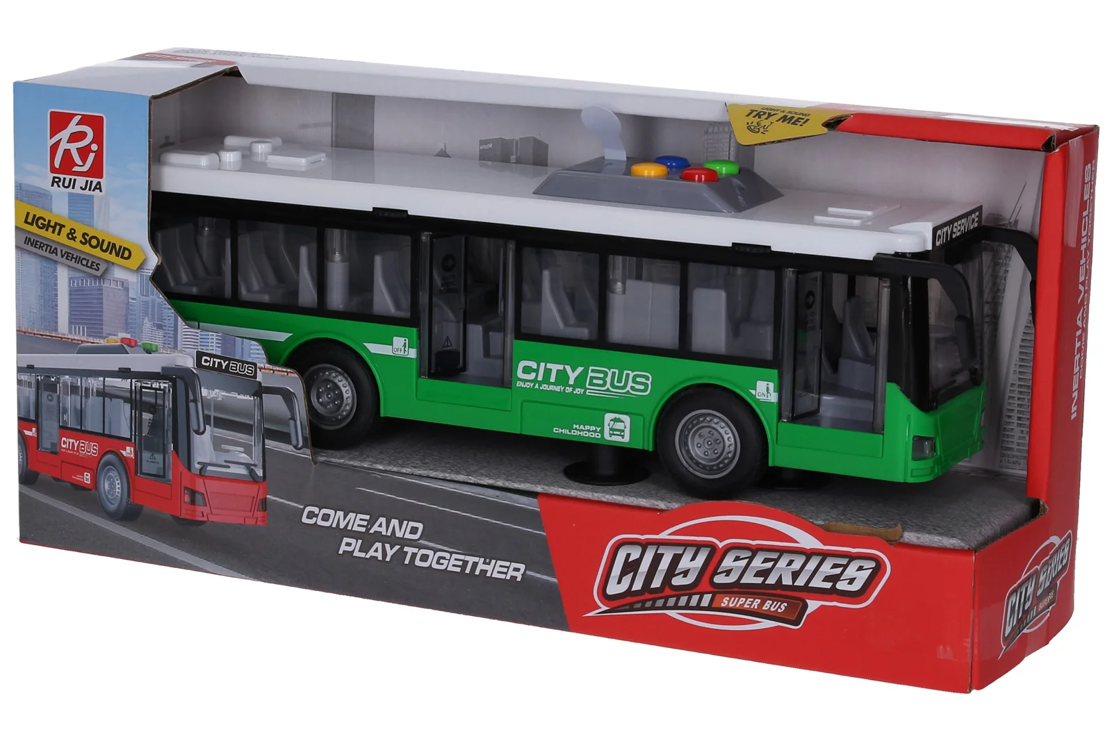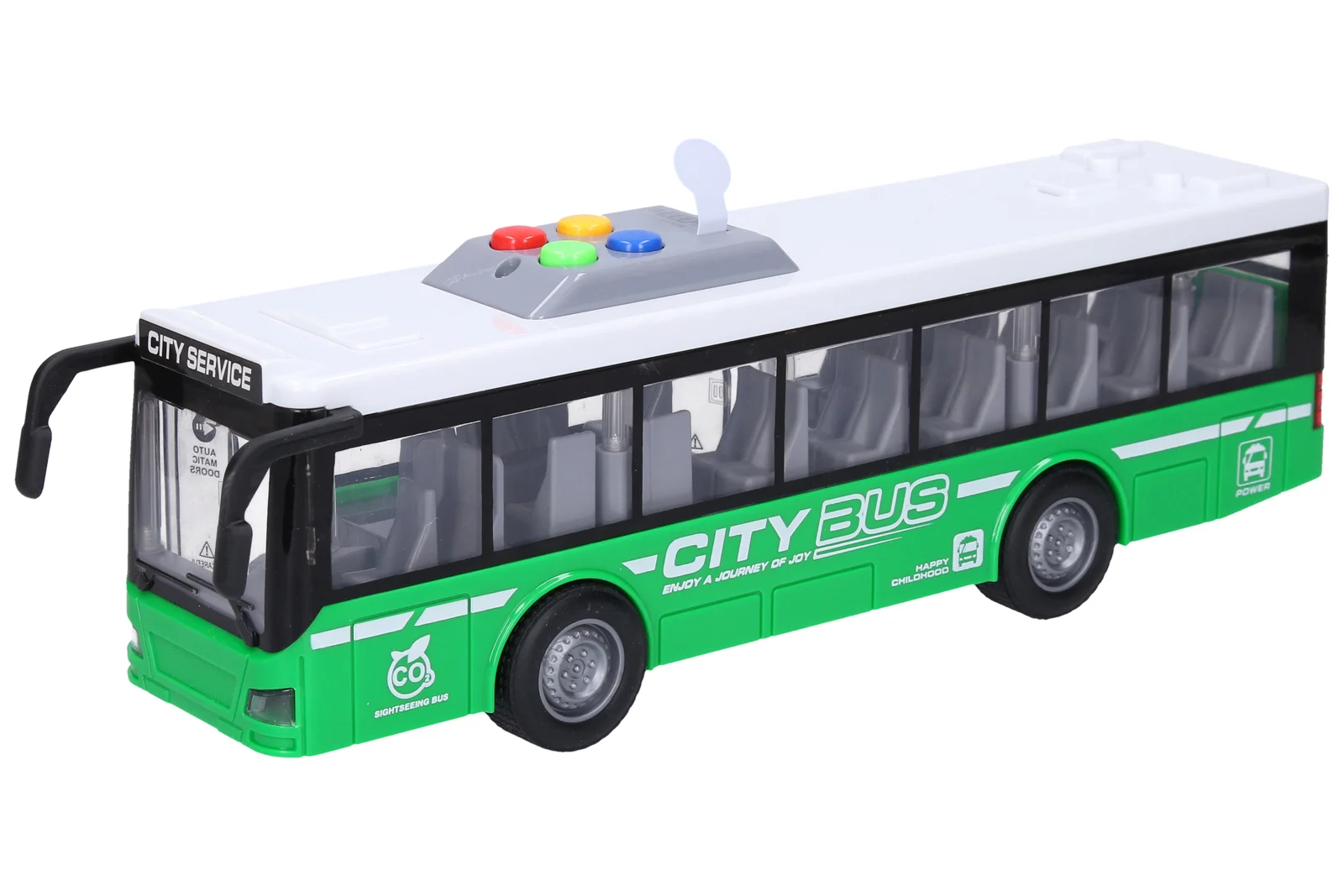 Autobus se světelnými a zvukovými efekty. Autobus funguje na setrvačník. Světelné a zvukové efekty se zapínají tlačítky na střeše autobusu. Otevírací dveře. Funguje na 3xAG13 baterie, které jsou součástí. Assort je náhodný mix modelů. Výběr nelze ovlivnit. 3 varianty – zelená, modrá, červená. Délka autobusu 27 cm. Rozměry autobusu: 8 x 27 x 9 cm. Rozměry balení: 10 x 32 x 14,5 cm. Věk: 3+
