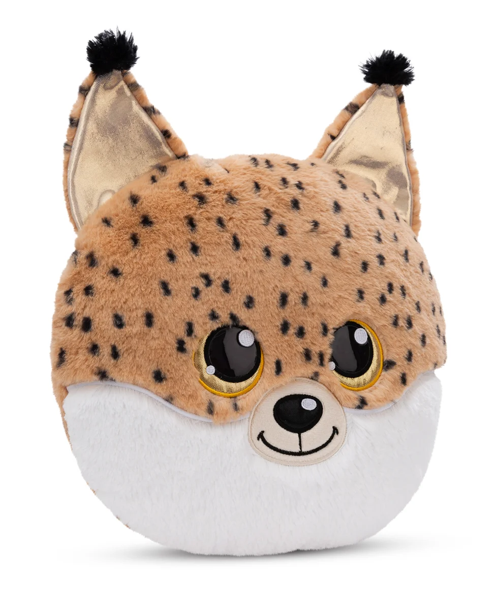 Kulatý plyšový polštářek GLUBSCHIS rys Lenzo ve tvaru rysí hlavy je nejen heboučký, ale také fascinuje okouzlujícím výrazem obličeje s velkýma třpytivýma očima ve zlaté barvě, lesklým černým nosem i rysíma ušima se zlatým třpytivým materiálem uvnitř. Polštářek z hnědého plyše NICI s černými flíčky je skvělým poutačem a dekorativním doplňkem do dětského pokoje. Ať už jako plyšový polštářek na přespání nebo na výlety, jako pohodlná opěrka hlavy na čtení, na spaní nebo jako další sběratelský kousek do vašeho vlastního plyšového světa GLUBSCHIS. Rozměr polštářku: 32 x 32 x 11 cm. Věk 0 m+