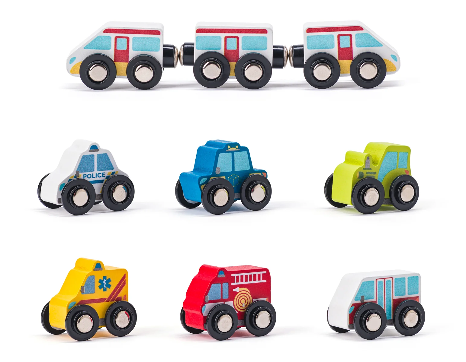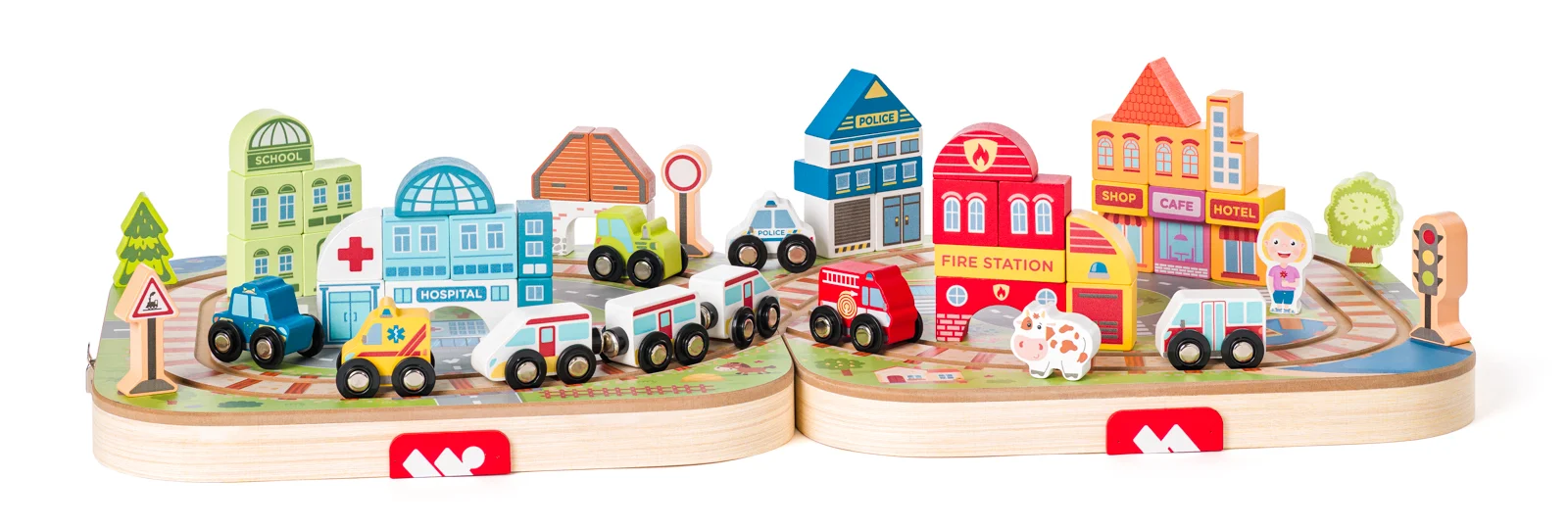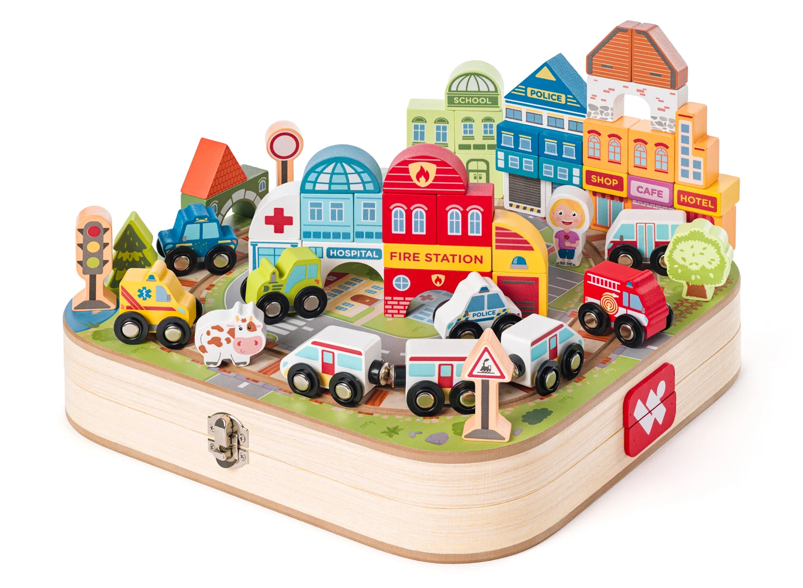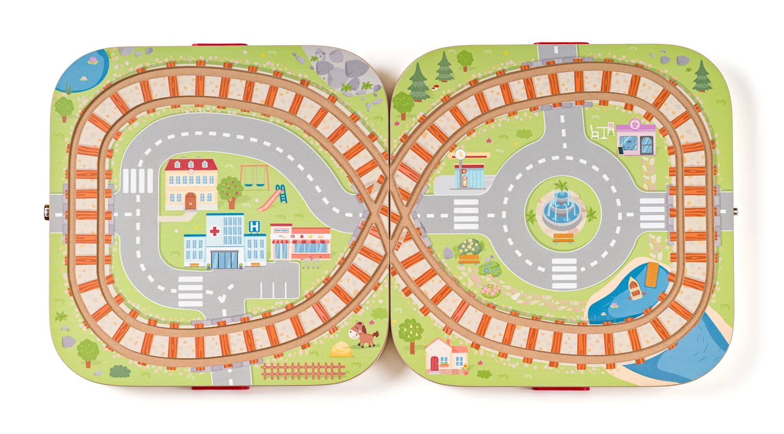 Otevřete kouzelný svět železnic v dřevěném kufříku! Po jeho rozložení vznikne na obou stranách jeho víka krajina s dráhou ve tvaru osmičky s vyfrézovanými kolejemi. Dřevěný vláček, dřevěná autíčka a kostky pro stavbu domečků tvoří dokonalou herní sadu v jedinečném designu od české výtvarnice. | Věk: 3+ | Rozměr rozloženého kufříku: 62 × 32 cm | Počet dílů: 55