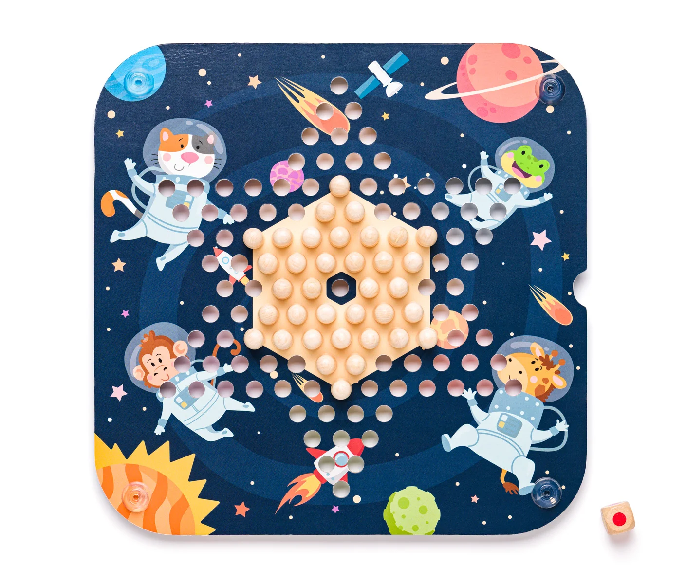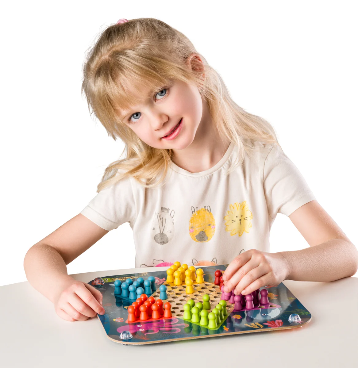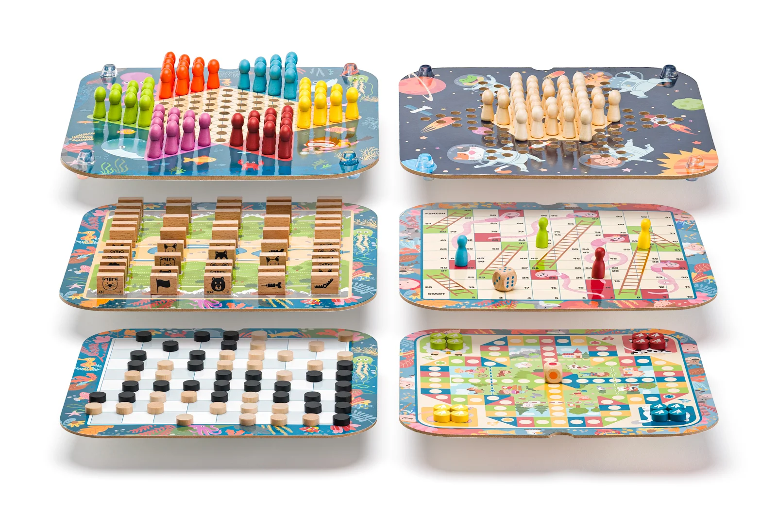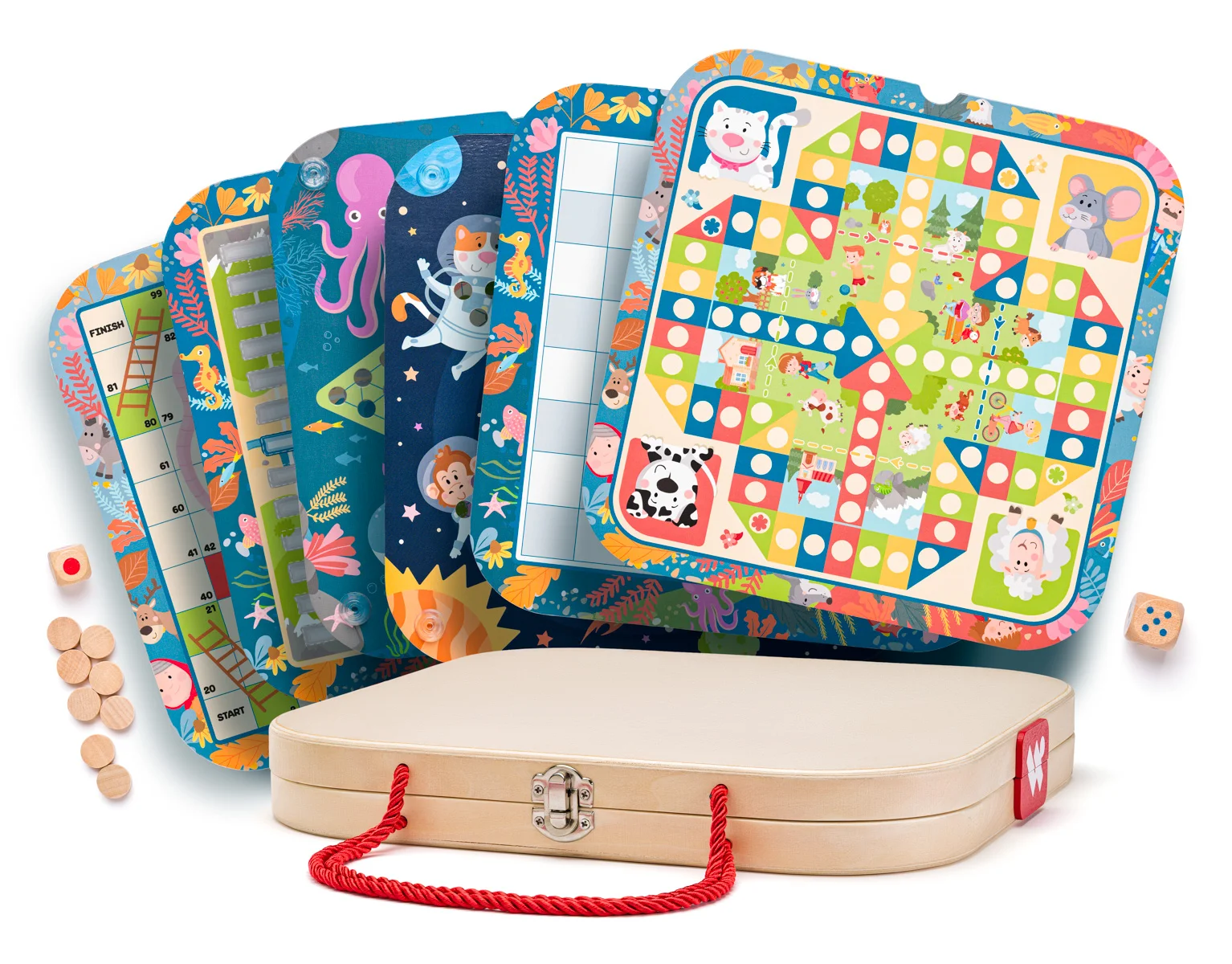 Dřevěný kufřík s tradičními i netradičními společenskými hrami pro děti obsahuje tři oboustranné čtvercové hrací plochy a figurky či hrací kameny k nim určené. Hrací desky jsou opatřeny originálnimi dětskými kresbami od české výtvarnice. Soubor obsahuje hry: Člověče, buď ve střehu (zábavnější a napínavější forma hry „Člověče, nezlob se“), Silnější vyhrává (strategická paměťová hra), GO (tradiční čínská strategická hra), dáma, čínská dáma (není Dáma, má velmi zavádějící název, nepochází z Číny a s Dámou nemá také v podstatě nic společného), kolíčkové pexeso (zábavná a jednoduchá hru, která procvičuje jemnou motoriku, rozpoznávání barev, soustředění a paměť), žížaly (klasická hra s kostkou, kdy během chůze po políčkách můžeš využít žebříků jako zkratek, ale běda, když šlápneš na hlavu nezbedné žížale).| Věk: 5+| Rozměr kufříku: 33 x 33 x6 cm