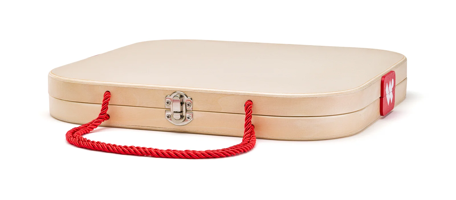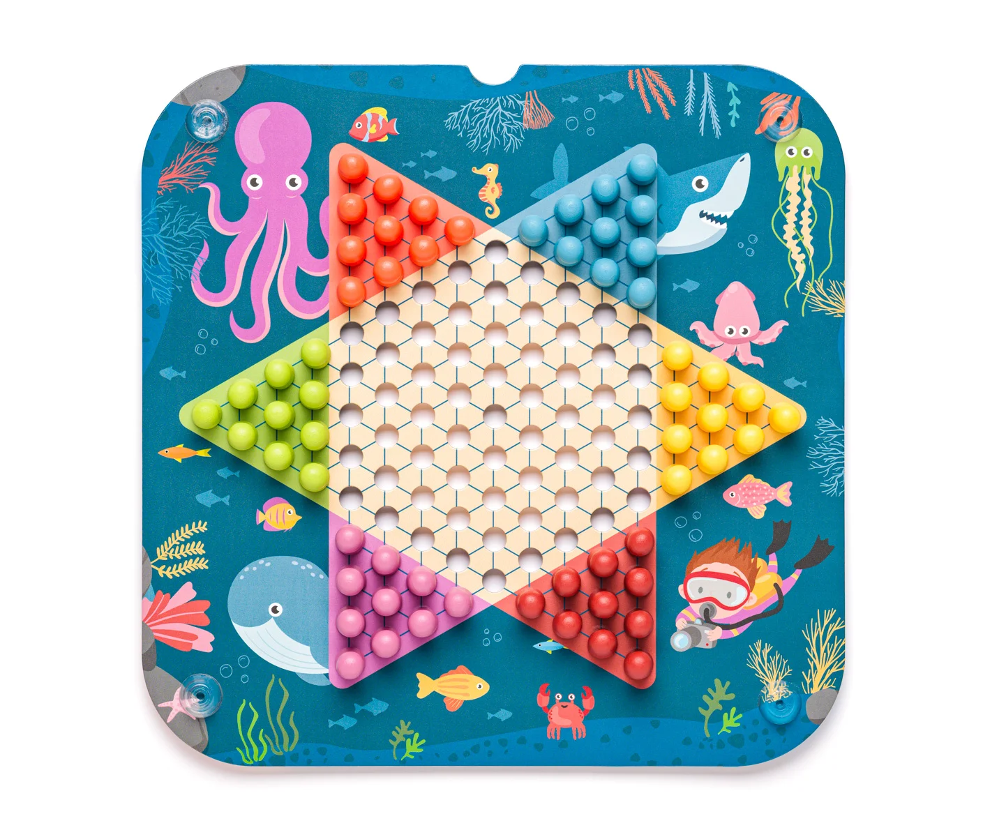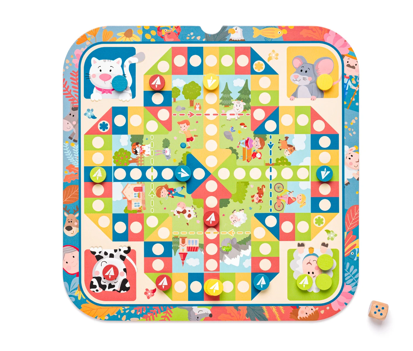 Dřevěný kufřík s tradičními i netradičními společenskými hrami pro děti obsahuje tři oboustranné čtvercové hrací plochy a figurky či hrací kameny k nim určené. Hrací desky jsou opatřeny originálnimi dětskými kresbami od české výtvarnice. Soubor obsahuje hry: Člověče, buď ve střehu (zábavnější a napínavější forma hry „Člověče, nezlob se“), Silnější vyhrává (strategická paměťová hra), GO (tradiční čínská strategická hra), dáma, čínská dáma (není Dáma, má velmi zavádějící název, nepochází z Číny a s Dámou nemá také v podstatě nic společného), kolíčkové pexeso (zábavná a jednoduchá hru, která procvičuje jemnou motoriku, rozpoznávání barev, soustředění a paměť), žížaly (klasická hra s kostkou, kdy během chůze po políčkách můžeš využít žebříků jako zkratek, ale běda, když šlápneš na hlavu nezbedné žížale).| Věk: 5+| Rozměr kufříku: 33 x 33 x6 cm
