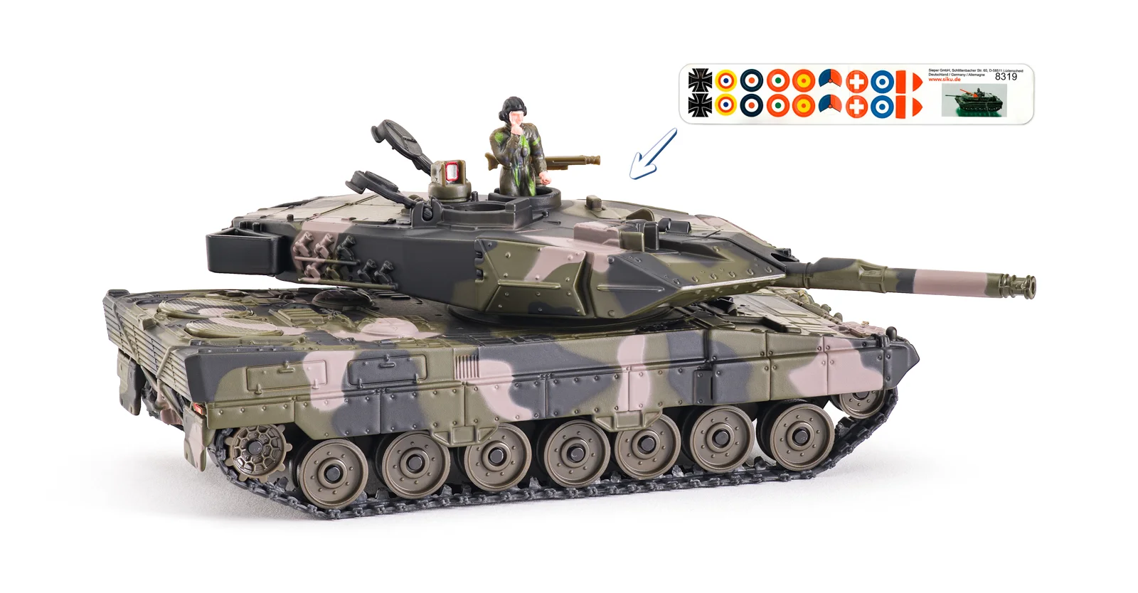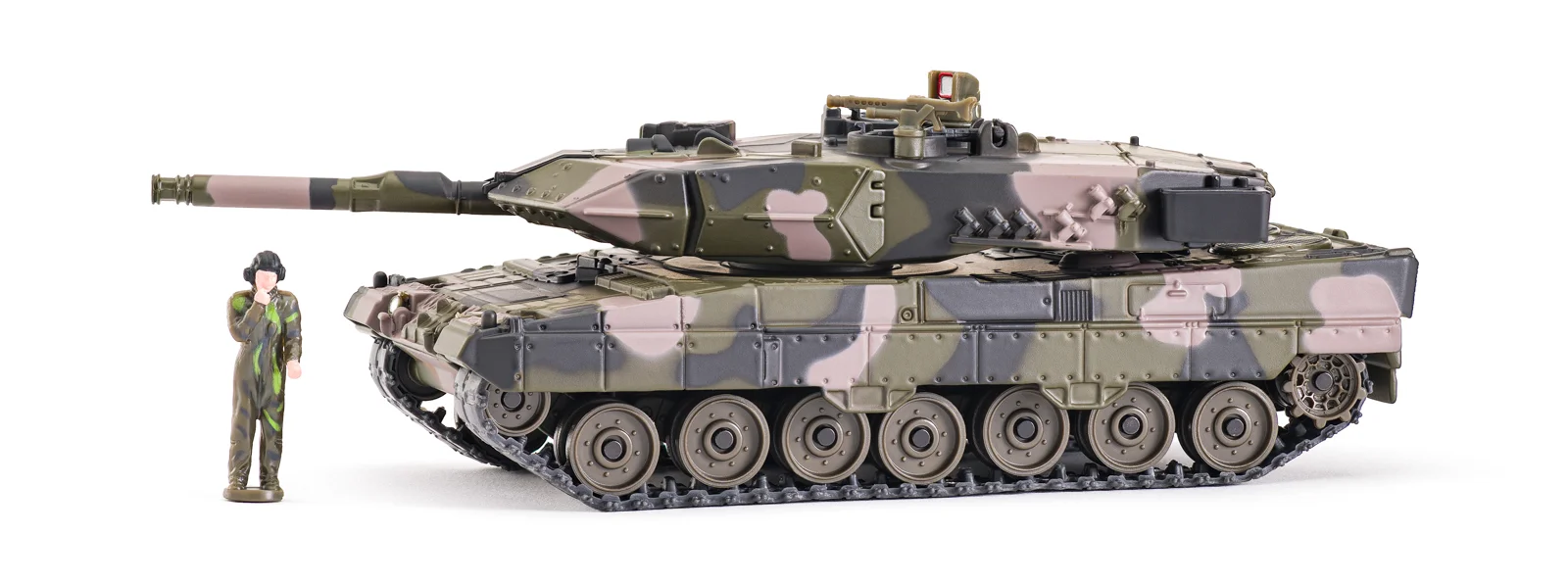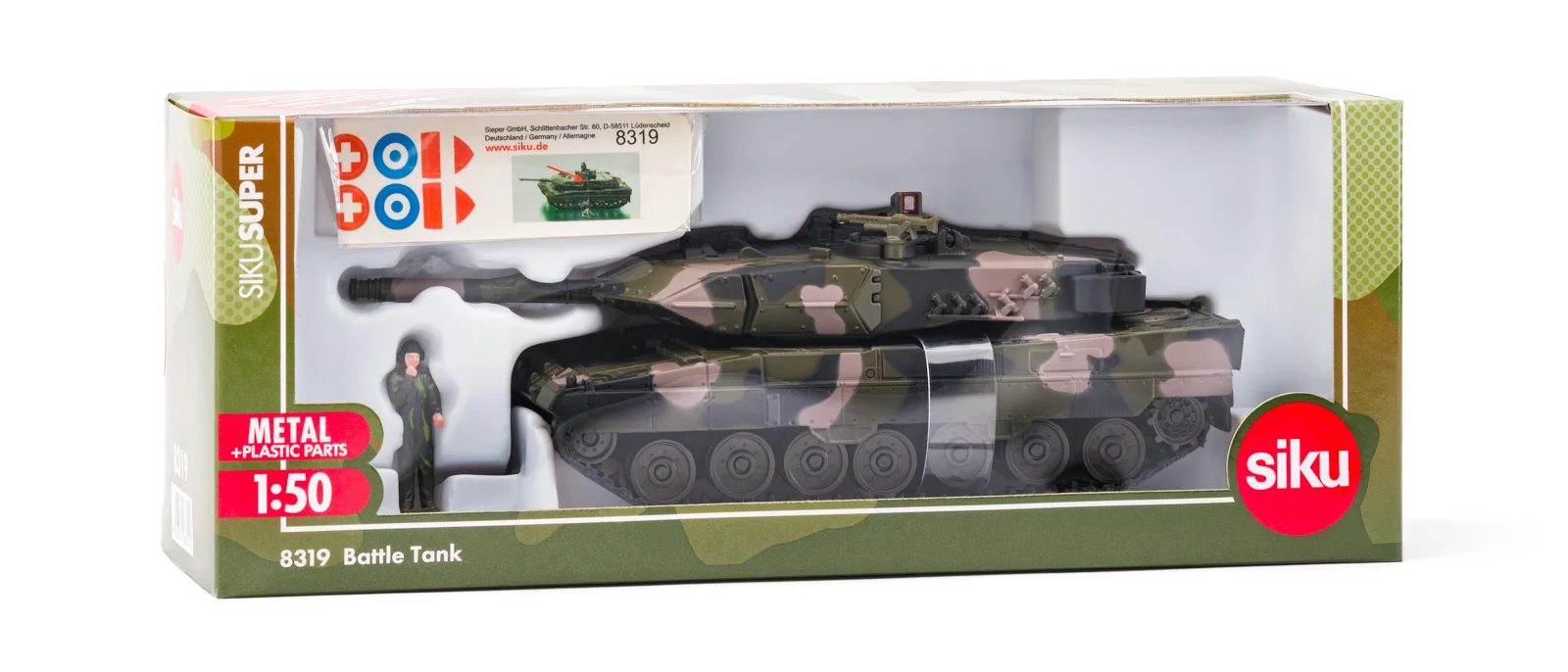Věrná originální replika vojenského tanku Leopard v měřítku 1:50. Tento model SIKU se vyznačuje realistickými detaily a je vyroben z tlakově litých kovových a plastových komponentů. Modely SIKU neobsahují žádné PVC a splňují mezinárodní bezpečnostní normy pro hračky. Model bojového tanku s pohyblivou dělovou věží a dělem, hladce se rolujícími pásy. Obsahuje figurku vojáka a samolepky k polepení vozu. Rozměry tanku: 7,4 x 6,8 x 18,9 cm. Rozměry balení: 10 x 25,5 x 8,5 cm. Baleno v krabičce. Věk: 3+