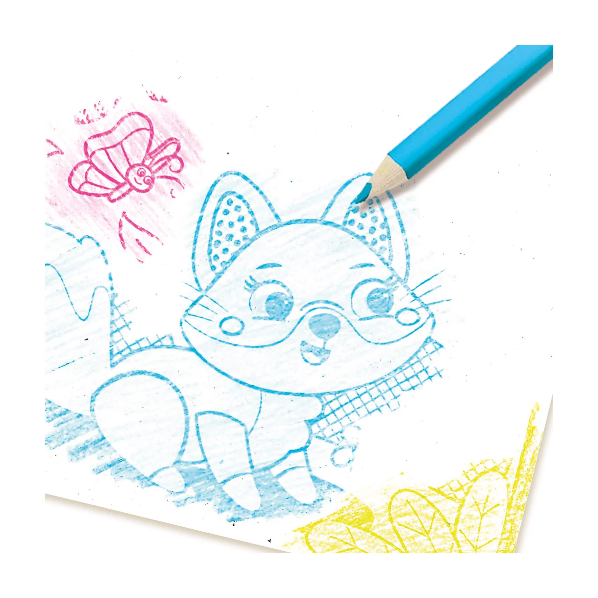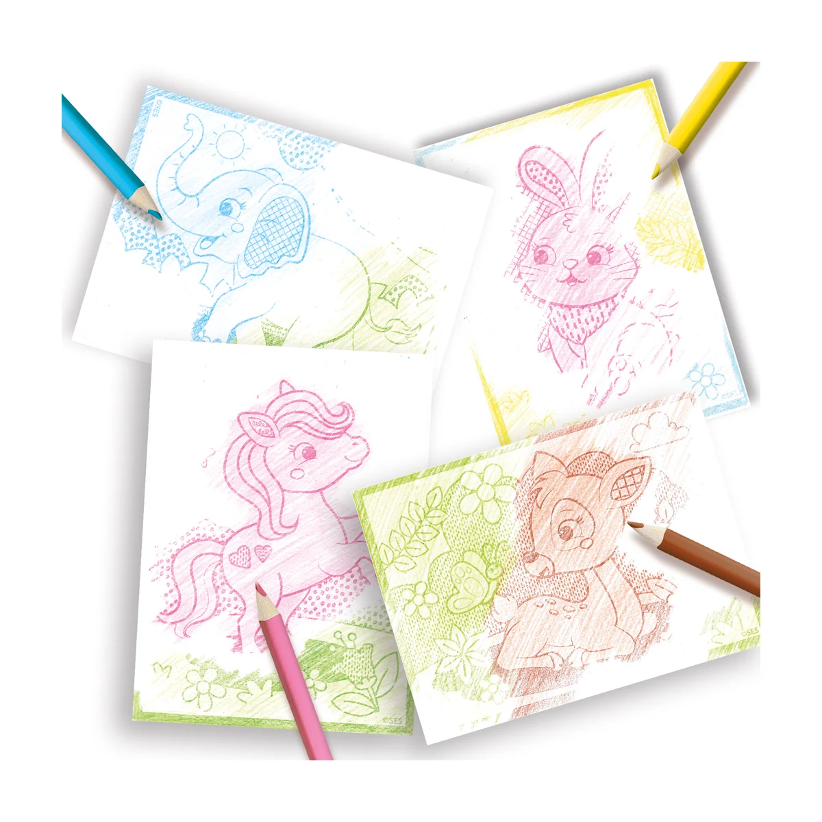 Prozkoumejte kouzelné stírací karty a zažijte kouzelné vybarvování. Sada obsahuje 6 kouzelných stíracích karet s veselými vzory a 8 barevných pastelek. Po seškrábání karet se pod nimi objeví skryté barevné obrázky. Jednoduchá, ale podmanivá aktivita, která inspiruje kreativitu. Zlepšuje jemnou motoriku a trpělivost, zatímco děti tvoří svá mistrovská díla. Rozměry balení: 20 x 15 x 4 cm. Věk: 3+