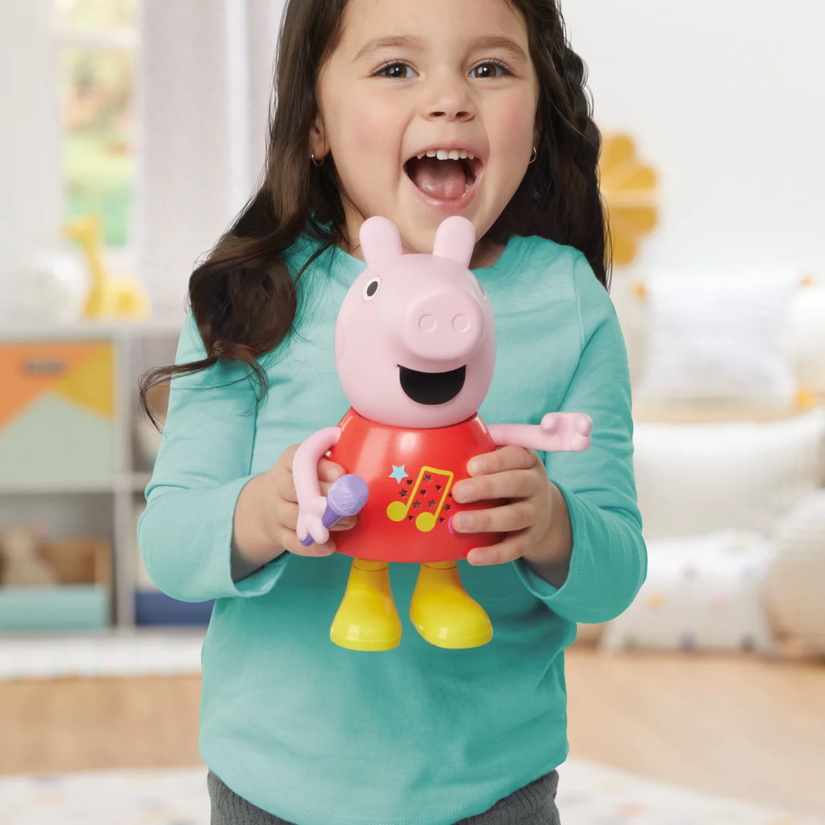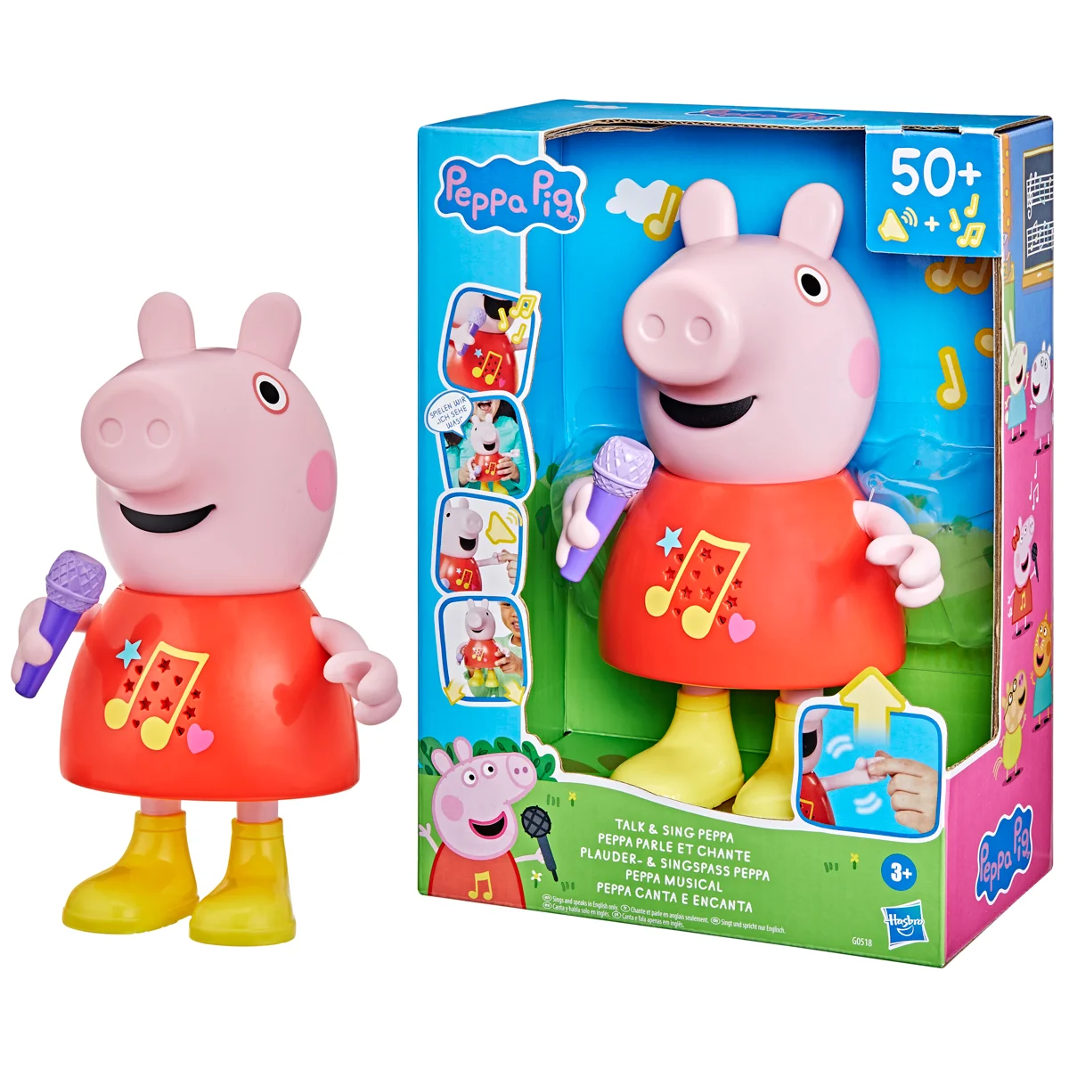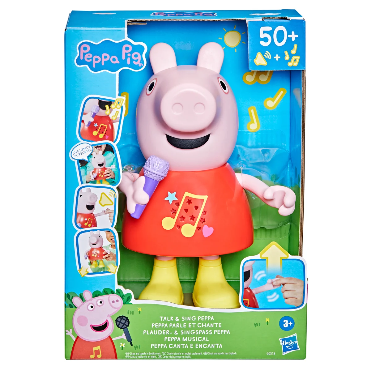 Mluvící a zpívající prasátko Peppa Pig. Díky více než 50 frázím, písním a zvukovým efektům bude hra s mluvícím a zpívajícím prasátkem Peppa tak zábavná. Tato super roztomilá hračka pro dívky a chlapce mluví, hraje a zpívá čtyři písničky; výměna režimů je stejně snadná jako pohyb jejího mikrofonu nahoru nebo dolů. Děti mohou pohybovat její paží, aby se její ústa pohybovala a slyšely ji mluvit nebo zpívat. Malé prasátko dokáže předstírat, že skáče do blátivých louží, aby předvedlo šplouchající zvukové efekty. Prasátko mluví a zpívá pouze v angličtině. Popis a varování jsou v českém jazyce. Funguje na baterie 2x AAA, které jsou součástí výrobku. Výška prasátka: 20 cm. Rozměry balení: 25,4 x 17,8 x 10,2 cm. Věk: 3+