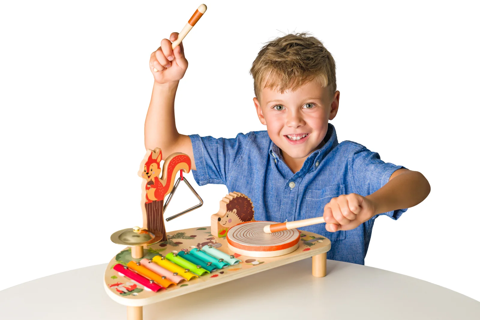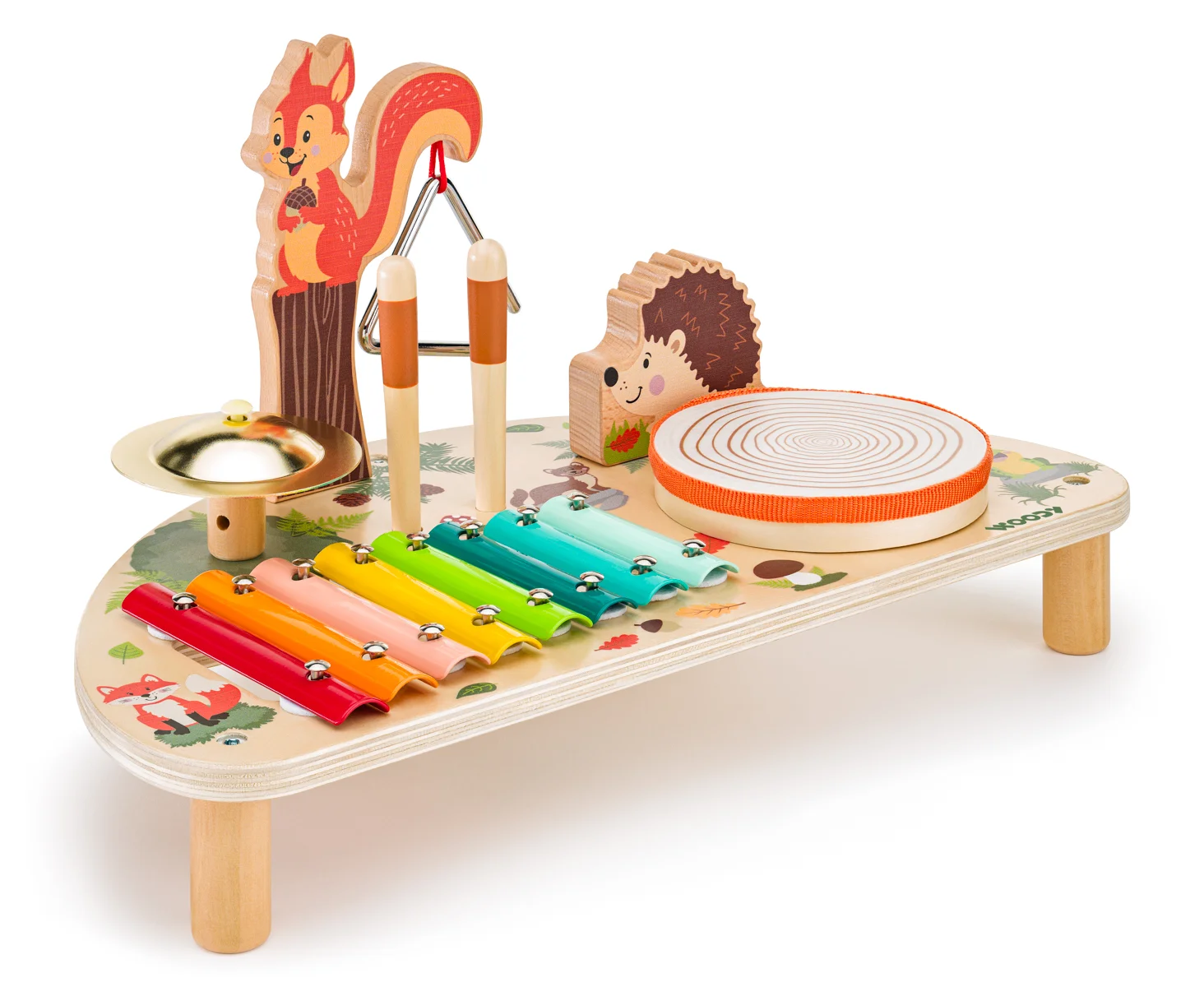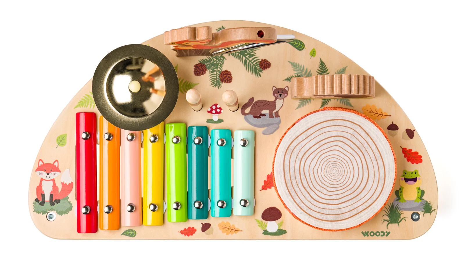 Muzikální centrum s hudebními nástroji od české designérky je dřevěná hudební hračka, která spojuje rytmus, objevování zvuků i rozvoj motoriky v jednom. Je vhodná pro děti od 2 let a podporuje přirozený vztah k hudbě hravou formou. Děti mohou objevovat různé zvuky a rytmy díky kombinaci pěti nástrojů: barevný xylofon, činel, triangl, bubínek a guiro – ježek. Součástí jsou dřevěné paličky, které slouží ke hře na hudební nástroje. Hudební centrum zdobí jemné ilustrace lesních zvířátek – veverka, ježek, liška a další motivy přírody. Hračka rozvíjí smysl pro rytmus a hudební sluch, jemnou motoriku a koordinaci. Muzikální centrum je vyrobeno z kvalitního jalovcového dřeva, překližky a kovu. Má stabilní konstrukci a zaoblené hrany pro bezpečné hraní. Rozměry hračky: 23 x 42 x 22,6 cm. Rozměry balení:23 x 22,6 x 42 cm. Věk: 2+