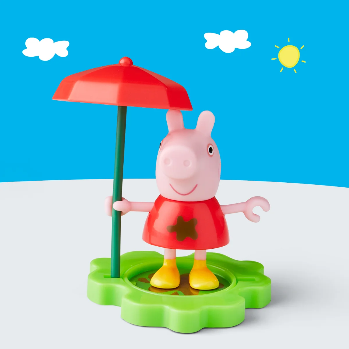 Prasátko Peppa zábava v louži – Peppa figurka s doplňky. Děti si mohou přehrávat scény ze seriálu nebo vymýšlet nová vlastní dobrodružství s figurkou Peppa pig zábava v louži. Tato sada je úžasnou hračkou pro děti, které milují tento seriál. Balení obsahuje figurku, stojánek, slunečník a deštník. Baleno v blistru. Rozměry balení: 15,1 x 12,7 x 3,8 cm. Věk: 3+