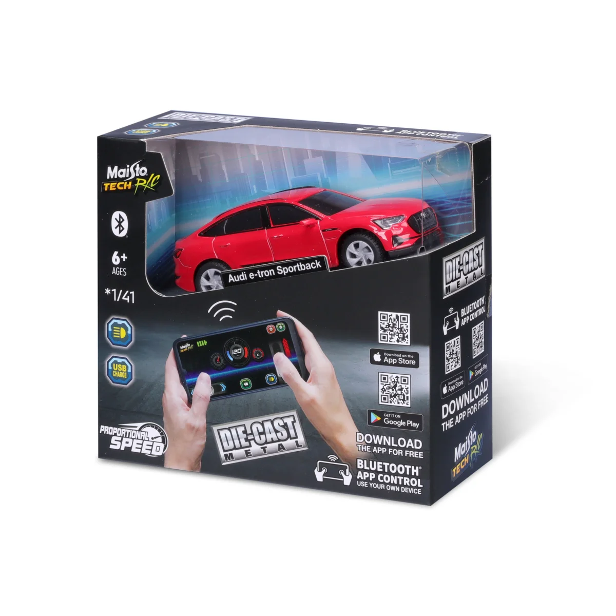VíceZažijte budoucnost RC s Maisto mini kovovým RC modelem Audi e-tron Sportback se světly, ovládaným přes Bluetooth. Popusťte uzdu síle a ovládejte tento zázrak v měřítku 1:41 jako opravdový automobilový nadšenec. Vaše oblíbené modely z litého kovu jsou nyní ovládány vaším chytrým telefonem. Síla je ve vašich rukou. 2,4 GHz pro špičkový výkon. Vozidlo využívá lithiovou baterii, která je dobíjecí pomocí nabíjecího kabelu USB C (baterie i kabel jsou součástí balení). Baleno v krabičce. Rozměry balení: 14 x 15,2 x 6,35 cm. Věk: 6+