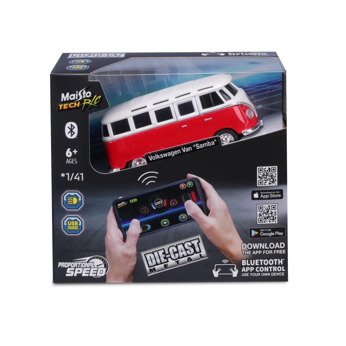 VíceZažijte budoucnost RC s Maisto mini kovovým RC modelem Volkswagen Van „Samba“se světly, ovládaným přes Bluetooth. Popusťte uzdu síle a ovládejte tento zázrak v měřítku 1:41 jako opravdový automobilový nadšenec. Vaše oblíbené modely z litého kovu jsou nyní ovládány vaším chytrým telefonem. Síla je ve vašich rukou. 2,4 GHz pro špičkový výkon. Vozidlo využívá lithiovou baterii, která je dobíjecí pomocí nabíjecího kabelu USB C (baterie i kabel jsou součástí balení). Baleno v krabičce. Rozměry balení: 14 x 15,2 x 6,35 cm. Věk: 6+