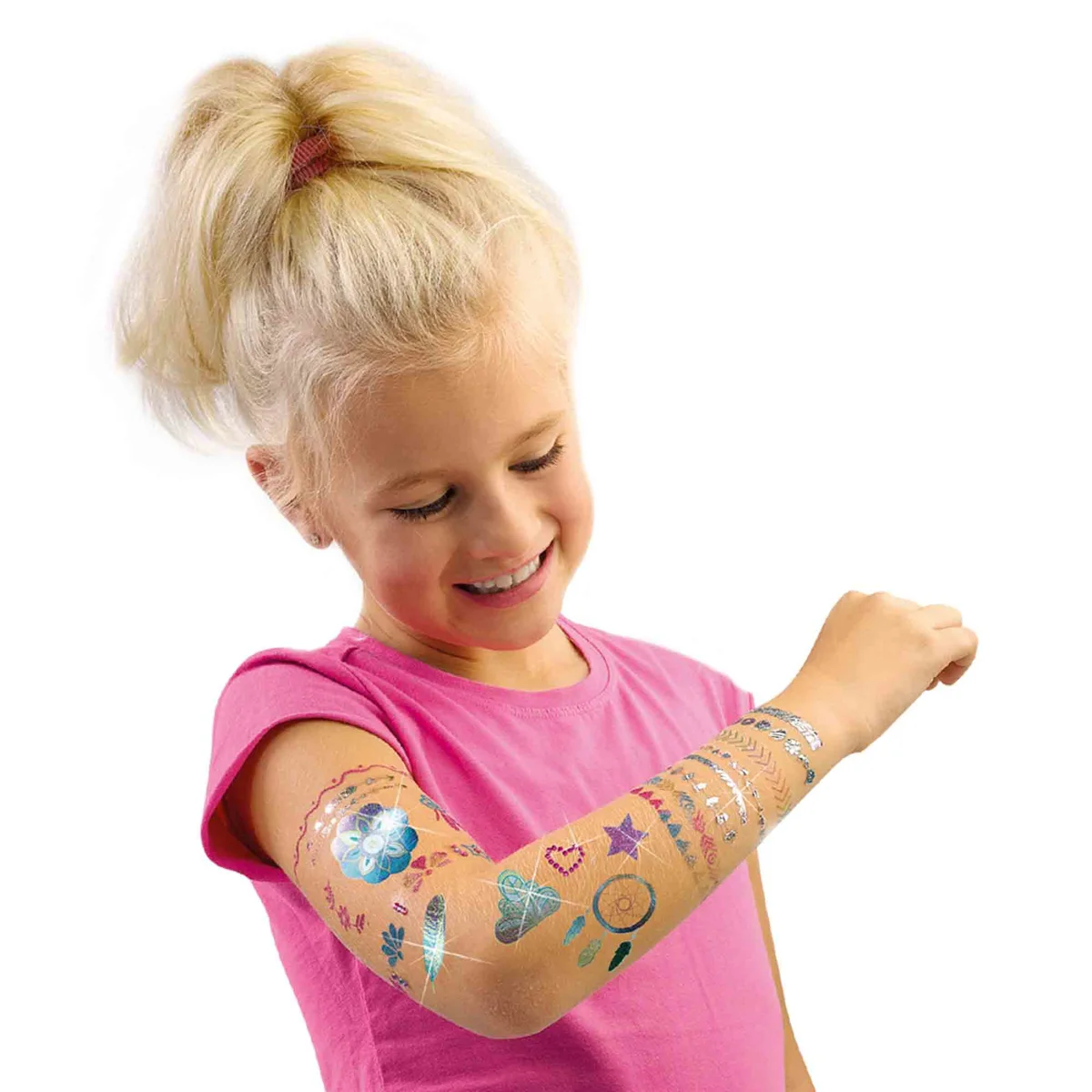 Tato luxusní kosmetická sada 3 v 1 od společnosti SES Creative vám umožní ozdobit se tím nejkrásnějším módním tetováním. Tato sada obsahuje nádherné metalické tetování, průhledné samolepky na tetování, které si můžete sami posypat různými pestrobarevnými třpytkami, a speciální lepidlo na pokožku. Pomocí lepidla si na kůži napište své jméno nebo si vytvořte vlastní kresbu a poté ji posypte třpytkami nebo nalepte luxusní diamanty. Během chvilky budete vypadat opravdu slavnostně! Kosmeticky testováno a snadno omyvatelné z pokožky. Obsahuje: metalické tetování, tetování se práškovými třpytkami, 4 barvy třpytek, štětec, lepidlo na kůži, diamantové kamínky, návod a luxusní dóza na skladování. Rozměry balení: 19,8 x 29,8 x 3,8 cm. Věk: 5+