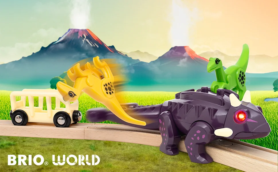 Se sadou Dinosauří útok prorazíte každou překážku. Mohutný dinosaurus, jenž dokonale zapadá do dřevěných vláčkodrah BRIO, ožívá díky červeným svítícím očím a řevu aktivovanému pohybem. Ankylosaurus má pružinový ocas připravený k švihu a dítě jím může povalit dvě barevné figurky velociraptorů, které jsou součástí sady. Magnet ukrytý v ocasu umožňuje tahat vagónky, podobně jako vláčky BRIO. Hračka je součástí řady BRIO World – Svět dinosaurů, kterou musí mít všechny děti milující dinosaury a vláčky. Sada Dinosauří útok obsahuje: 1x figurka ankylosaura, 2x figurka velociraptora, 1x vagon. Baterie: 1x AAA (baterie není součástí balení). Rozměry balení: 15 x 25 x 7,5 cm. Věk: 3+