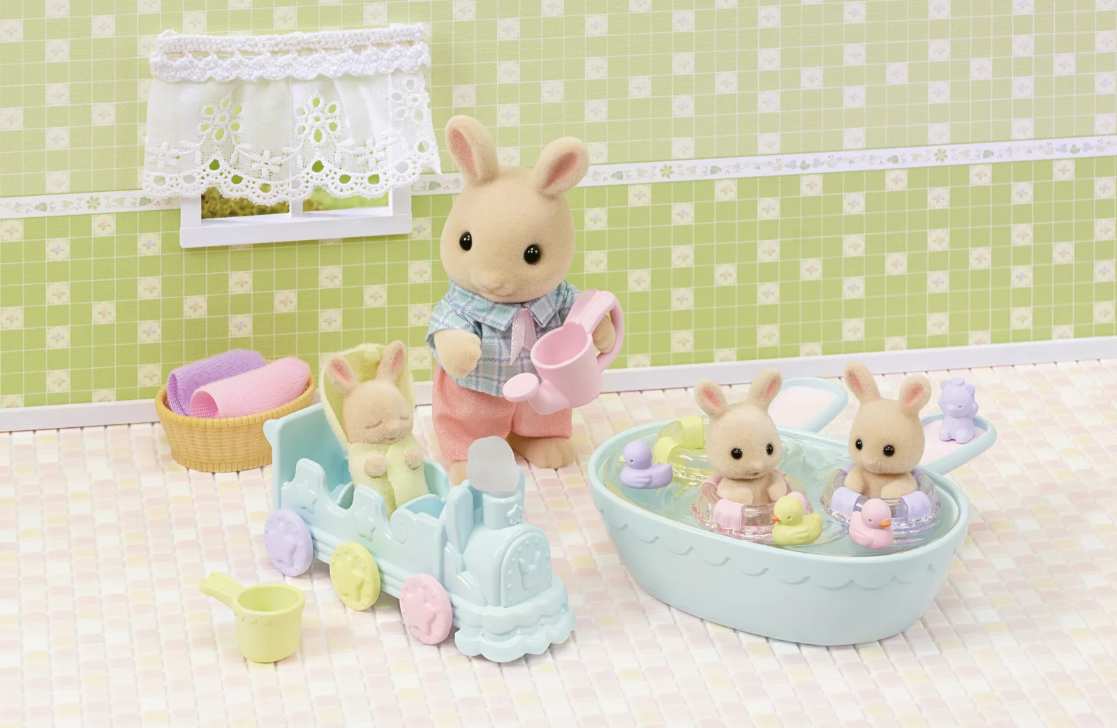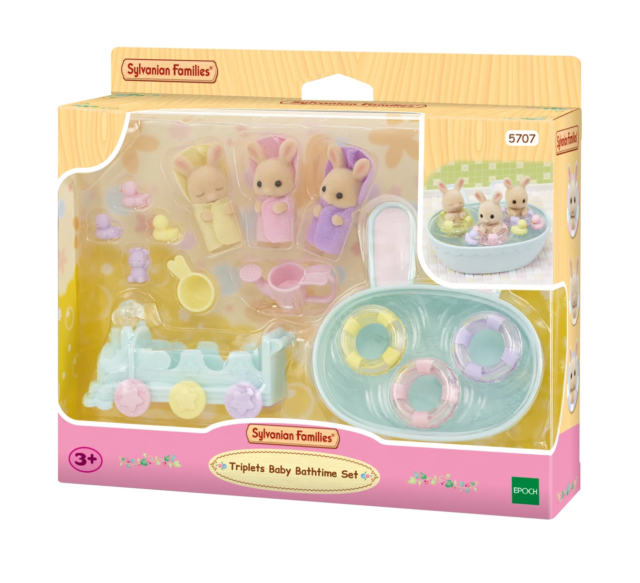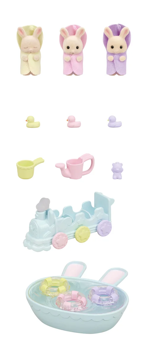 Trojčata Owen, Isla a Iris jsou nejnovější přírůstky v rodině mléčných králíčků a přicházejí v zábavné koupelové sadě. Sada obsahuje tři malé figurky pokryté měkkým semišovým kožíškem a spoustu doplňků. Trojčata jsou oblečena do zábavných, barevných župánků a každé z trojčátek má jiný výraz obličeje. Hračky Sylvanian Families rozvíjejí představivost a podporují děti k hraní rolí. Hraní s figurkami Sylvanian Families rozvíjí kreativitu a učí emoce prostřednictvím vytváření a vyprávění příběhů na základě každodenních zkušeností a pozorování světa. Vyznačují se nejvyšší kvalitou a výjimečným důrazem na detaily. Oblečení je vyrobeno tak, aby se dalo opakovaně svlékat a oblékat. Obsah: 3 figurky, vanička, 3 gumové kachničky, vozítko ve tvaru vláčku, šampon, kyblík a konvička. Baleno v krabičce. Rozměry balení: 15 x 20 x 5,5 cm. Věk: 3+