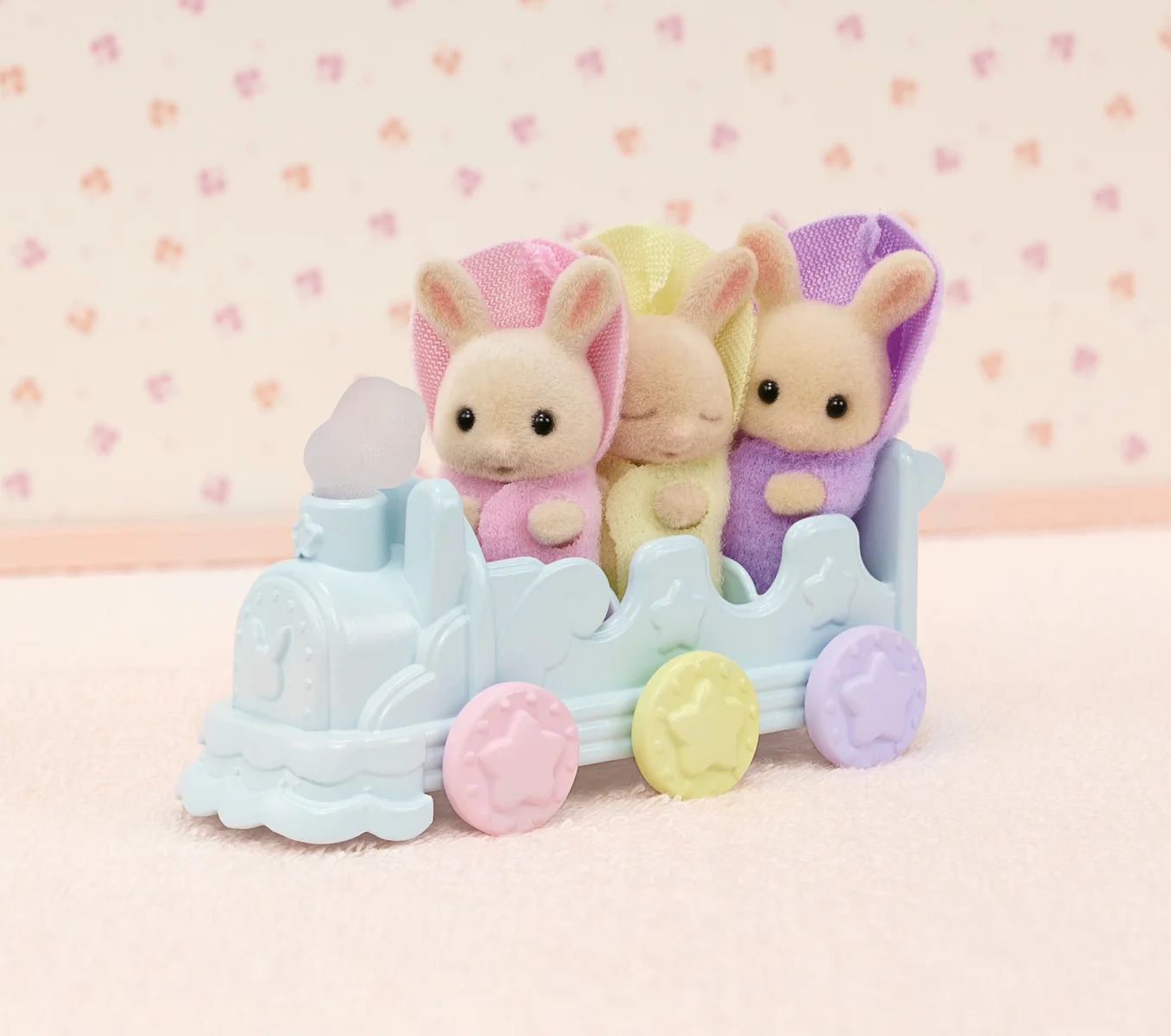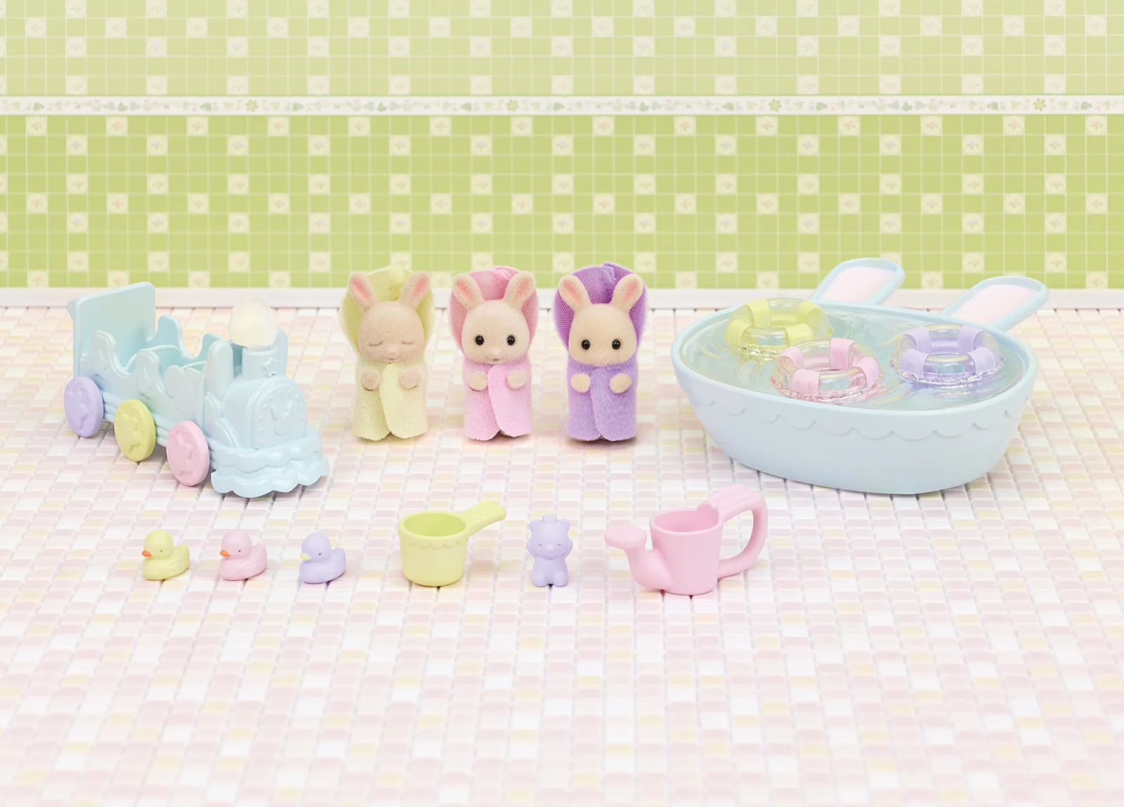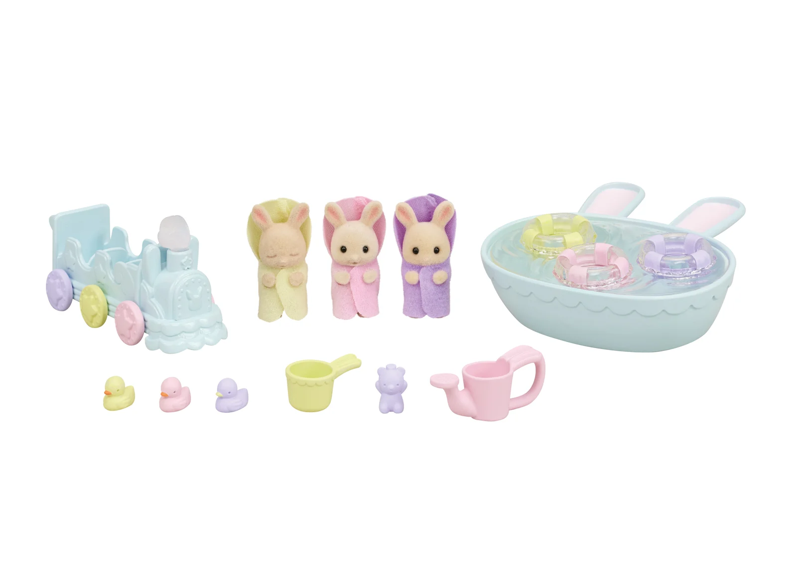Trojčata Owen, Isla a Iris jsou nejnovější přírůstky v rodině mléčných králíčků a přicházejí v zábavné koupelové sadě. Sada obsahuje tři malé figurky pokryté měkkým semišovým kožíškem a spoustu doplňků. Trojčata jsou oblečena do zábavných, barevných župánků a každé z trojčátek má jiný výraz obličeje. Hračky Sylvanian Families rozvíjejí představivost a podporují děti k hraní rolí. Hraní s figurkami Sylvanian Families rozvíjí kreativitu a učí emoce prostřednictvím vytváření a vyprávění příběhů na základě každodenních zkušeností a pozorování světa. Vyznačují se nejvyšší kvalitou a výjimečným důrazem na detaily. Oblečení je vyrobeno tak, aby se dalo opakovaně svlékat a oblékat. Obsah: 3 figurky, vanička, 3 gumové kachničky, vozítko ve tvaru vláčku, šampon, kyblík a konvička. Baleno v krabičce. Rozměry balení: 15 x 20 x 5,5 cm. Věk: 3+