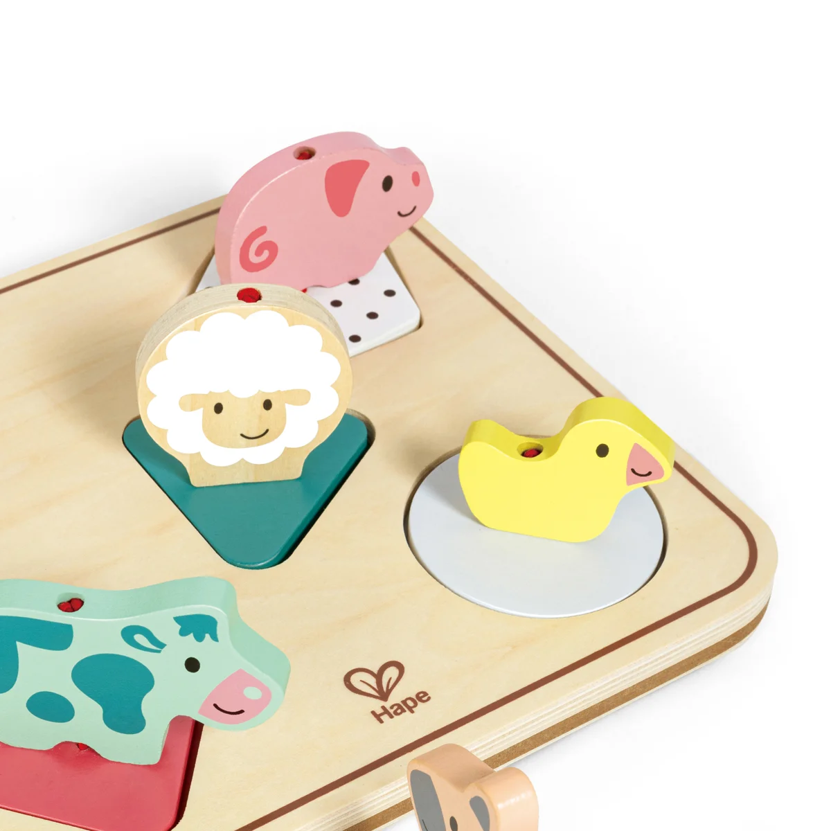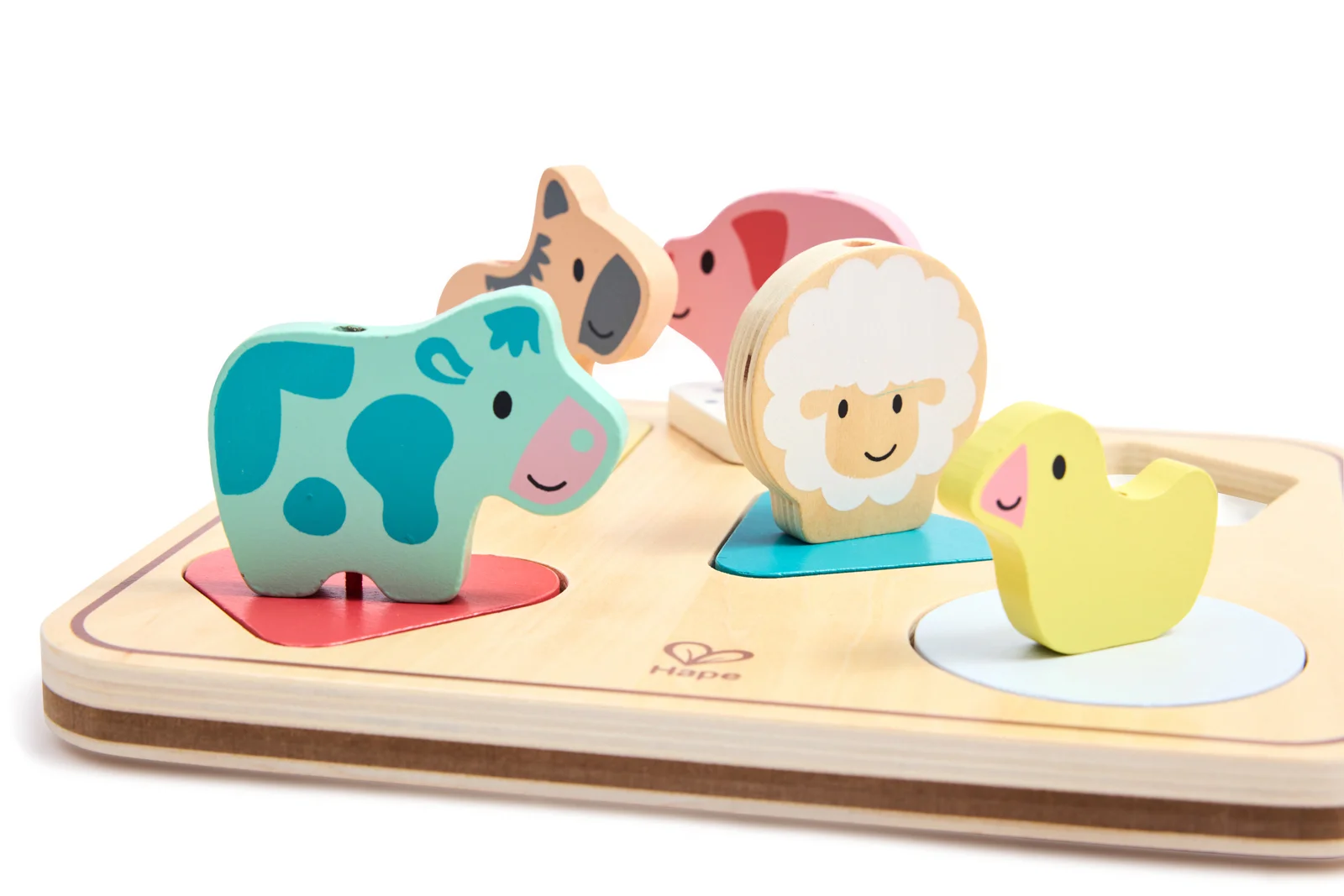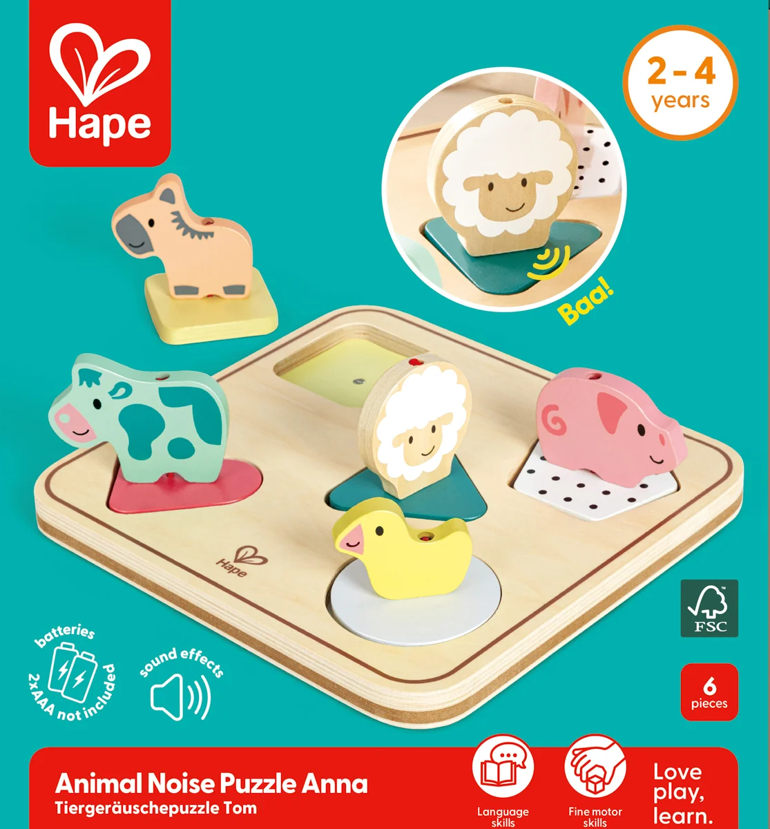 Toto puzzle se zvukovými efekty je fantasticky zábavná hračka pro vaše děti. Puzzle obsahuje pět hospodářských zvířat, která musí být správně umístěna na hrací desku na určená místa, poté každé zvíře vydá svůj charakteristický zvuk. Hračka umožňuje dětem učit se o zvířatech. Puzzle také pomáhá batolatům rozvíjet motorické a kognitivní dovednosti. Vyrobeno z odolného FCS dřeva s barvou vhodnou pro děti. Počet dílů: 6. Baterie: 2 x AAA, nejsou součástí. Rozměry balení: 22 x 24 x 8,5 cm. Věk: 2+
