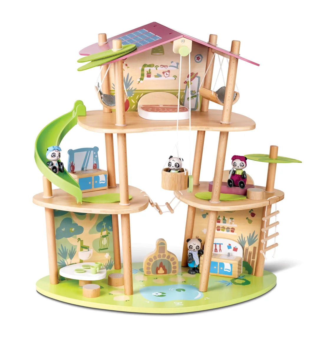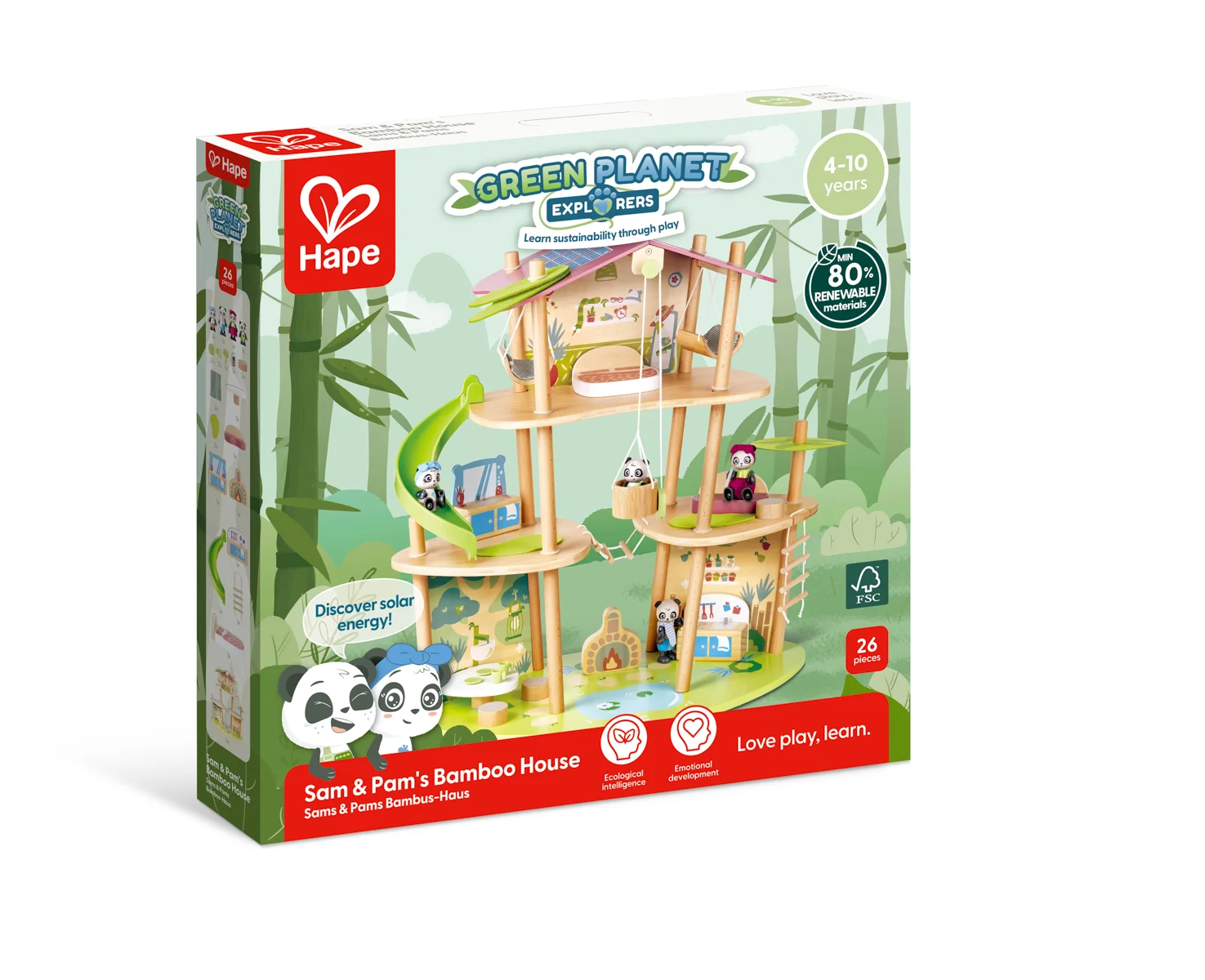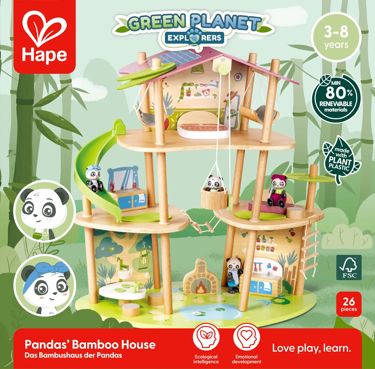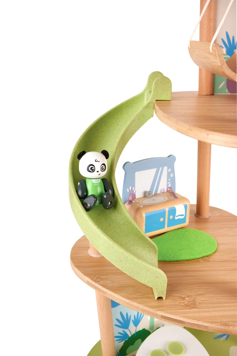 Bambusový domeček pro pandy. Tato sada z kolekce Green Planet Explorers je vyrobena z udržitelného bambusu a nabízí spoustu herních prvků – najdete v ní krb, houpací sítě, provazový žebřík, a dokonce i výtah. Společně s rodinkou čtyř pand strávíte nekonečné hodiny objevováním světa plného dobrodružství – a zároveň se zábavnou formou naučíte něco o udržitelnosti, když budete s pandí rodinou prozkoumávat divokou přírodu. Hračka podporuje rozvoj jemné motoriky, fantazie, kreativity, sociálních dovedností, a především znalostí o principech udržitelnosti. Sada obsahuje: domeček, čtyři figurky pandy, dvě houpací sítě, postel, toaletní stolek, pohovku, čajový stolek, dvě podlahové rohože, slunečník, stůl se dvěma pařezovými sedáky, krb, kamna, dva talíře, dva šálky, pánev, výtahový koš na provázku, visutý most, skluzavku a provazový žebřík. Domeček a postavy jsou vyrobeny z udržitelných materiálů, včetně bambusu, zeleného PE plastu a dřeva s certifikací FSC. Rozměry domečku: 61,2 x 59,4 x 34 cm. Rozměry balení: 60 x 61 x 10 cm. Věk: 4+