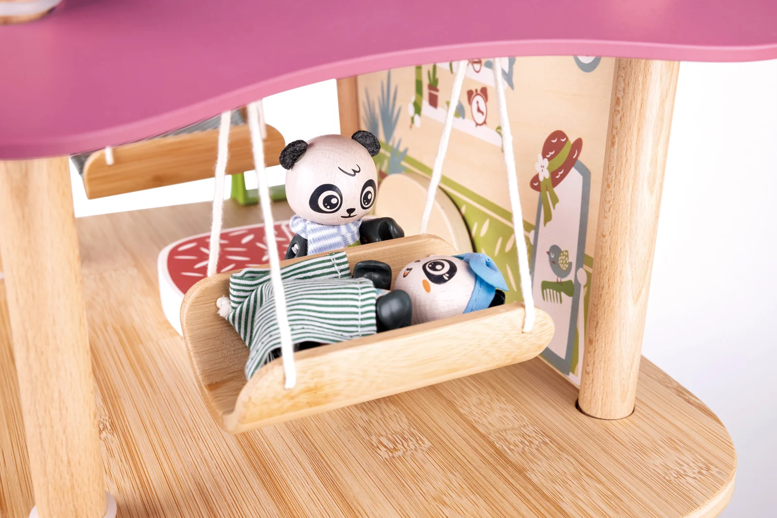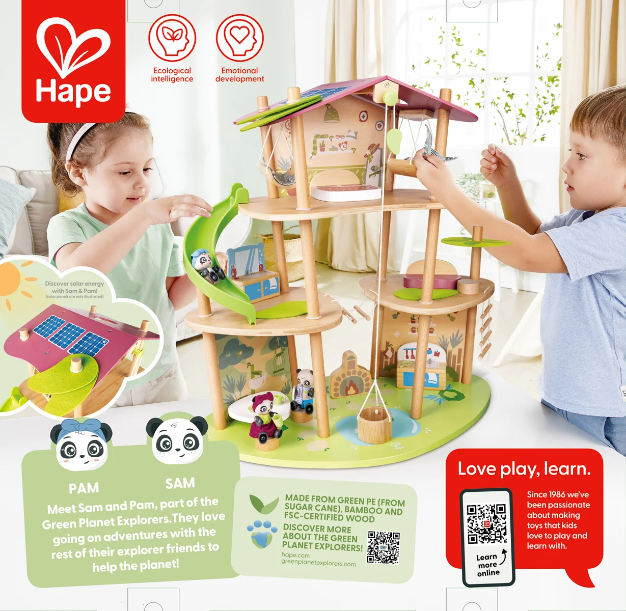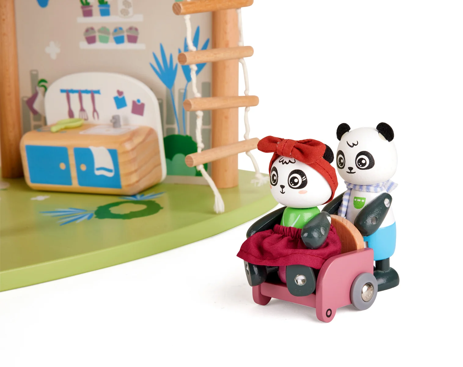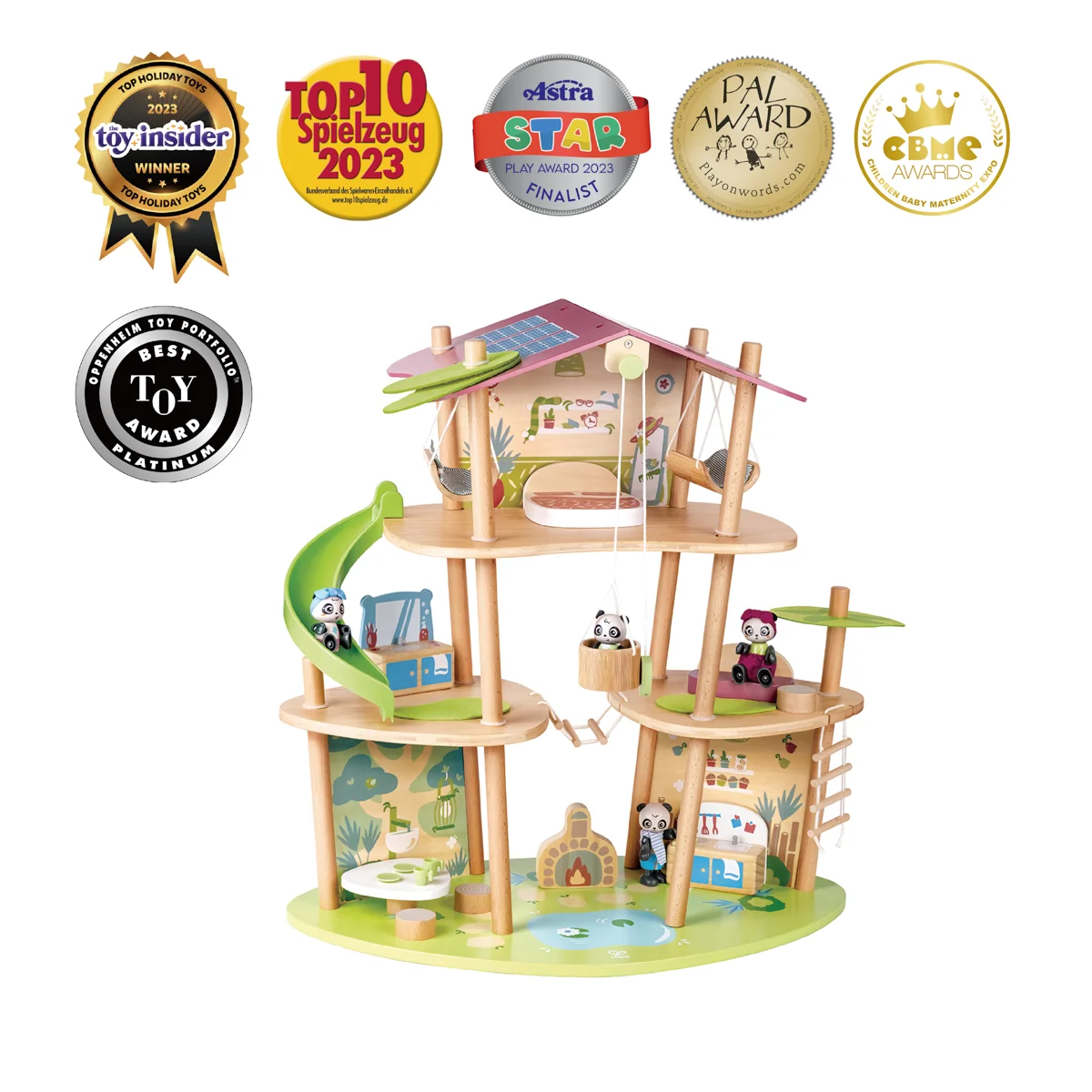 Bambusový domeček pro pandy. Tato sada z kolekce Green Planet Explorers je vyrobena z udržitelného bambusu a nabízí spoustu herních prvků – najdete v ní krb, houpací sítě, provazový žebřík, a dokonce i výtah. Společně s rodinkou čtyř pand strávíte nekonečné hodiny objevováním světa plného dobrodružství – a zároveň se zábavnou formou naučíte něco o udržitelnosti, když budete s pandí rodinou prozkoumávat divokou přírodu. Hračka podporuje rozvoj jemné motoriky, fantazie, kreativity, sociálních dovedností, a především znalostí o principech udržitelnosti. Sada obsahuje: domeček, čtyři figurky pandy, dvě houpací sítě, postel, toaletní stolek, pohovku, čajový stolek, dvě podlahové rohože, slunečník, stůl se dvěma pařezovými sedáky, krb, kamna, dva talíře, dva šálky, pánev, výtahový koš na provázku, visutý most, skluzavku a provazový žebřík. Domeček a postavy jsou vyrobeny z udržitelných materiálů, včetně bambusu, zeleného PE plastu a dřeva s certifikací FSC. Rozměry domečku: 61,2 x 59,4 x 34 cm. Rozměry balení: 60 x 61 x 10 cm. Věk: 4+