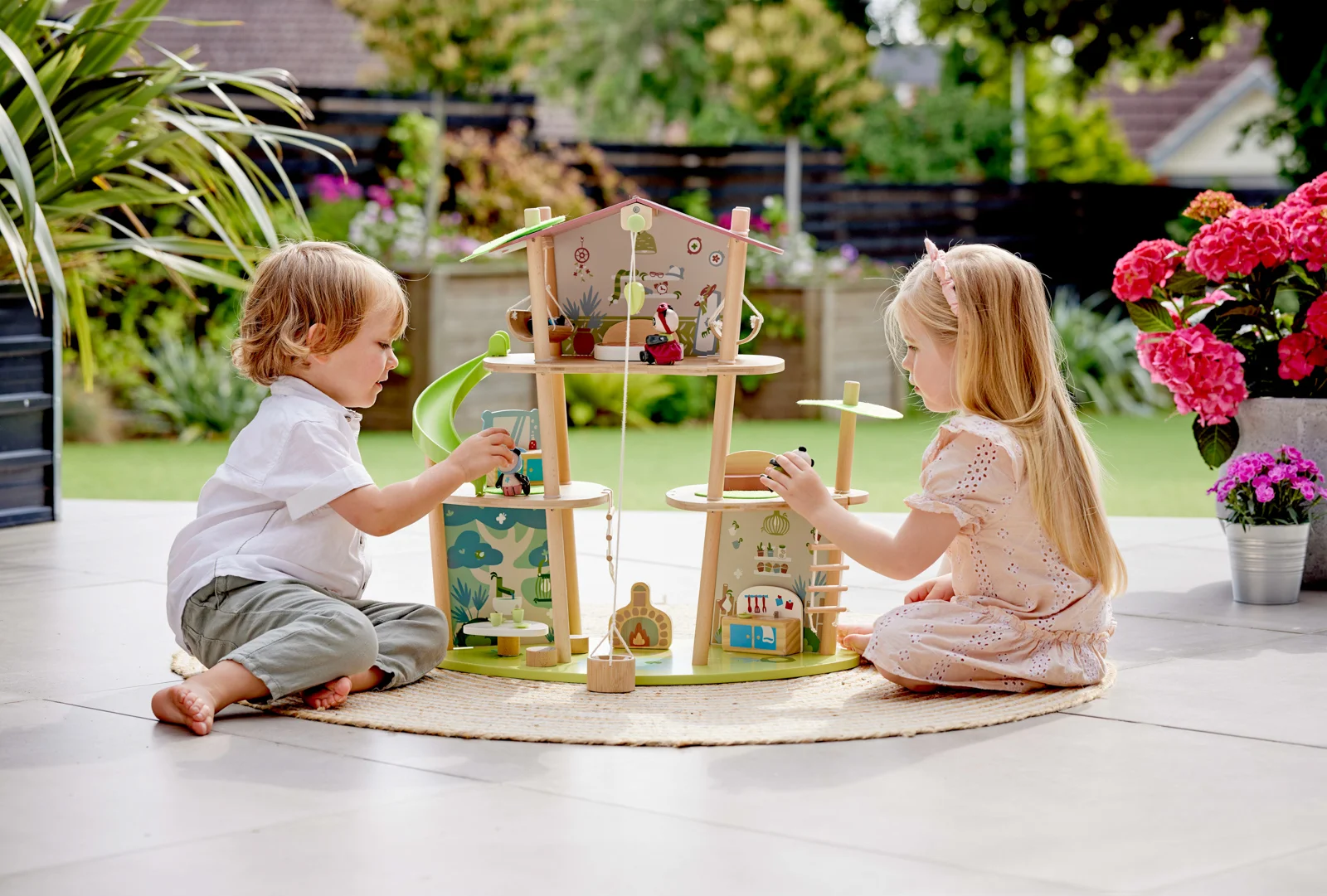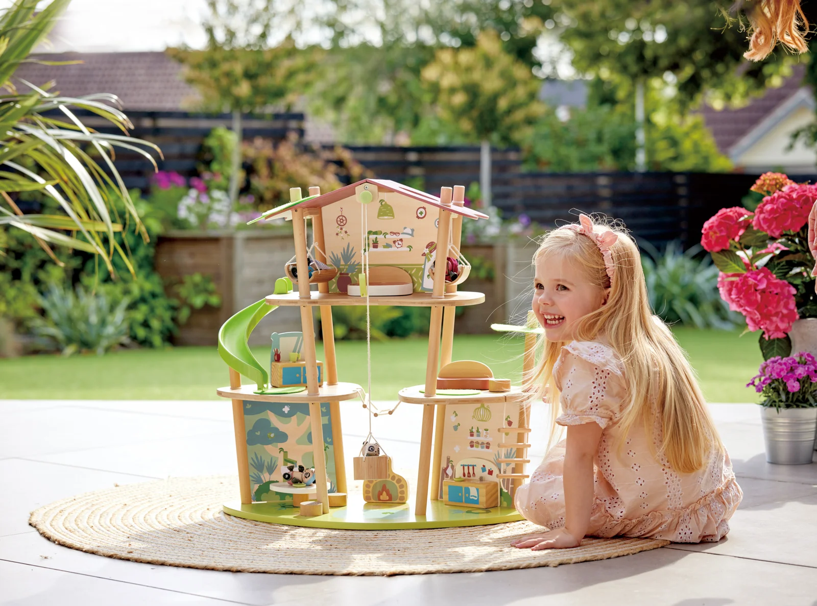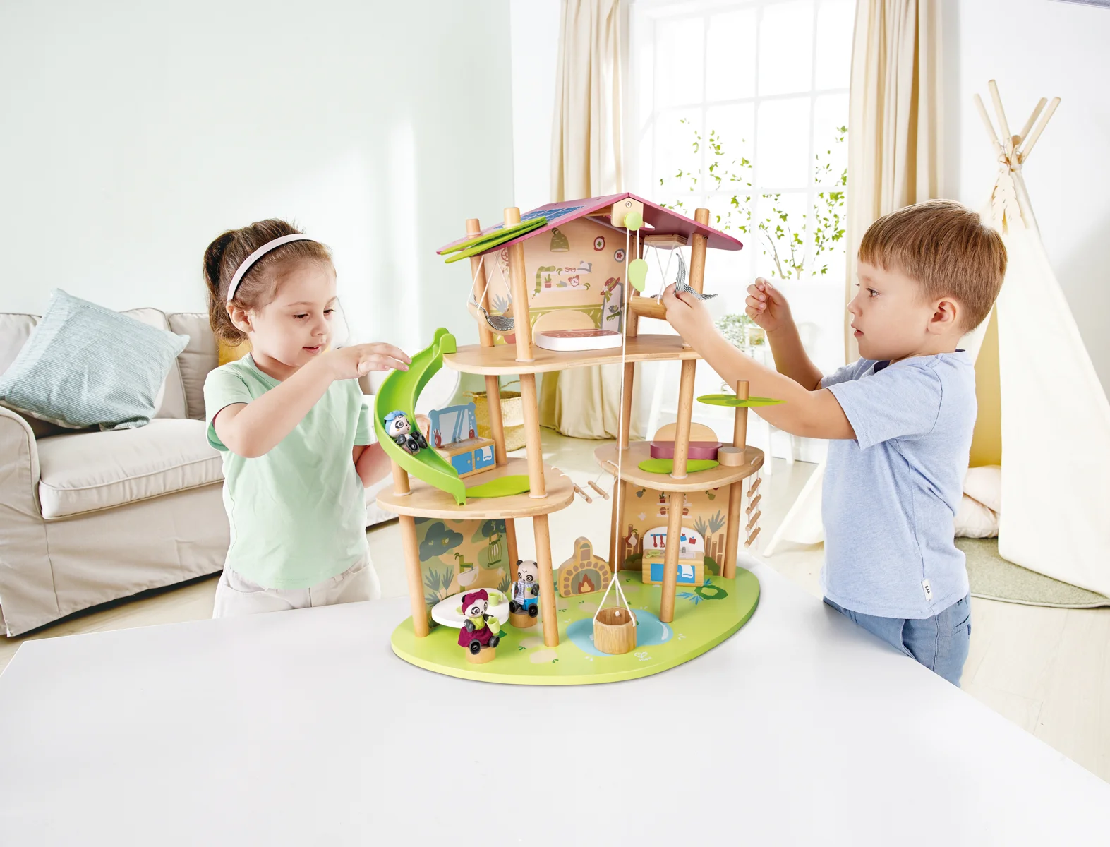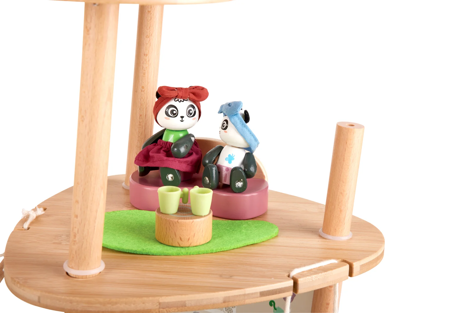 Bambusový domeček pro pandy. Tato sada z kolekce Green Planet Explorers je vyrobena z udržitelného bambusu a nabízí spoustu herních prvků – najdete v ní krb, houpací sítě, provazový žebřík, a dokonce i výtah. Společně s rodinkou čtyř pand strávíte nekonečné hodiny objevováním světa plného dobrodružství – a zároveň se zábavnou formou naučíte něco o udržitelnosti, když budete s pandí rodinou prozkoumávat divokou přírodu. Hračka podporuje rozvoj jemné motoriky, fantazie, kreativity, sociálních dovedností, a především znalostí o principech udržitelnosti. Sada obsahuje: domeček, čtyři figurky pandy, dvě houpací sítě, postel, toaletní stolek, pohovku, čajový stolek, dvě podlahové rohože, slunečník, stůl se dvěma pařezovými sedáky, krb, kamna, dva talíře, dva šálky, pánev, výtahový koš na provázku, visutý most, skluzavku a provazový žebřík. Domeček a postavy jsou vyrobeny z udržitelných materiálů, včetně bambusu, zeleného PE plastu a dřeva s certifikací FSC. Rozměry domečku: 61,2 x 59,4 x 34 cm. Rozměry balení: 60 x 61 x 10 cm. Věk: 4+
