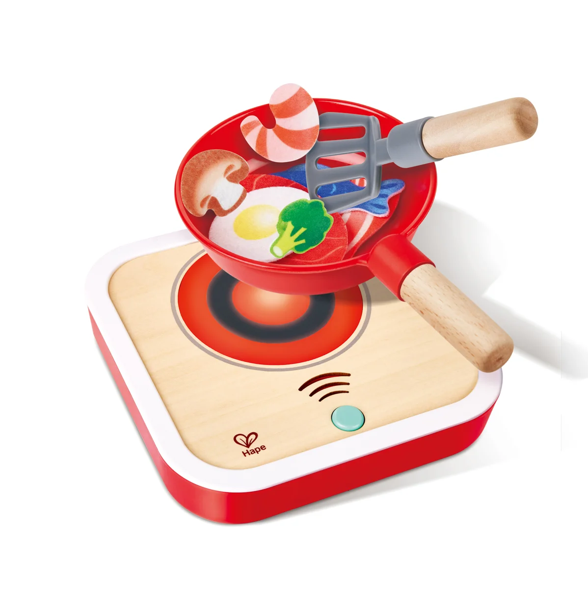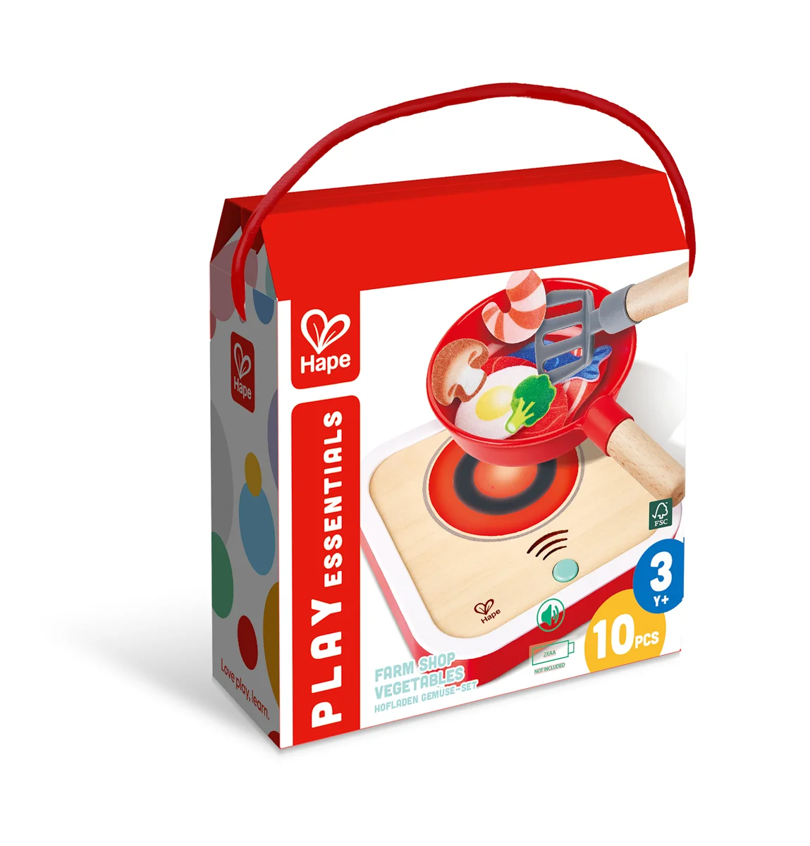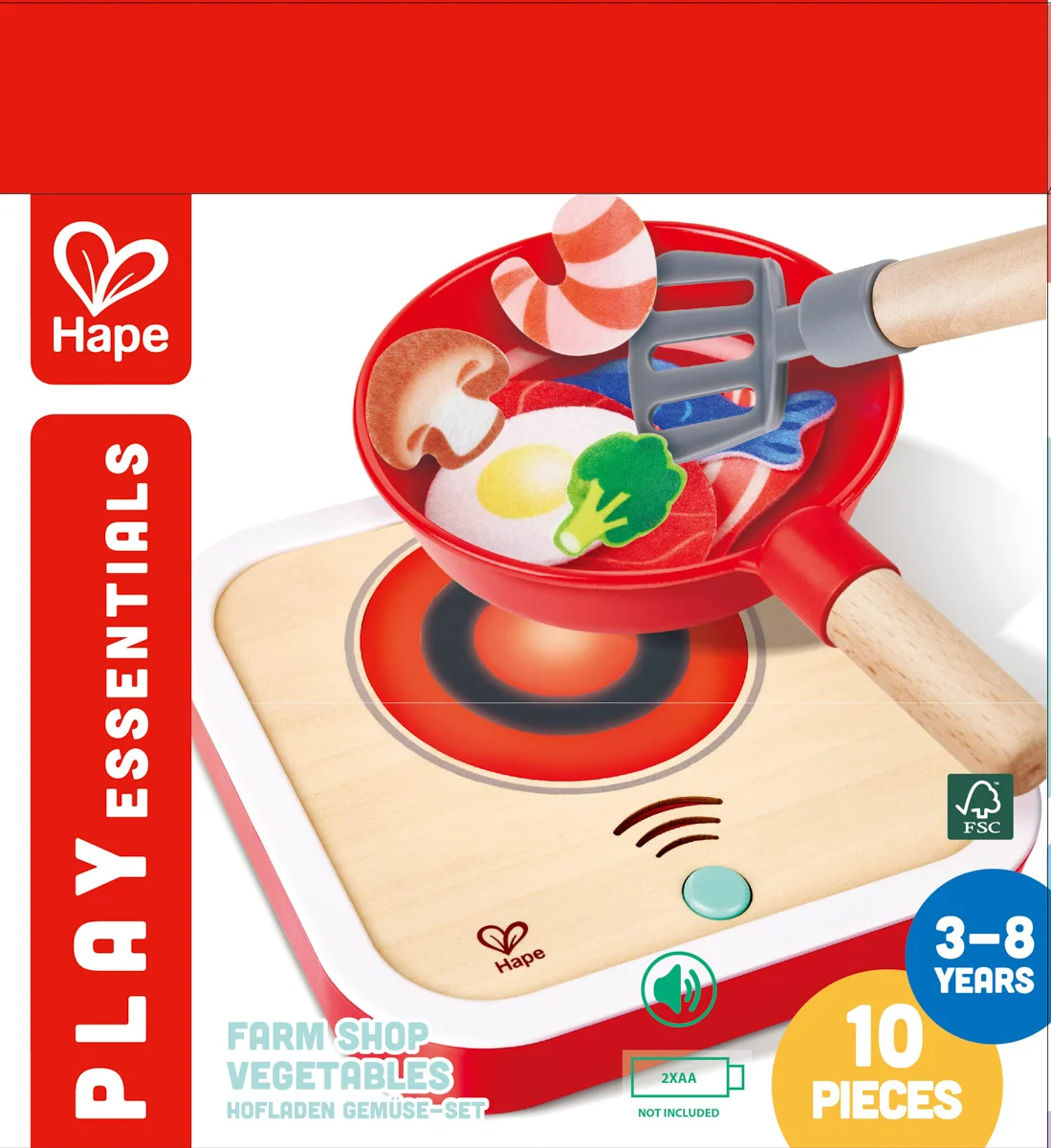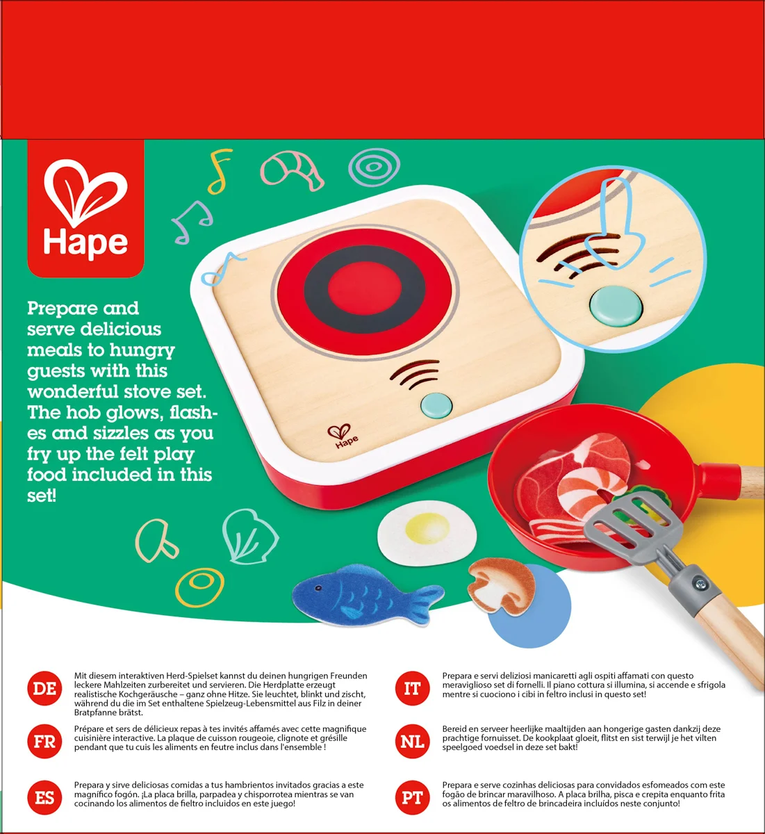 Hape Interaktivní sporák se světlem a zvukem. Dřevěná kuchyňská sada na hraní vaření s realistickými efekty. Součástí je 7dílné příslušenství z plsti – potraviny a doplňky, které obohatí dětskou hru na kuchaře. Skvělá hračka pro nápodobu skutečného vaření, podporující fantazii a tvořivost. Stiskněte tlačítko na vařiči a spusťte blikající světelné a syčící zvukové efekty. Automaticky se zastaví po 10 sekundách. Obsah sady: Vařič se světelnými zvukovými efekty, pánev, špachtle a sedm kousků plstěného jídla plstěného jídla – steak, slanina, kreveta, ryba, vejce, houba a brokolice. Díky robustní dřevěné konstrukci je hračka odolná a vaše dítě si ji zamiluje po mnoho let. Baterie: 2 x AA, nejsou součástí. Rozměry produktu: 21x 3,9 x 23 cm. Rozměry balení: 23,7 x 22,1 x 8,2 cm. Věk: 3+