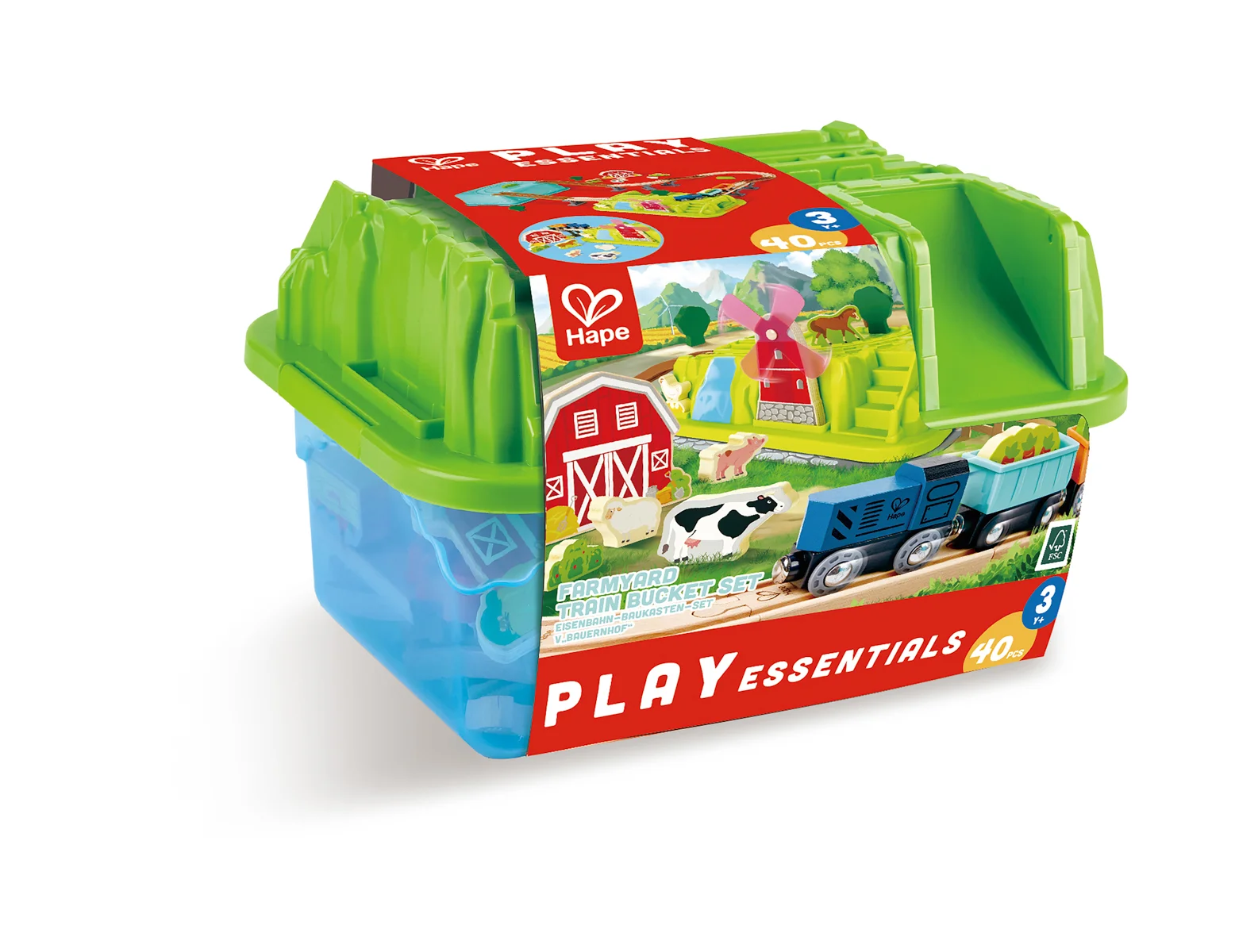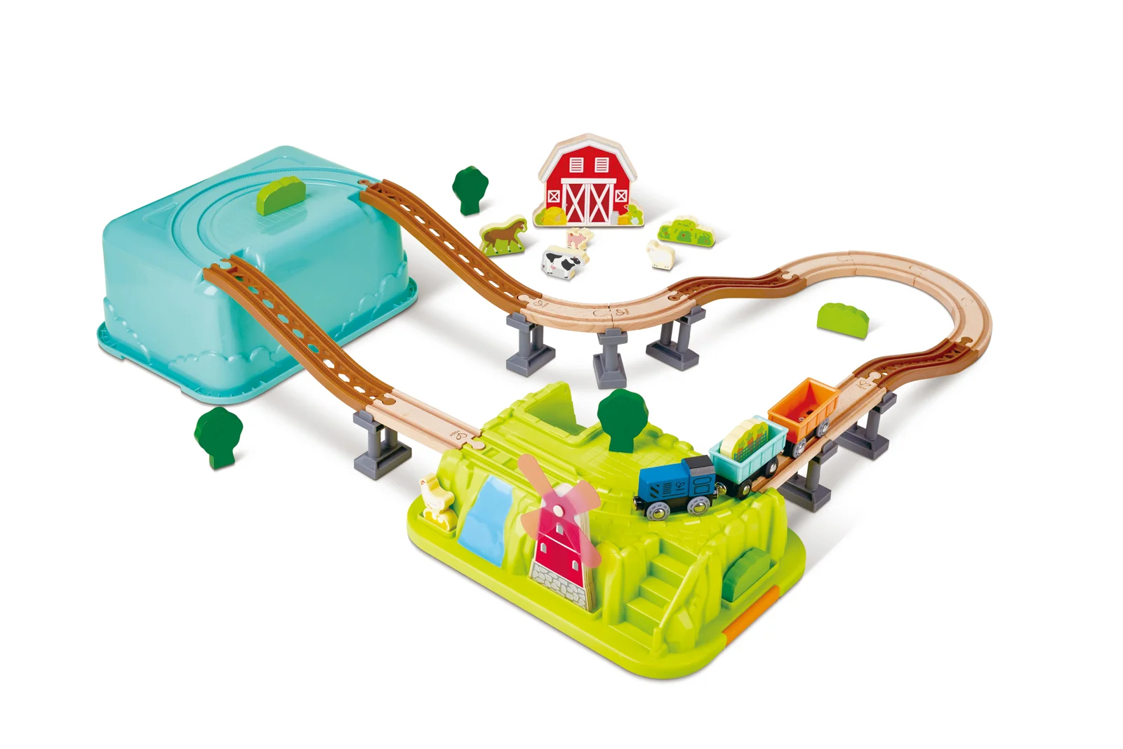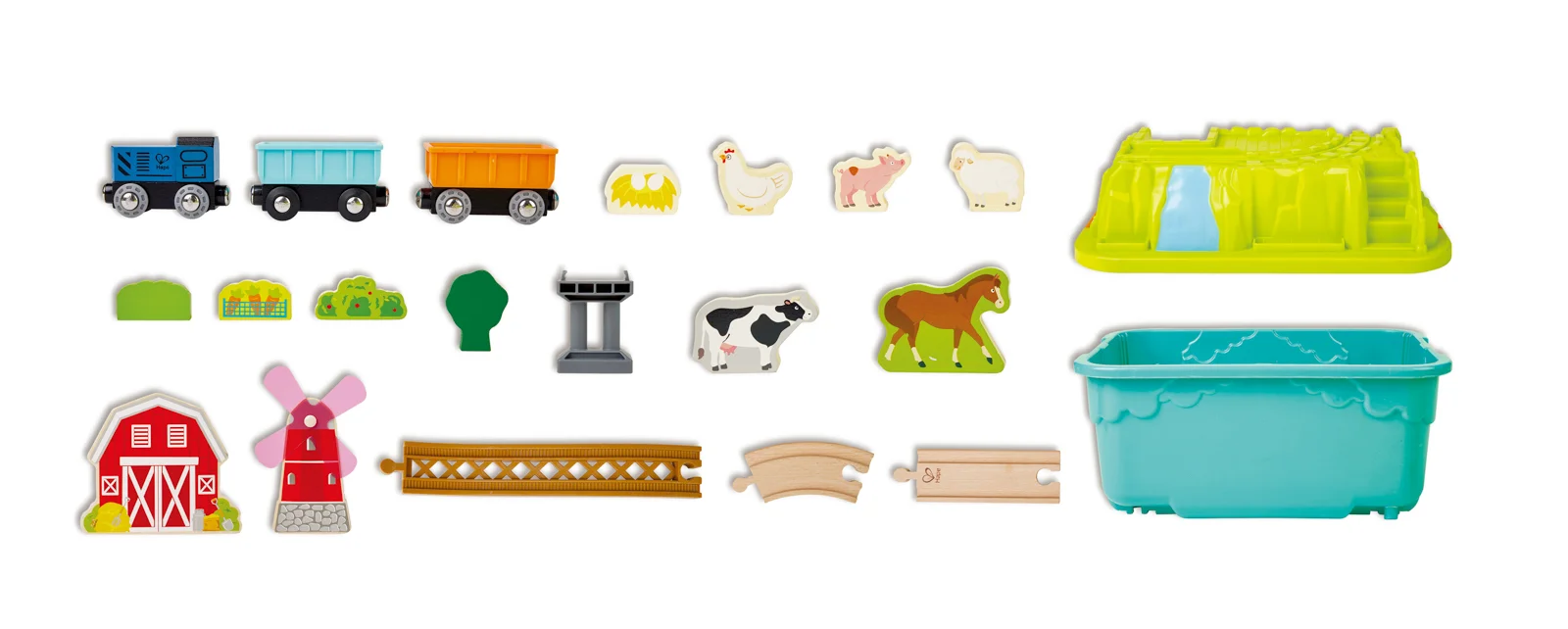 Tato sada představuje miniaturní venkovský život v a umožňuje dětem hravou formou poznat život na vesnici. K tomu slouží lokomotiva, nákladní vagóny pro přepravu zvířat a sena, figurky zvířat a další užitečné doplňky. Dvůr farmy je znázorněn stoupáními, klesáními, mlýnem a stodolou. Mezi zvířaty najdete prasátko, krávu, koně, ovci a slepici s vejci. Nechybí ani malé stromy a zeleninové záhonky uvnitř dvora. Po hře lze díly uložit do boxu, který se po otočení vzhůru nohama stane součástí herní scenérie. Sada rozvíjí fantazii, sociální dovednosti i spolupráci, při stavění tratě učí samostatnosti. Koleje jsou kompatibilní s vláčky Hape a Brio. Vyrobeno z bezpečných, hypoalergenních materiálů. Počet dílků: 40 ks. Rozměry balení: 23,5 x 21,5 x 33,5 cm. Věk: 3+