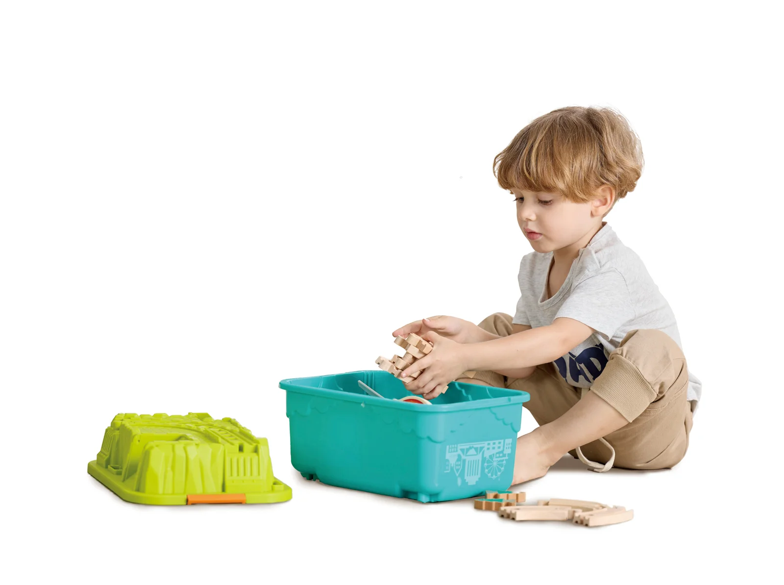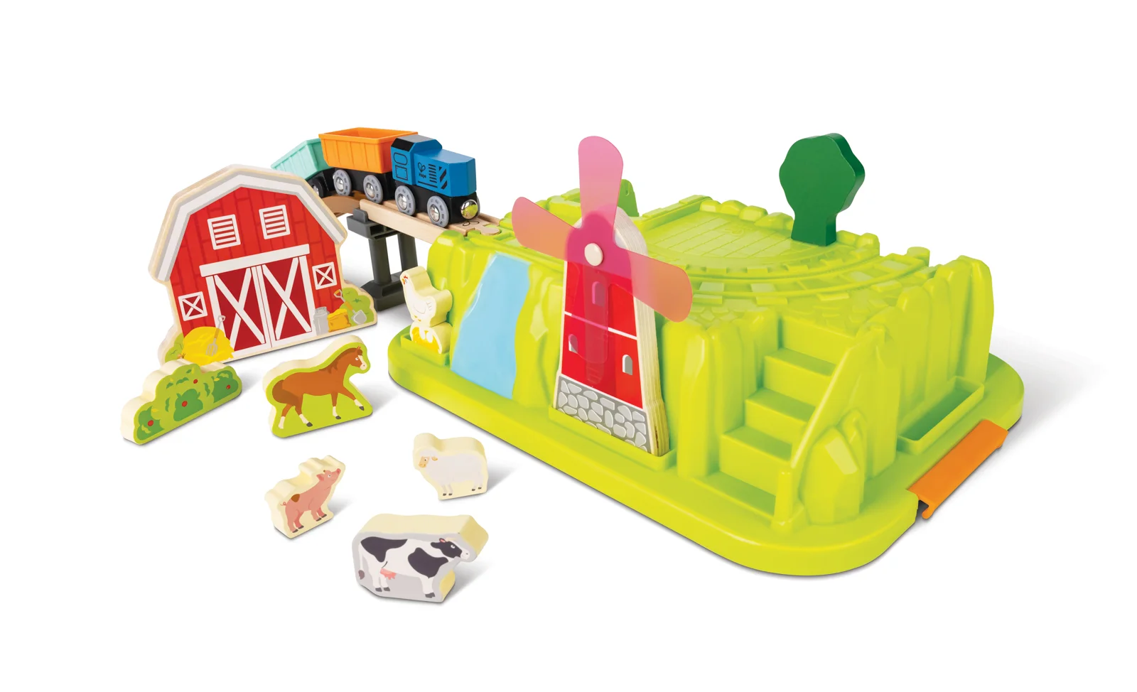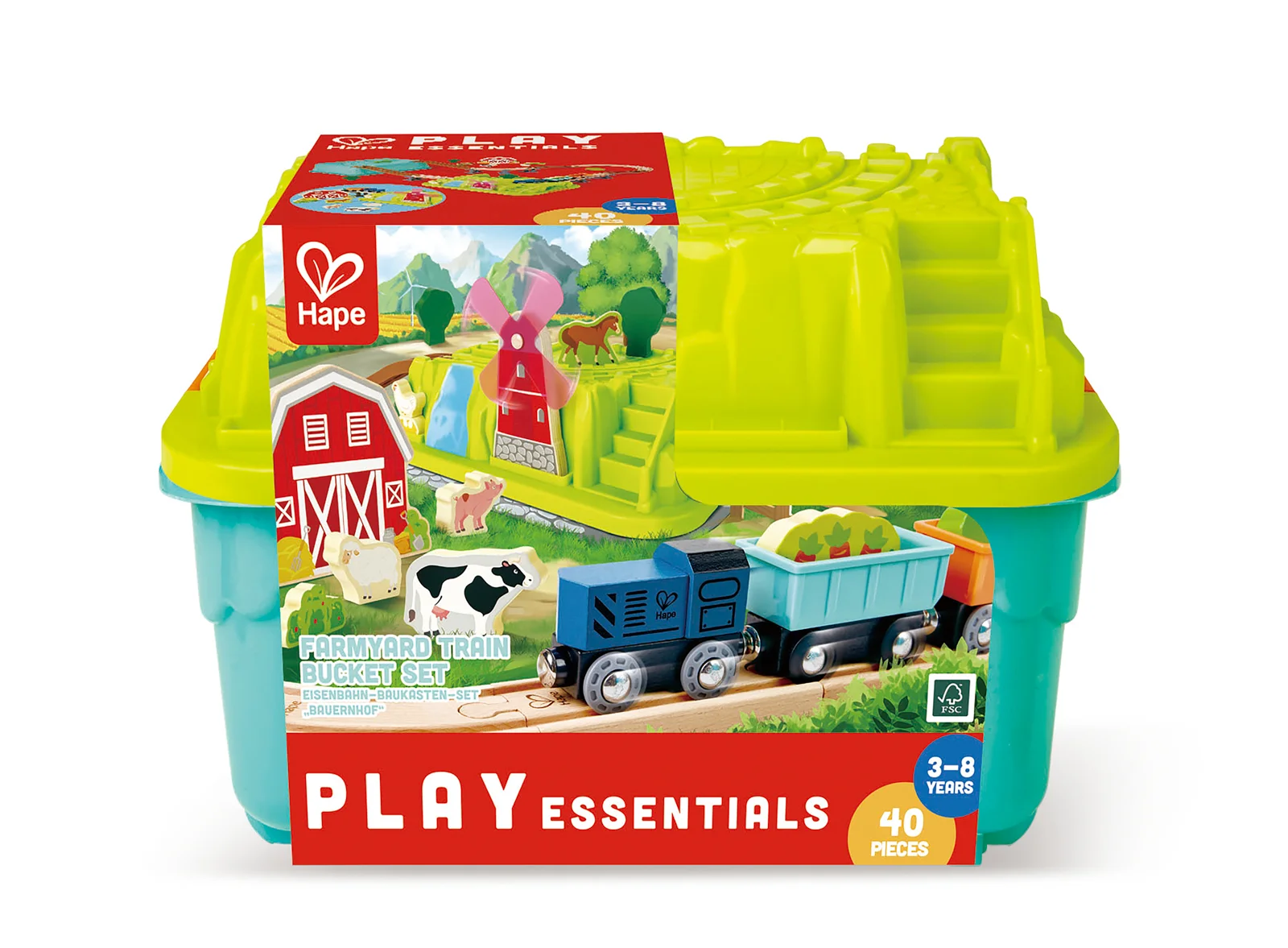 Tato sada představuje miniaturní venkovský život v a umožňuje dětem hravou formou poznat život na vesnici. K tomu slouží lokomotiva, nákladní vagóny pro přepravu zvířat a sena, figurky zvířat a další užitečné doplňky. Dvůr farmy je znázorněn stoupáními, klesáními, mlýnem a stodolou. Mezi zvířaty najdete prasátko, krávu, koně, ovci a slepici s vejci. Nechybí ani malé stromy a zeleninové záhonky uvnitř dvora. Po hře lze díly uložit do boxu, který se po otočení vzhůru nohama stane součástí herní scenérie. Sada rozvíjí fantazii, sociální dovednosti i spolupráci, při stavění tratě učí samostatnosti. Koleje jsou kompatibilní s vláčky Hape a Brio. Vyrobeno z bezpečných, hypoalergenních materiálů. Počet dílků: 40 ks. Rozměry balení: 23,5 x 21,5 x 33,5 cm. Věk: 3+