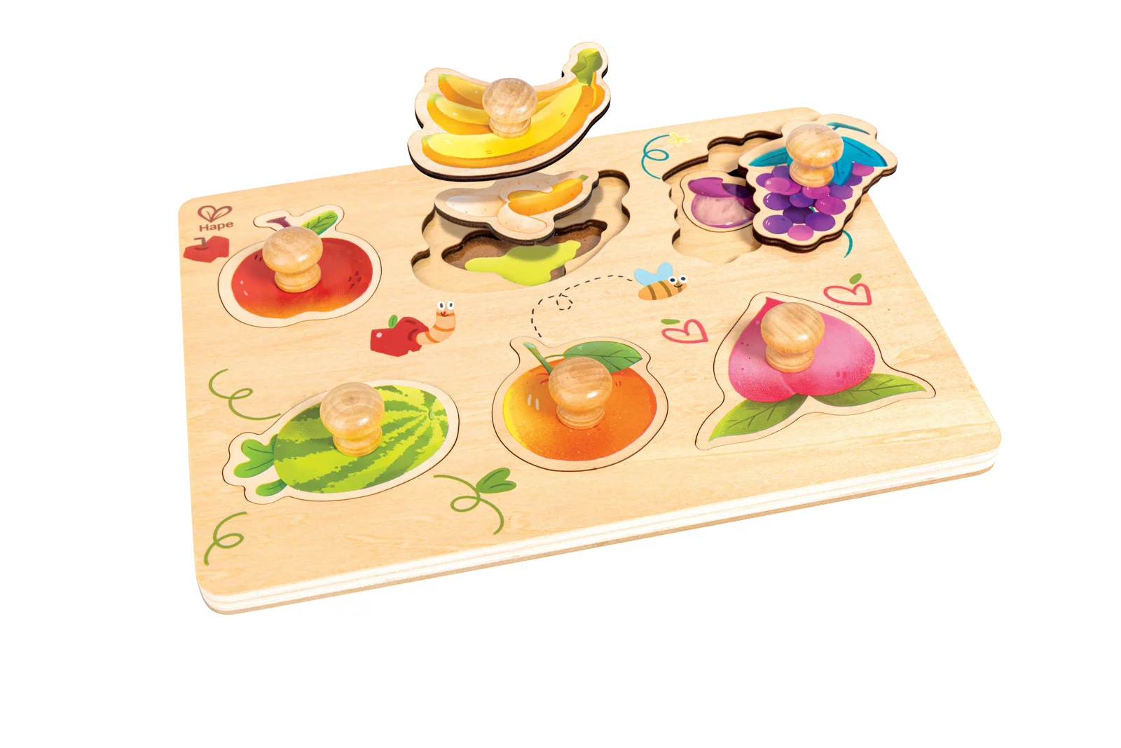 S veselým dřevěným puzzle Hape Fruity Layer objeví vaše batole hravou formou všechny druhy ovoce. Puzzle má dvě vrstvy, což nabízí dvojnásobnou zábavu a pokaždé nové překvapení. Pevné dřevo a barevné ilustrace ho činí pro malé ručičky ještě atraktivnějším. Puzzle Fruity Layer stimuluje jemnou motoriku, koordinaci rukou a očí a schopnost řešit problémy. Díky úchytům mohou malé děti dílky snadno uchopit a umístit. Tímto způsobem se učí rozpoznávat tvary a seznamují se s názvy a barvami ovoce. Obsahuje 12 dílků. Rozměry balení: 28 x 29,5 x 3,5 cm. Věk: 2+