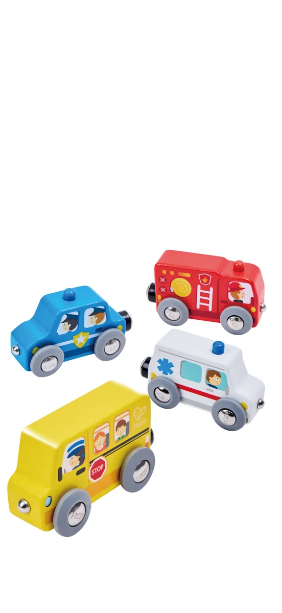 Sada městských vozidel 4 v 1. Prozkoumejte barvy a typy vozidel. V sadě najdete žlutý školní autobus, červený hasičský vůz, modré policejní auto a bílou ambulanci. Vozidla jsou kompatibilní se všemi vláčkovými sadami Hape a díky magnetům je můžete zapojit do jakékoliv vlakové soupravy. Vyrobeno z kvalitního FSC dřeva. Rozměry balení: 12 x 36 x 3,8 cm. Věk: 18 m+