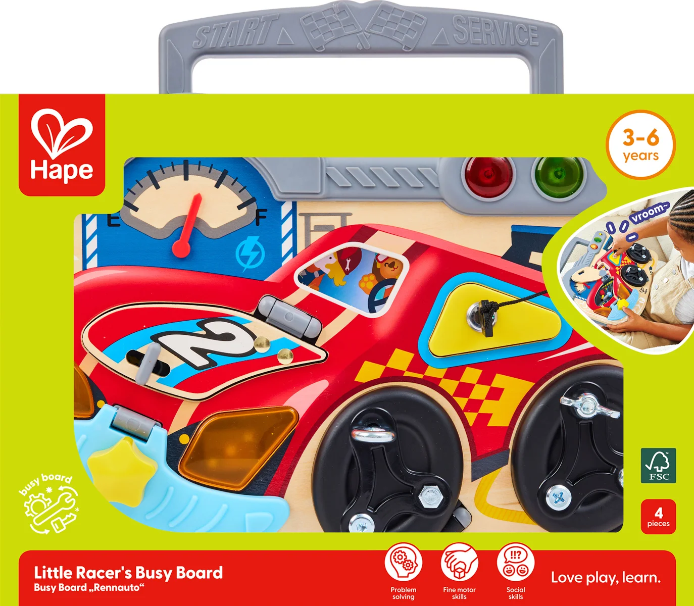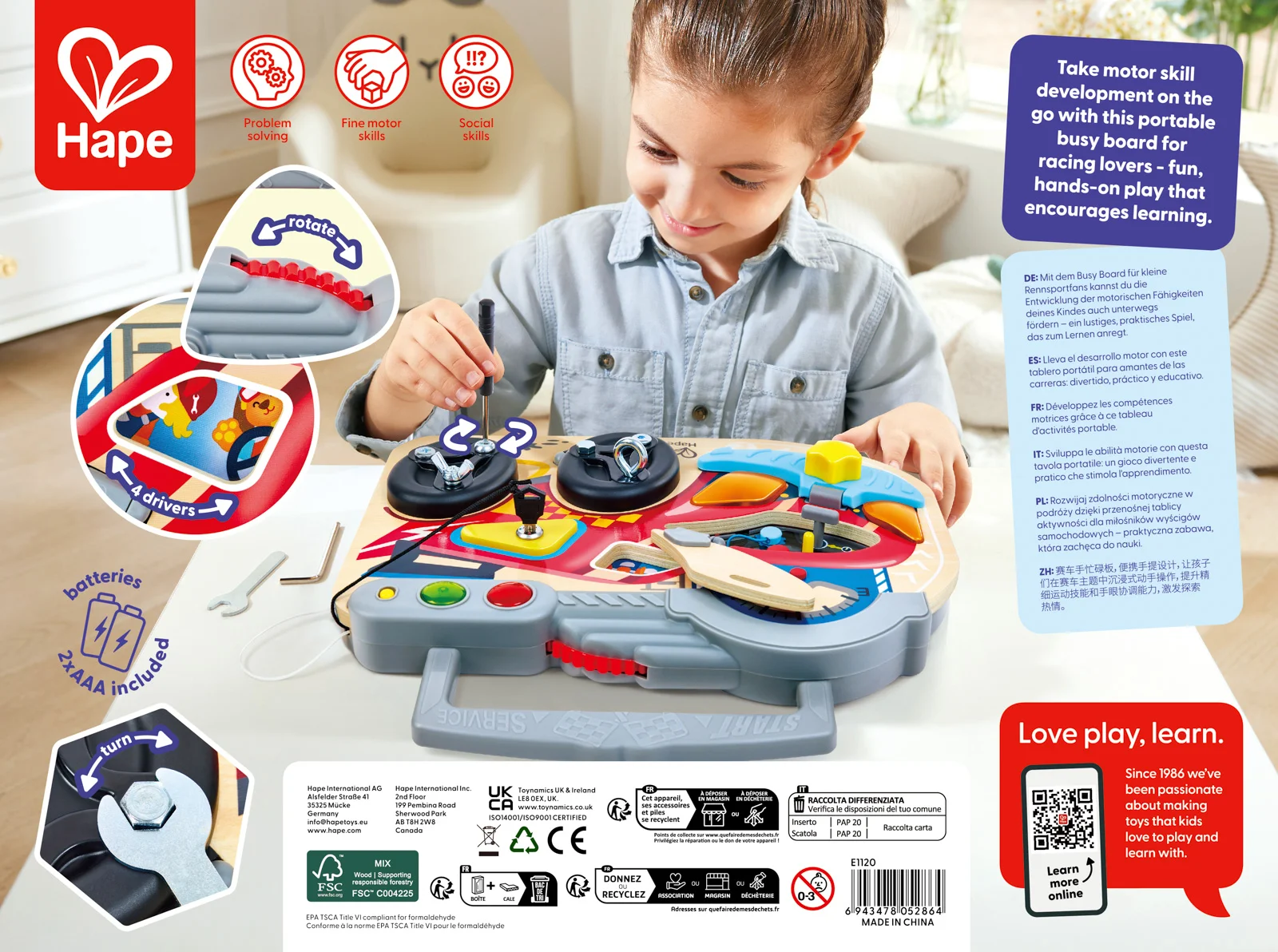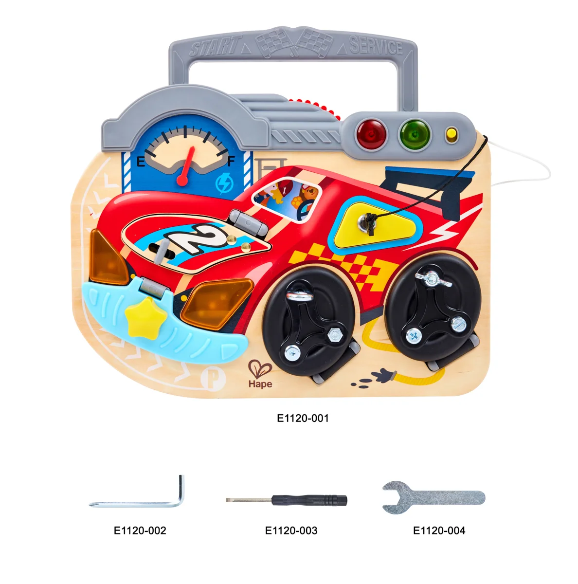 Interaktivní hrací deska pro malé fanoušky závodních aut. Hračka podporuje rozvoj motoriky dítěte – zábavná a praktická hra, která inspiruje k učení. Vaše dítě bude moci šroubovat, nebo utahovat šrouby a matice. Interaktivní kapota ukazuje princip příčiny a následku. Barevná světla a zvuky dělají hru ještě napínavější. Díky simulaci semaforu se děti seznámí se základními pravidly provozu. Odnímatelný nárazník zase vybízí k nápadité hře a přináší ještě více zábavy. Aktivity, které si děti vyzkouší jsou přepínání, otáčení, otevírání, posouvání, nebo zapojení. Interaktivní hrací deska je přenosná, vzdělávací a ideální na cesty – poskytne dětem hodiny zábavy a podpoří rozvoj motoriky, sociálních dovedností a nauky řešení problémů. Rozměry balení: 24 x 32,5 x 4,5 cm. Věk: 3+