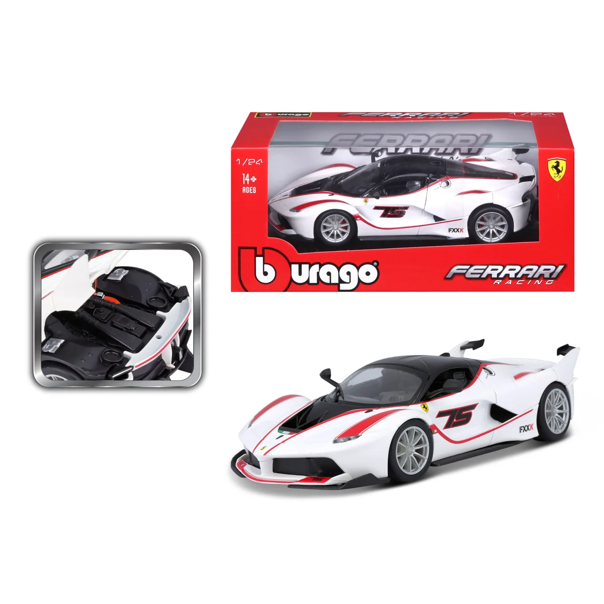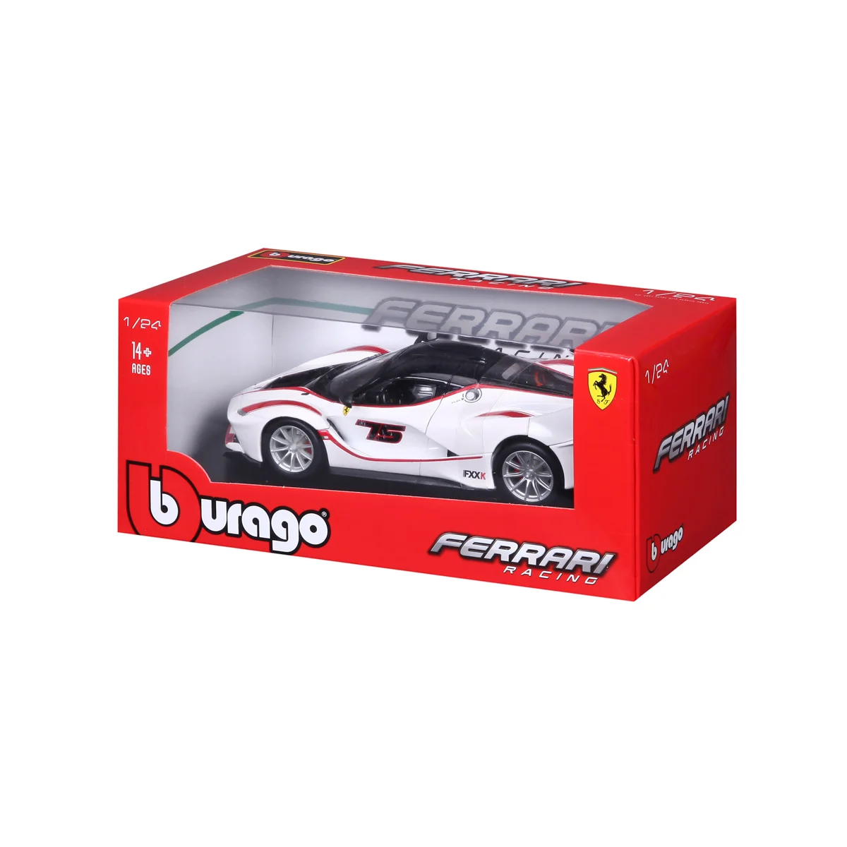 Modely závodních automobilů Ferrari v měřítku 1:24 z kolekce RACING jsou sbírkou krásného designu s vysokým důrazem na přesnost detailů. Modely jsou vyrobeny z litého kovu s plastovými detaily. Detailní provedení motorových prostor a interiéru. Většina modelů z kolekce má otevírací dveře, kufr nebo kapotu. Některé z modelů mají funkční řízení. Každý z modelů je v závodním designu a se závodním číslem Model je namontován na výstavním stojánku. Baleno v krabičce. Nevhodné pro děti do 3 let. Rozměry balení: 10,3 x 24,5 x 12,6 cm. Věk: 14+