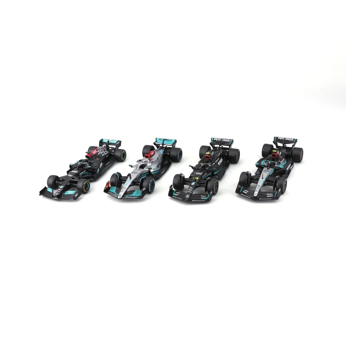 Bburago 1:43 FORMULA RACING F1 4 Pack – Mercedes-AMG Petronas, #44 L.Hamilton + #63 G.Russell