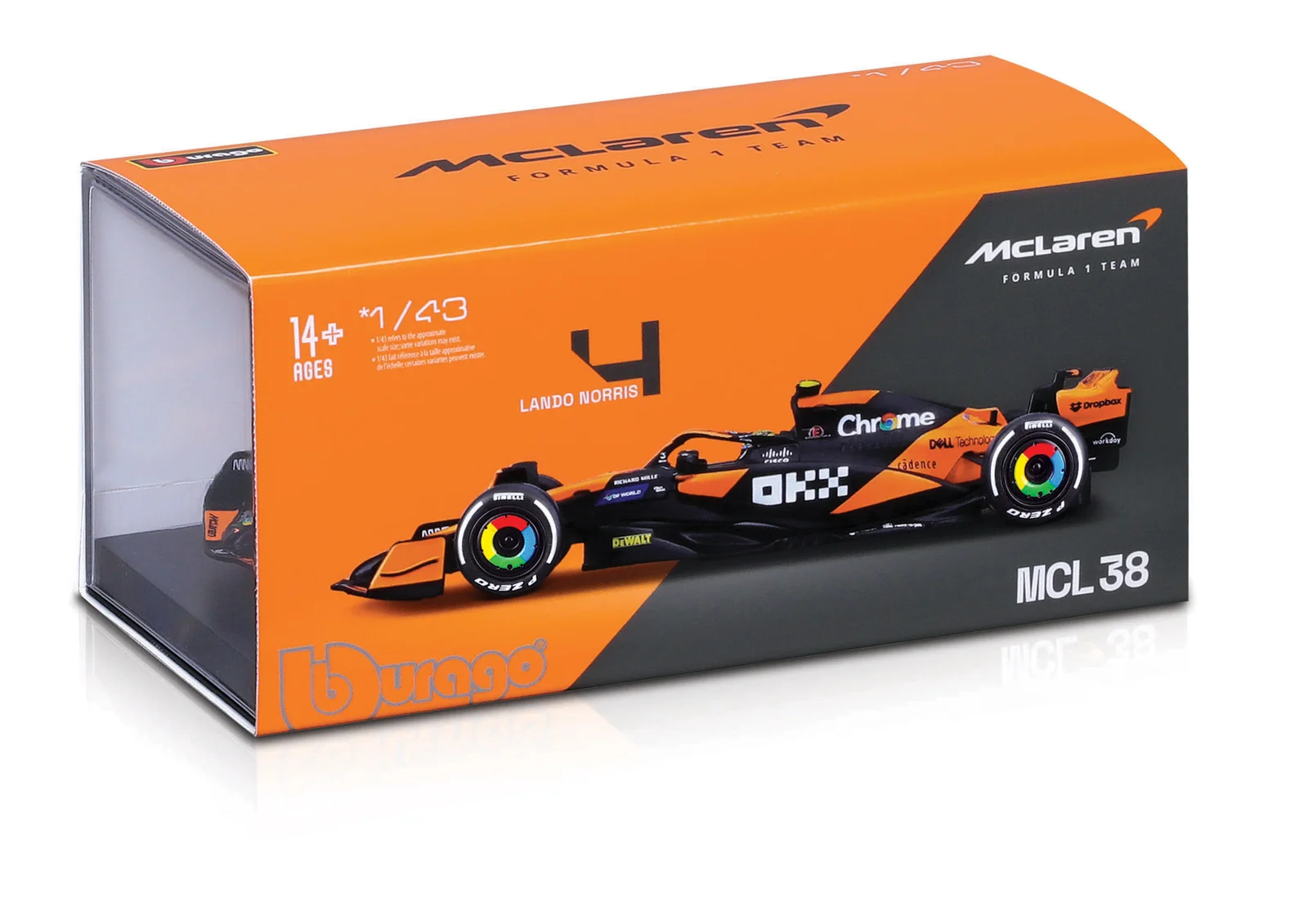 Bburago 1:43 RACE Formula F1 - McLaren F1 Team MCL38 (2024) #4 (Lando Norris) - with drive