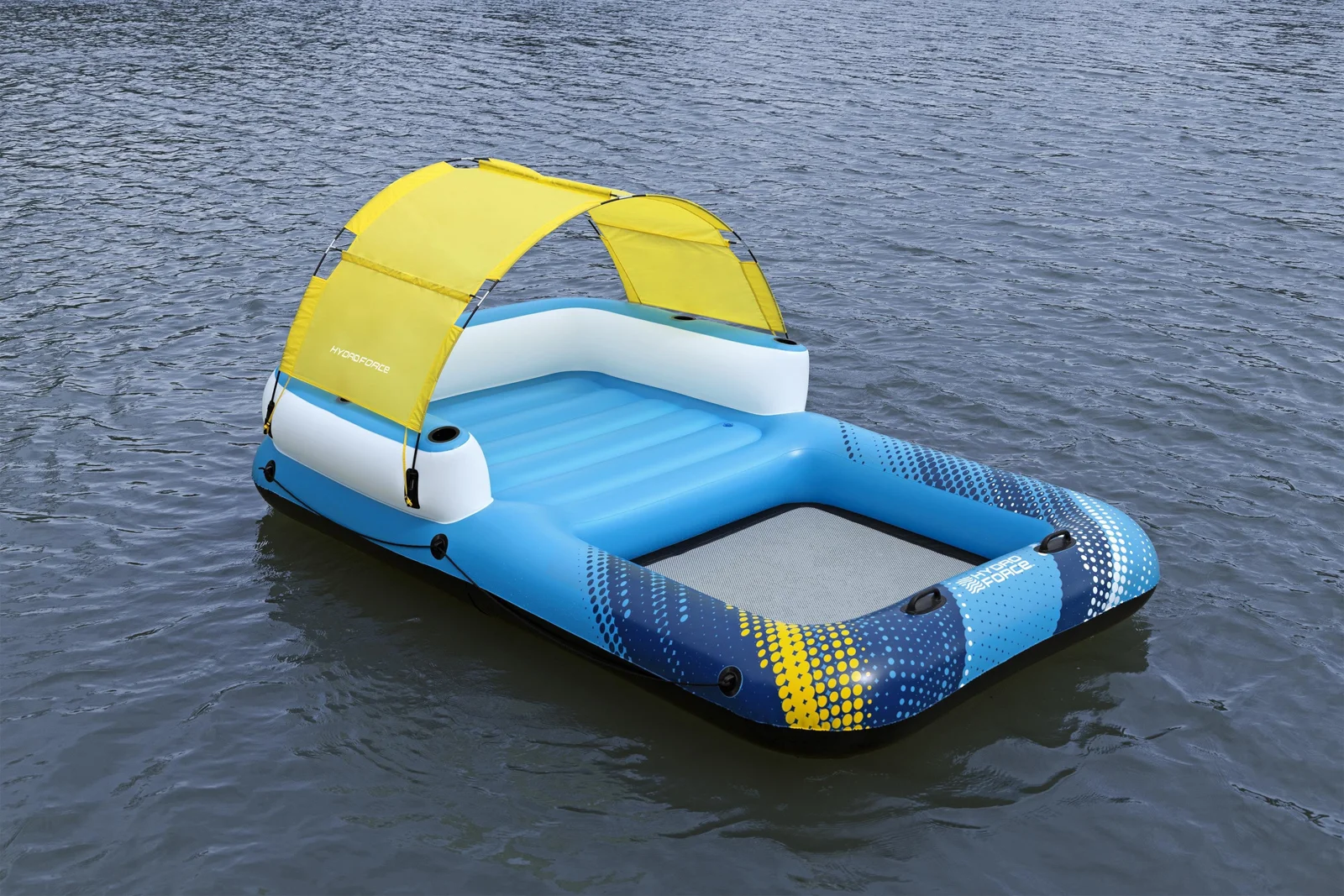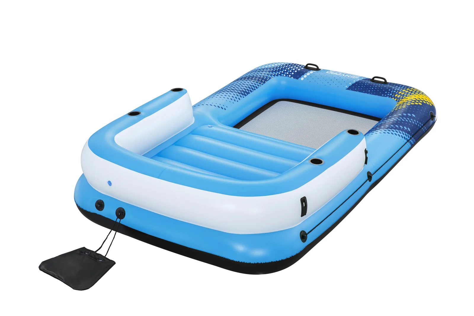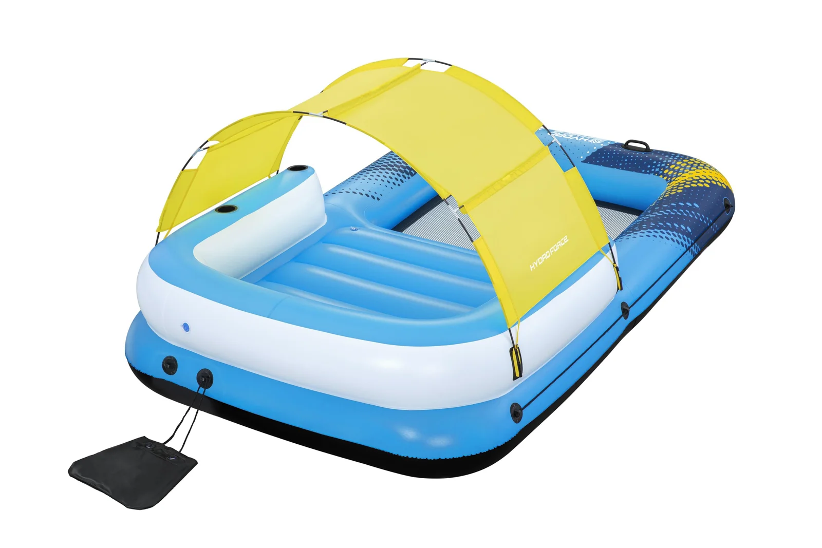 VíceSplň si sen o dokonalém letním odpočinku na vodě s nafukovacím ostrovem Hydro-Force™ Summer Oasis™. Tento prostorný plovoucí ostrov se třemi vzduchovými komorami je ideální pro relaxaci s rodinou nebo přáteli a nabízí dostatek místa až pro až 4 osoby. Je vyroben z odolného materiálu Inflata-Shield™, který pomáhá předcházet propíchnutí, minimalizuje nadměrné roztahování a zajišťuje dlouhou životnost i stabilitu na vodě. Speciální Color Shield™ povrchová úprava navíc pomáhá předcházet blednutí barev a přenosu barvy z povrchu. Pro maximální pohodlí je ostrov vybaven extra velkými opěrkami zad, odnímatelnou stříškou proti slunci. Ostrov disponuje chladivou síťovanou plochou, nechybí čtyři držáky na nápoje, pevná madla a bezpečnostní lana pro snadnou manipulaci. Rozměry po nafouknutí: 58 x 186 x 305 cm. Rozměry před nafouknutím: 198 x 320 cm. Maximální nosnost: 400 kg. Kapacita: až 4 osob. Součástí balení je opravná záplata a taška na kotvy. Materiál: PVC, skelné vlákno, ABS plast, polyester, polypropylen (PP), BET plast, pozinkované železo a další materiály. Rozměry balení: 40 x 48 x 22,5 cm.