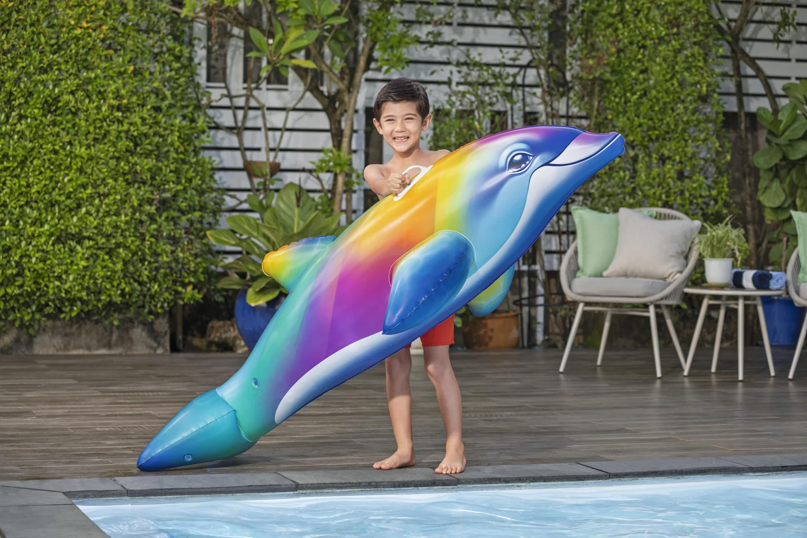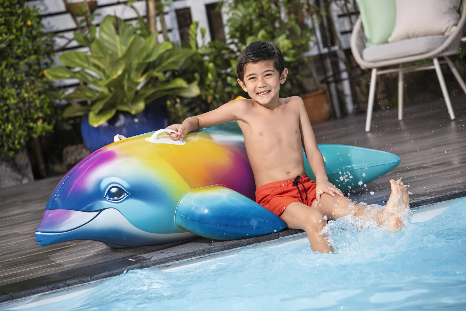 VíceDětské nafukovací plavidlo v podobě duhového delfína je perfektní pro malé dobrodruhy od 3 let. Jeho robustní konstrukce z odolného PVC materiálu zaručuje, že vydrží hodiny vodních radovánek. Díky dvěma vzduchovým komorám poskytuje na vodě větší bezpečnost a stabilitu. Pevná madla zajišťují, že se děti mohou při jízdě bezpečně držet a užívat si své vodní dobrodružství s jistotou a stabilní oporou. Dětské plavidlo Dolphin Daydream™ má povrchovou úpravu Color Shield™, která zabraňuje vyblednutí a změně barvy povrchu. Nafouknutá velikost delfína: 46 x 84 x 173 cm. Nenafouknutá velikost delfína: 168 x 66 cm. Rozměry balení: 24 x 24 x 5,5 cm. Určeno pro 1 osobu. Max. nosnost: 45 kg. Používejte pouze pod dohledem dospělé osoby a ve vodě, kde dítě dosáhne na dno. Věk: 3+