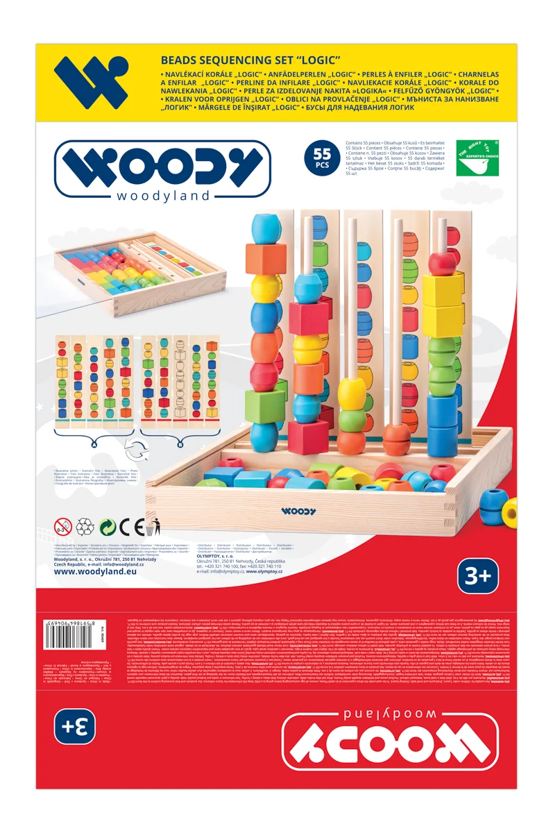 Dítě dle předlohy nakreslené na dřevěných destičkách navléká na tyčku barevné korále tak, aby odpovídaly předloze. Rozhodující zde je barva, tvar a pořadí korálků. | Věk: 3+ | Rozměr: 32 x 33 x 5cm | Počet ks: 55 | Správná hračka roku 2006