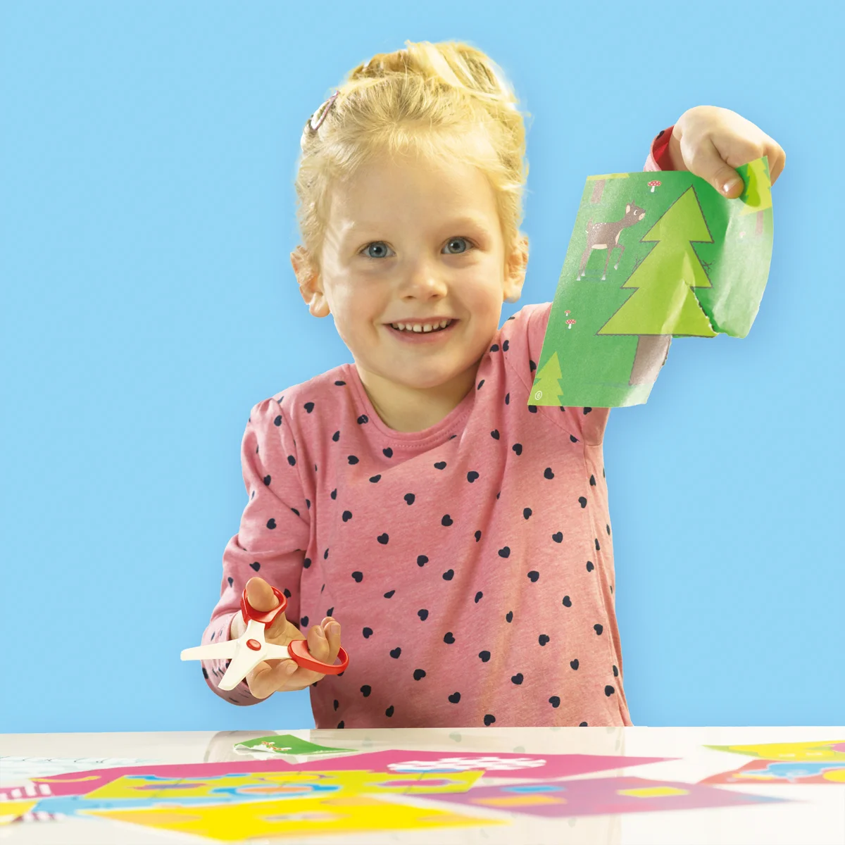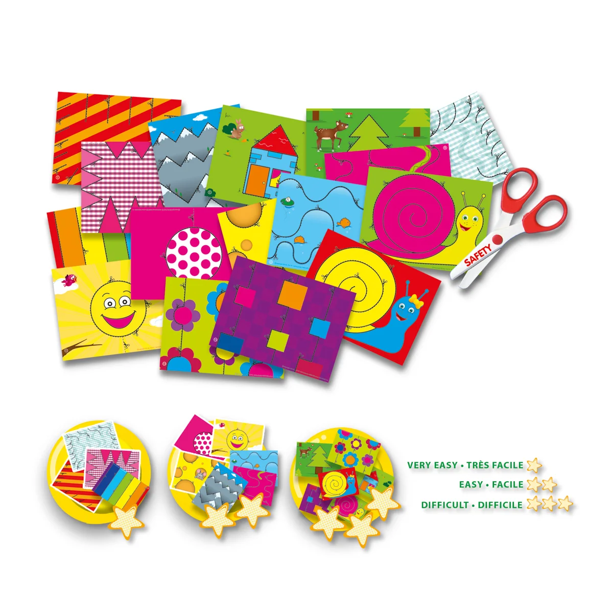 Učím se používat nůžky – sada se kterou je stříhání bezpečné a zábavné. Tato speciálně vyvinutá sada pomáhá malým dětem získat první zkušenosti se stříháním zodpovědným způsobem. Díky bezpečnostním nůžkám, které stříhají pouze papír, a veselým vystřihovánkám děti krok za krokem objevují, jak zábavné může být tvoření. Obsah sady: 1 bezpečnostní dětské nůžky, 16 listů barevných vystřihovánek. Baleno v krabičce. Rozměry balení: 20 x 20 x 4 cm. Věk: 3+