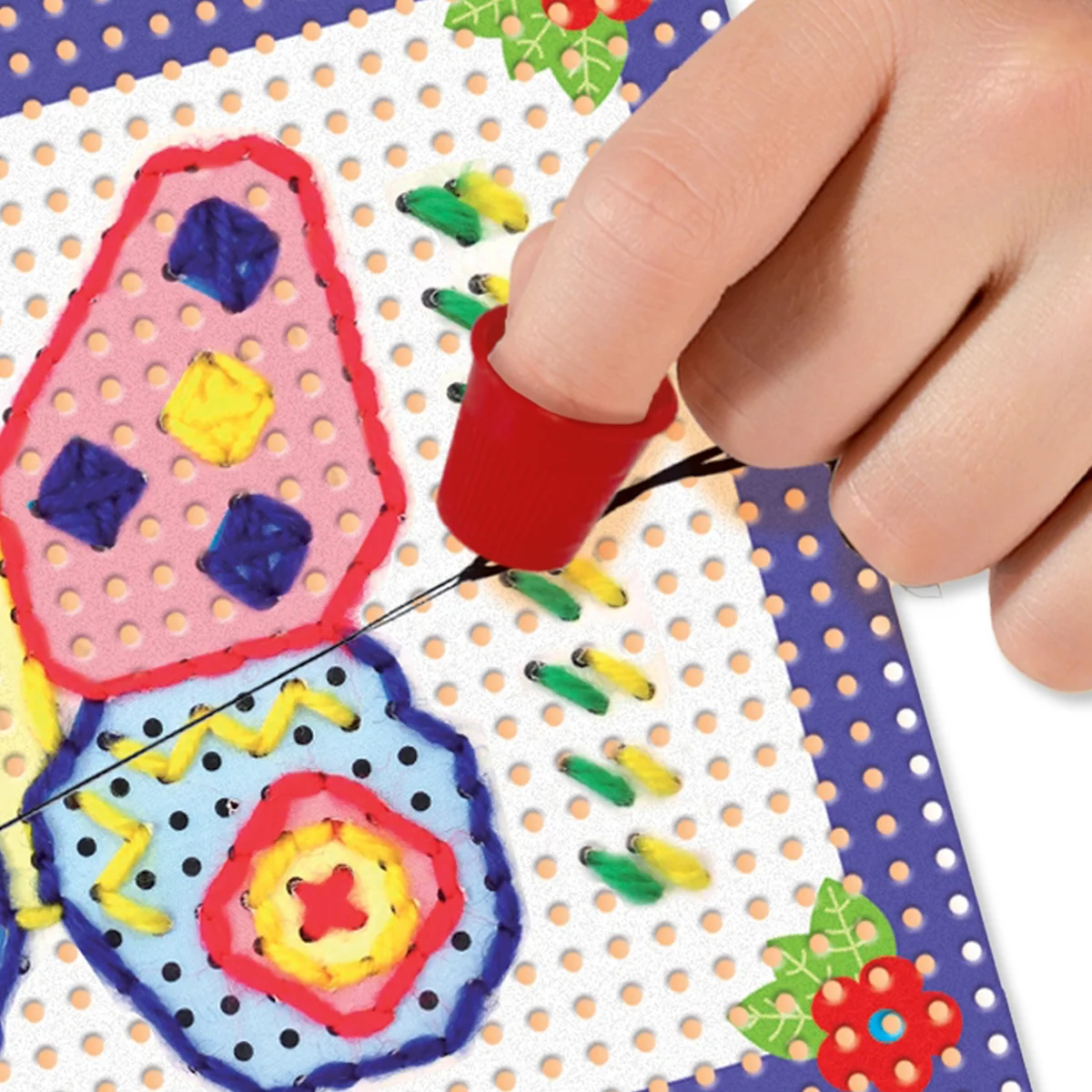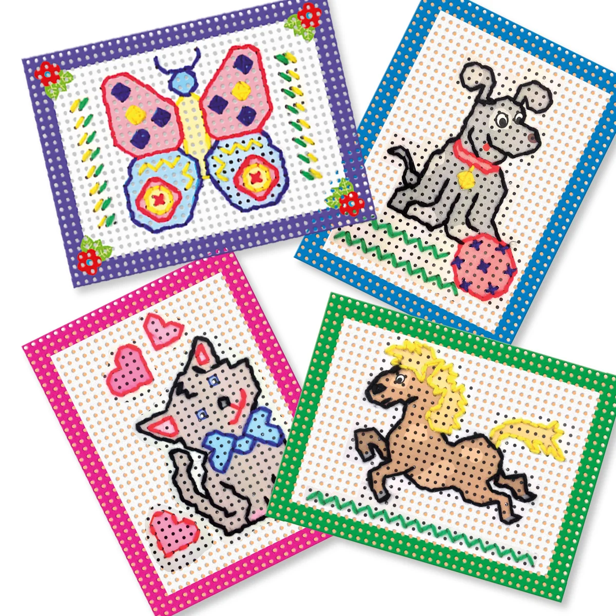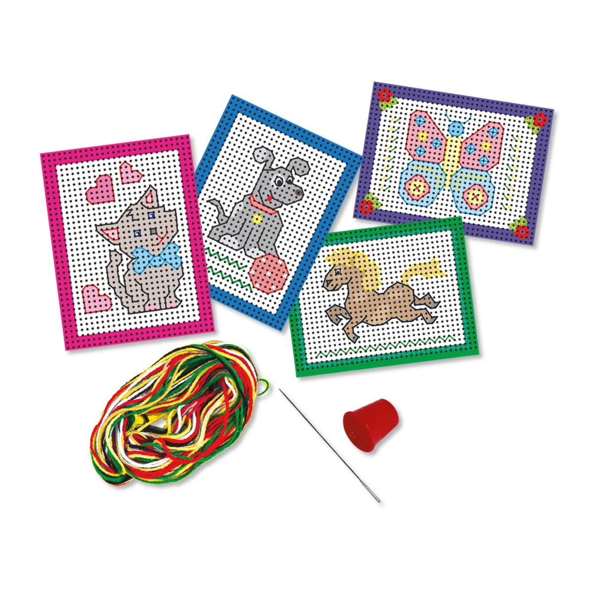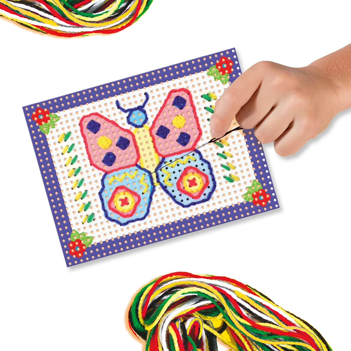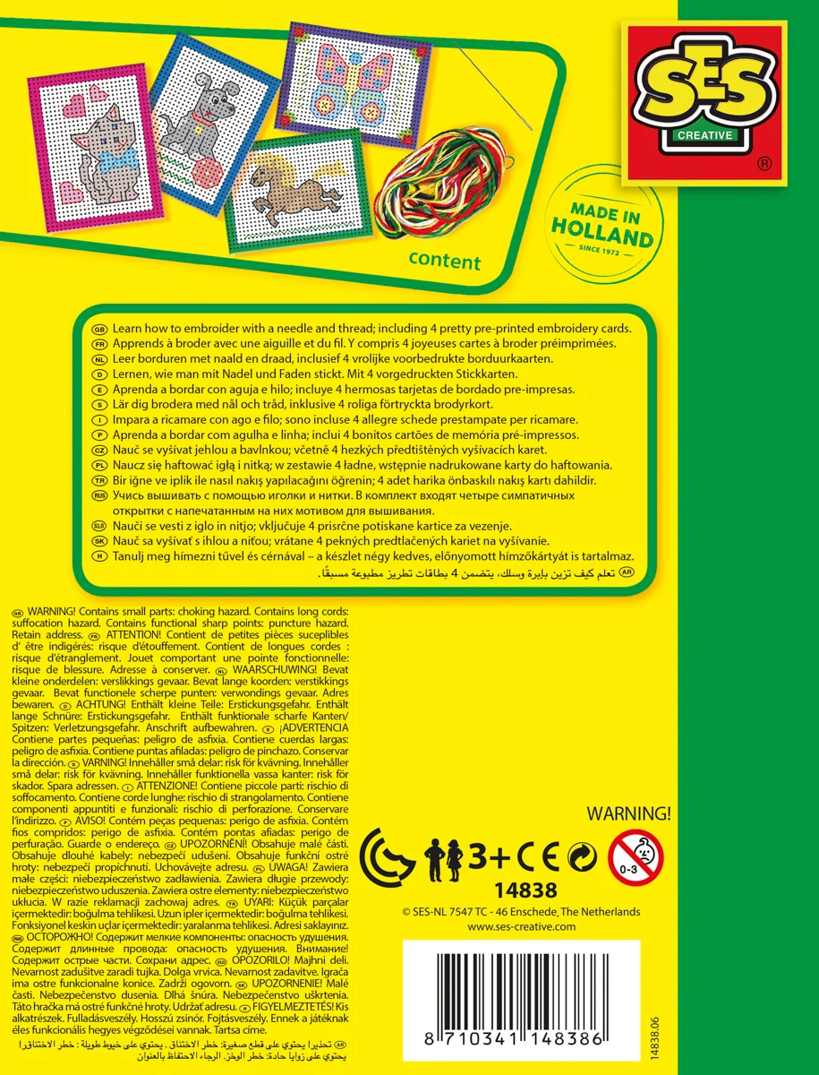 Sada – Učím se vyšívat naučí děti pracovat s jehlou a nití. Pomocí přiložených vyšívacích karet si mohou vytvořit veselé a barevné obrázky – kočku, motýla, koně a psa. Karty jsou předtištěné a perforované, což usnadňuje vyšívání a zajišťuje bezpečné provlékání jehly. Bezpečná tupá jehla umožňuje snadné provlékání vlny otvory. Vyšívací karty jsou vyrobeny z pevného kartonu, který dobře drží tvar a vydrží i delší používání. Obsah sady: 4x předtištěná vyšívací karta s perforací, 1x jehla, 1x náprstek, 5x barevná příze – černá, červená, modrá, žlutá a zelená. Baleno v krabičce. Rozměry balení: 20 x 15 x 4 cm. Nevhodné pro děti do 3 let. Věk: 3+
